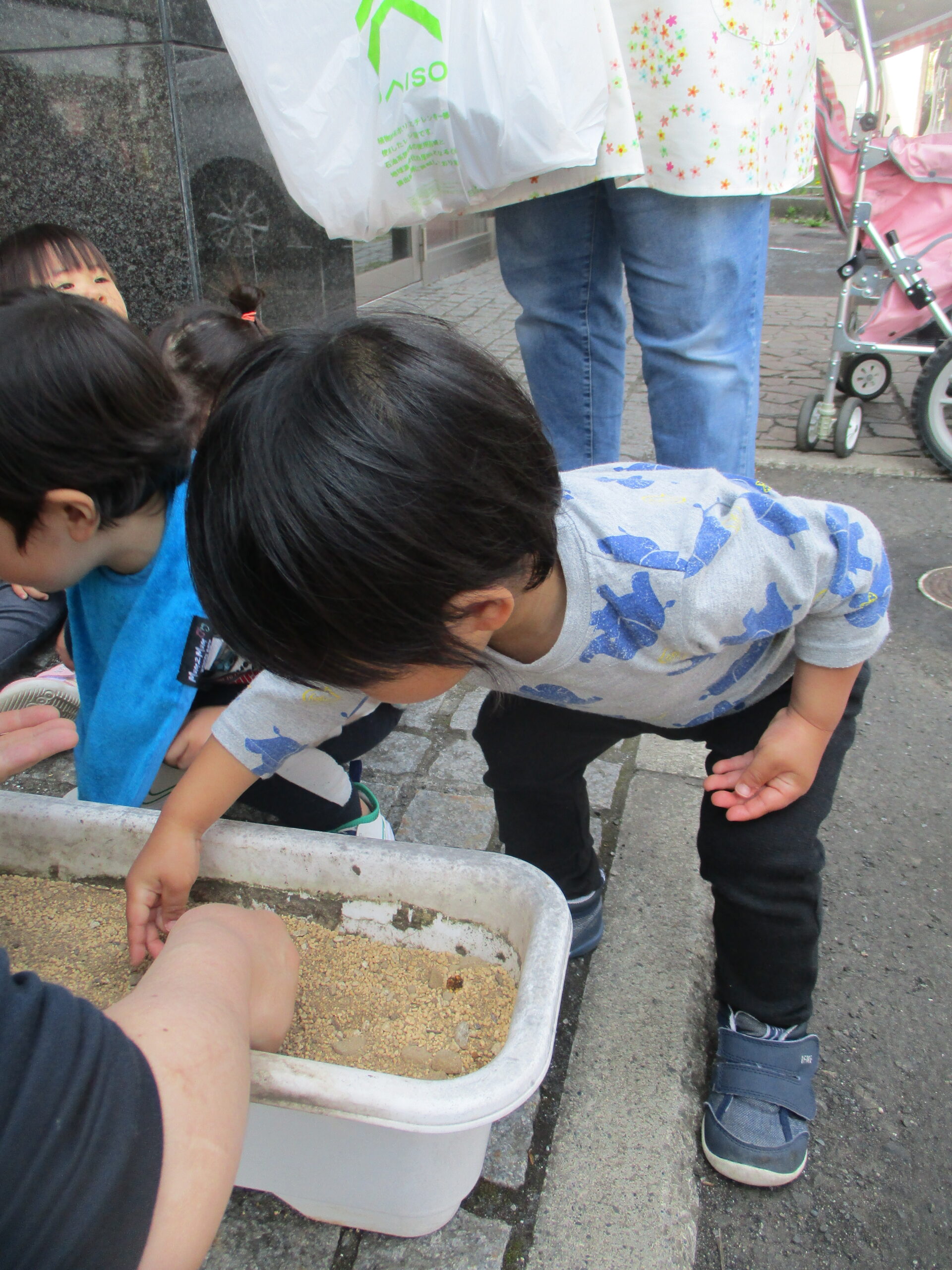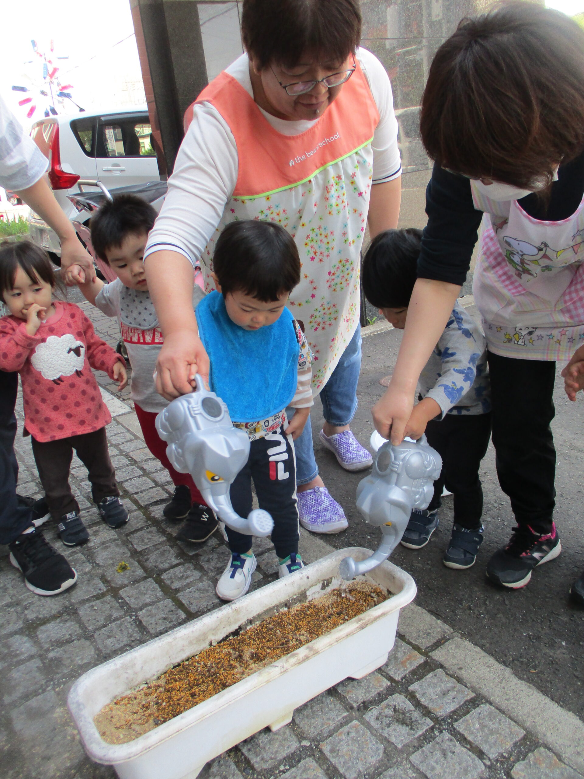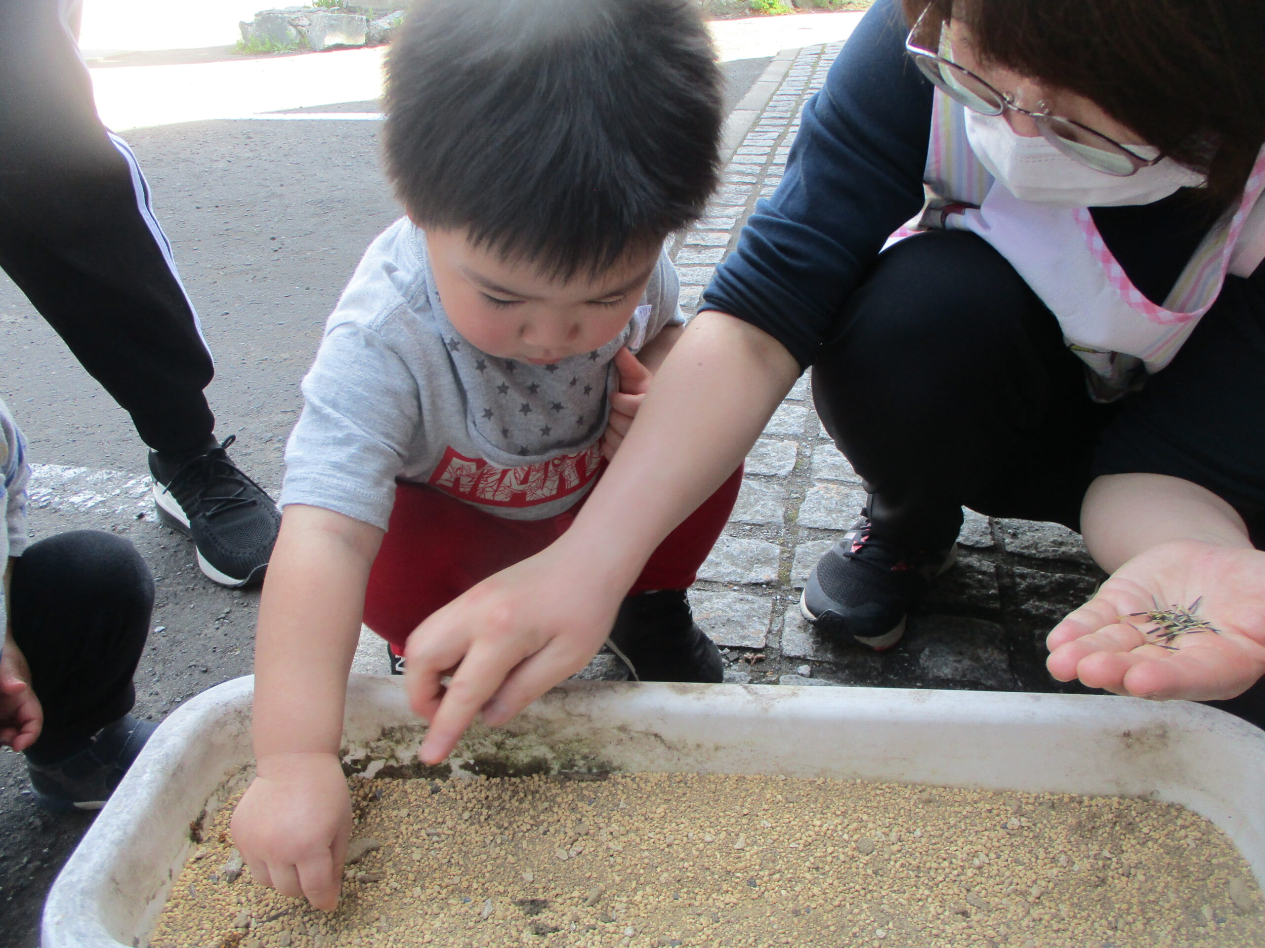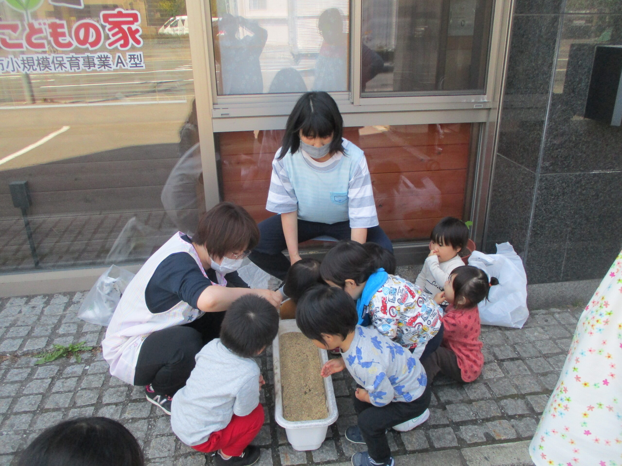 今回はマリーゴールドの種を植えました。一人ずつ種をパラパラとまき、最後に水まきをしました。土を触って感触を確かめてもいました。