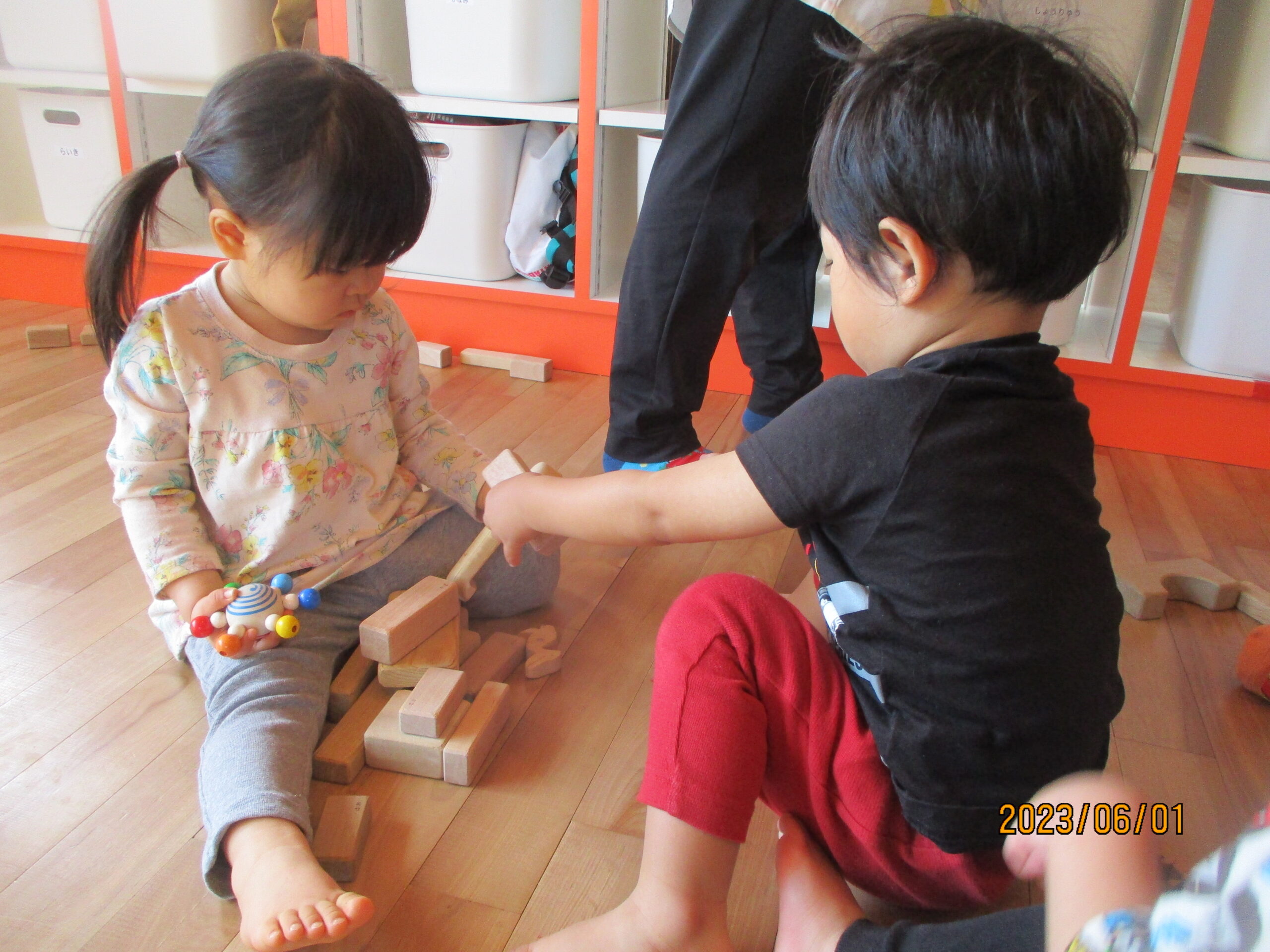 登園してからの活動では、たまごプールや、積み木、おままごとで遊びました。今日から入園した新しいお友達に積み木やおままごとを貸している優しい男の子!