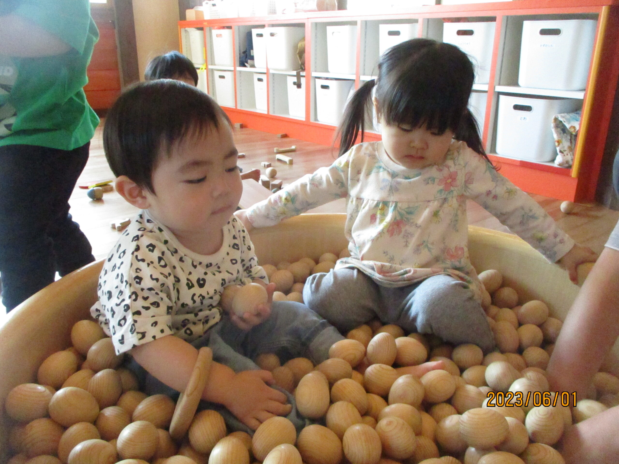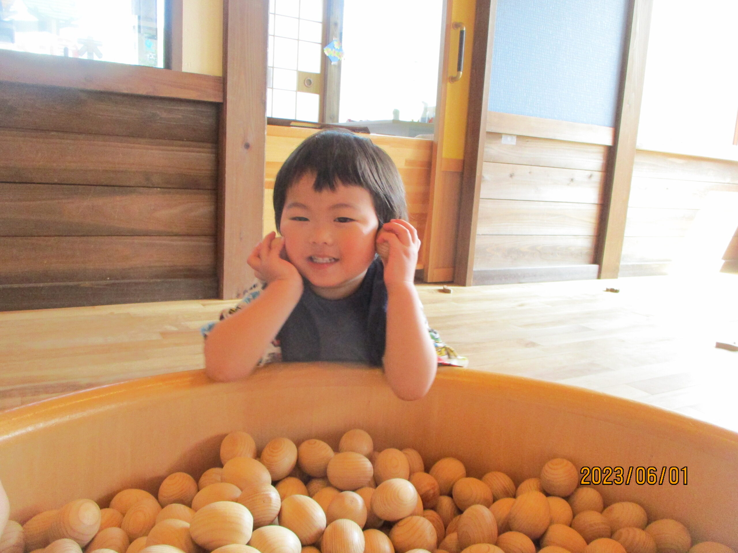 たまごプールの中に入りお友達に「どうぞ」と言いたまごを渡したりしていました。