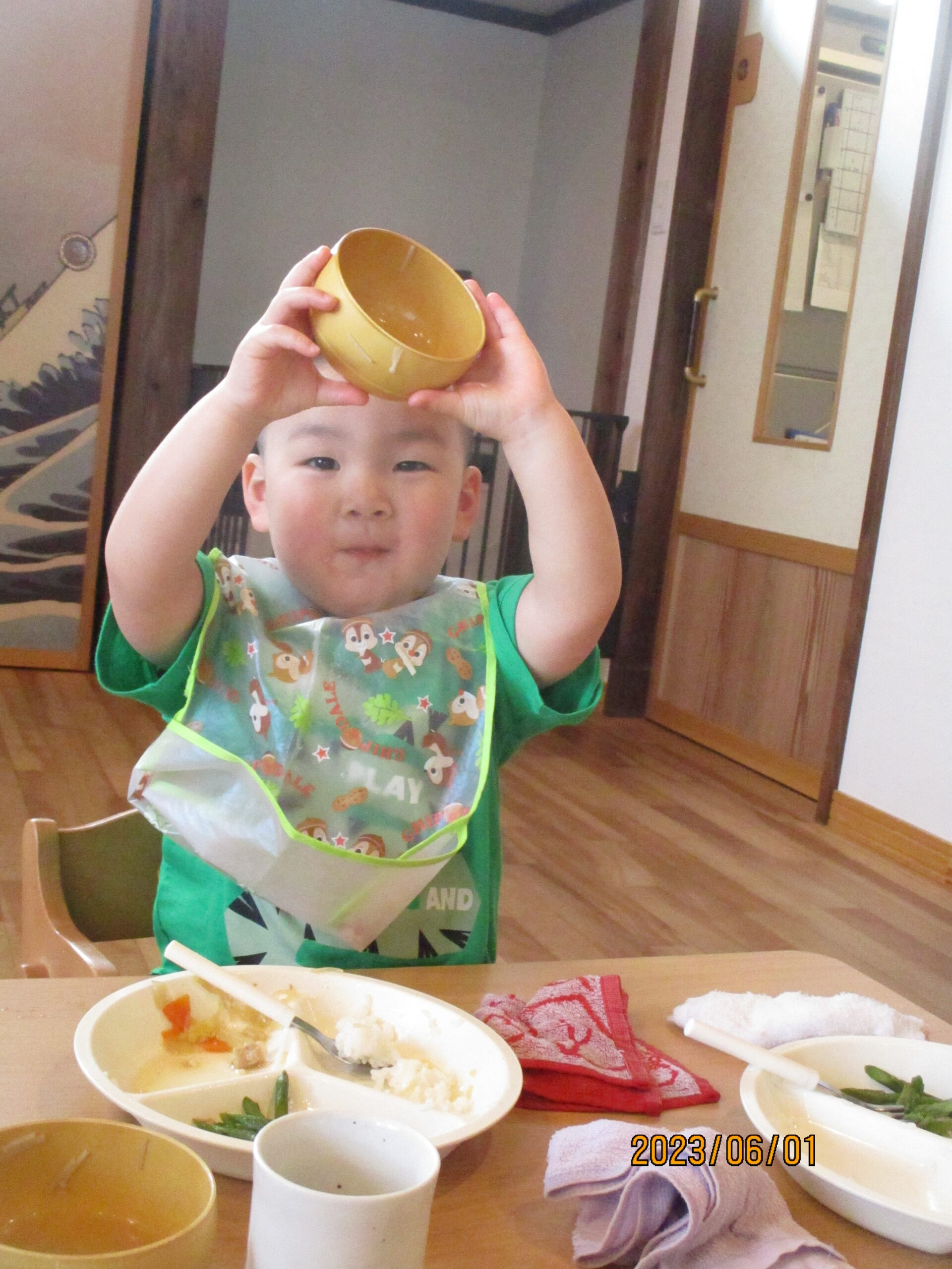 午前活動のあとは・・・。みんなで給食時間。味噌汁飲み終わったお友達が「見てー、飲んだよ」と嬉しそうに保育士に教えてくれましたよ♪