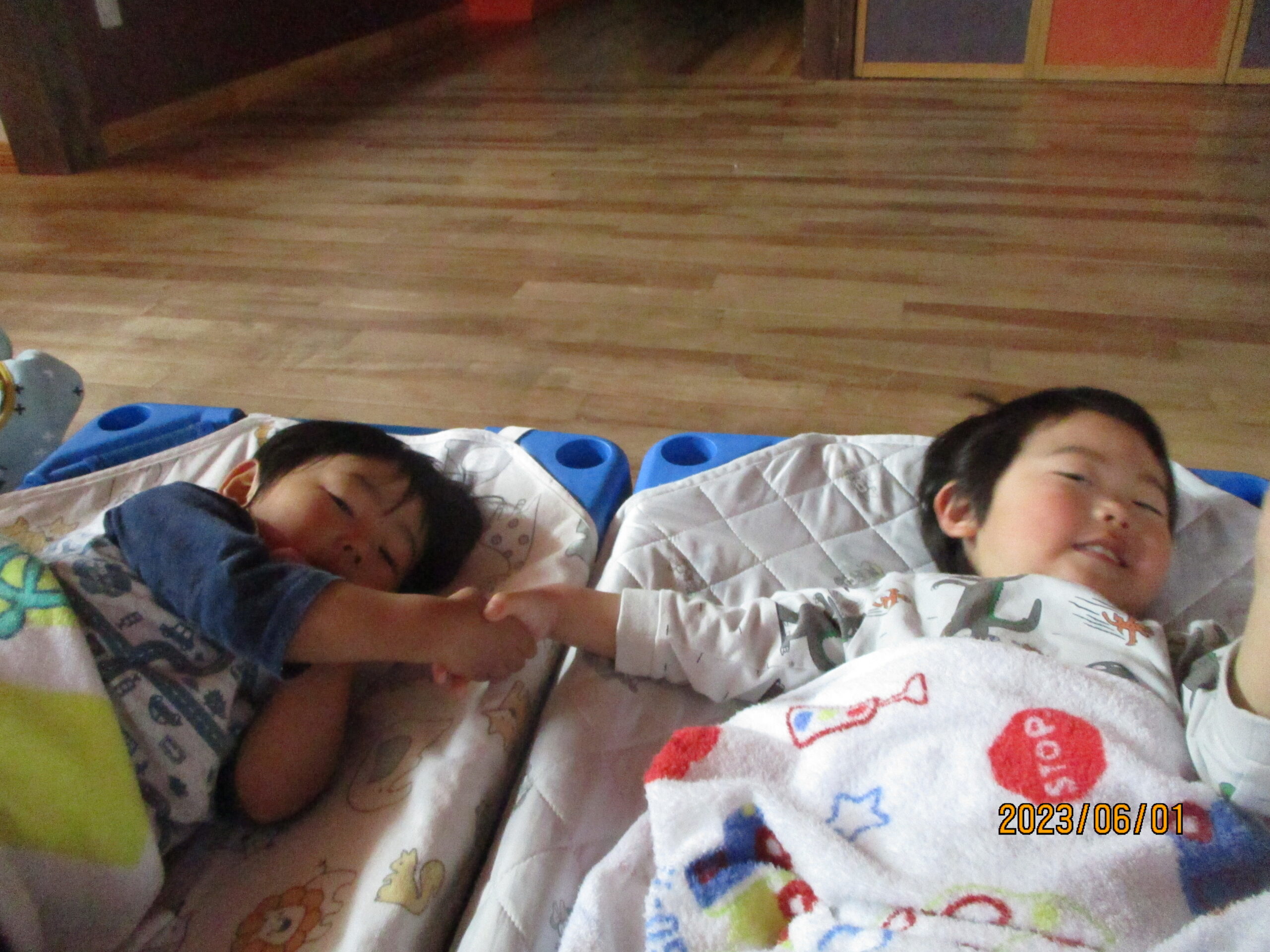 お腹いっぱい食べた後はお昼寝の時間。お友達と仲良く手を繋いでいる可愛い姿も見られました。