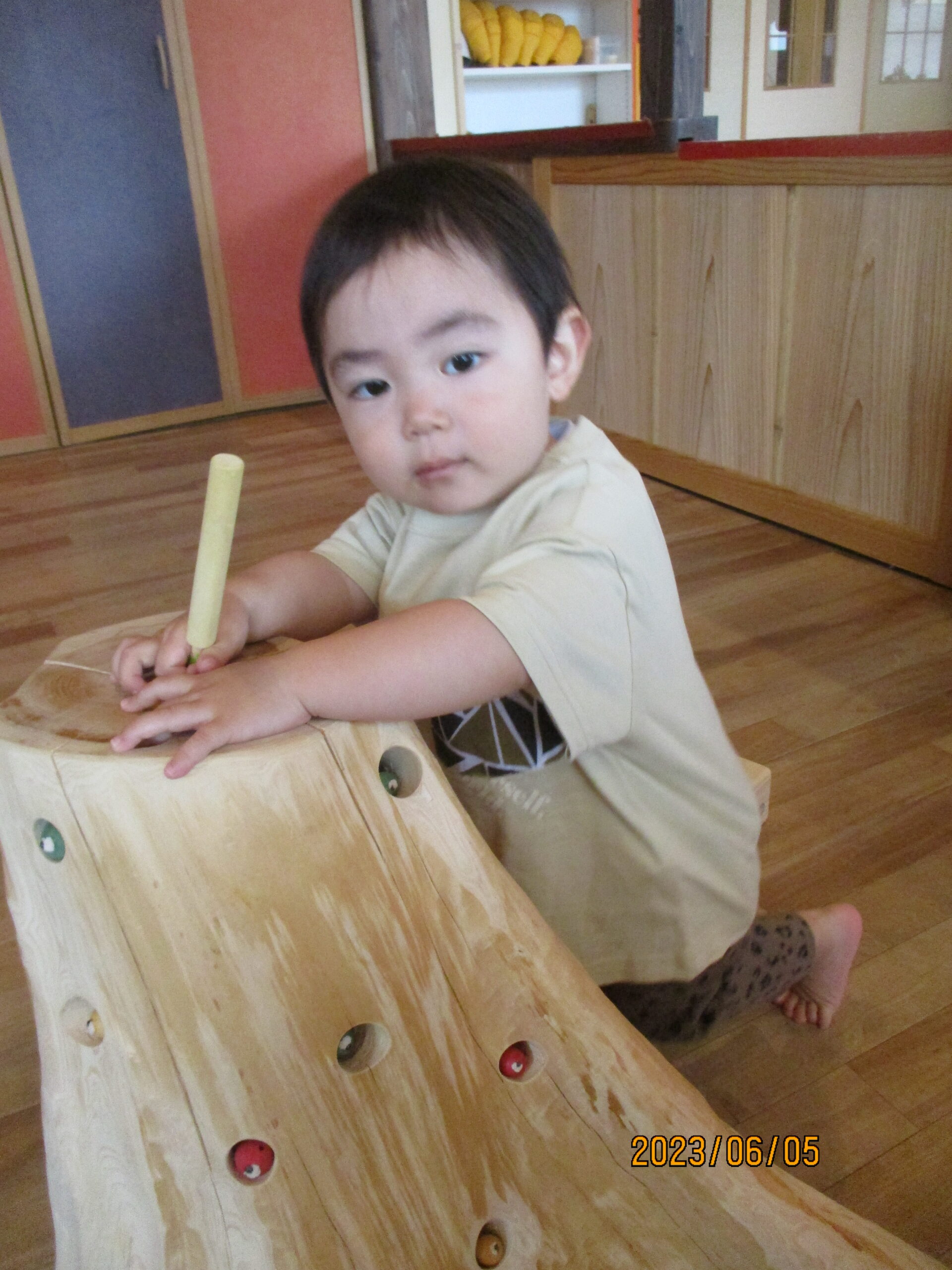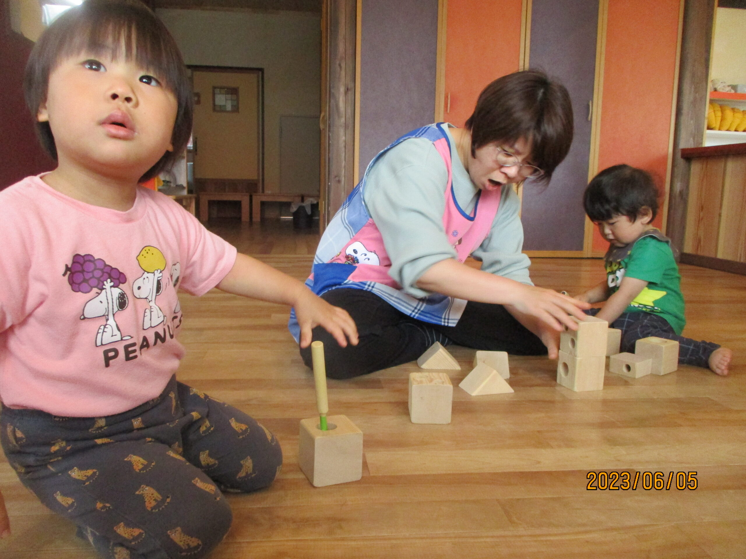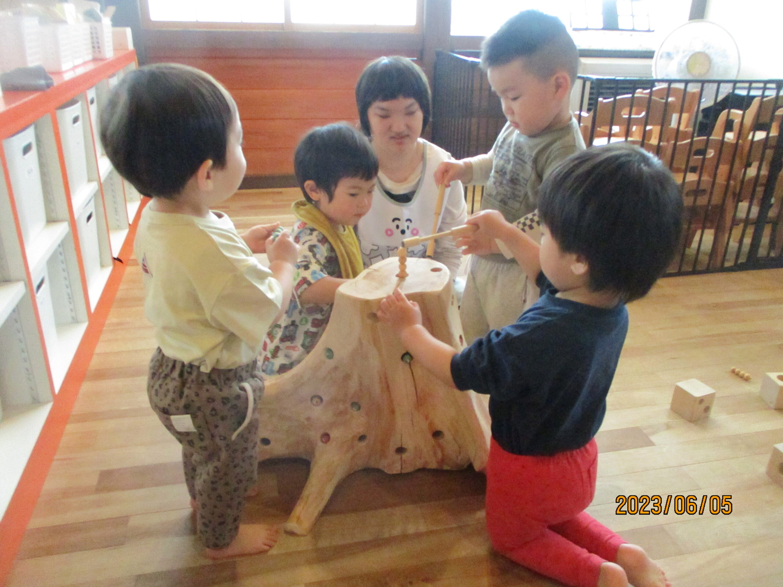 今日はいもむしの玩具や、積み木で遊びました♪木の棒をいもむしにくっつけたり、切り株の穴の中にいもむしを入れたりし、「いなーい」「どこかなぁ」と言って探していたこども達でした!