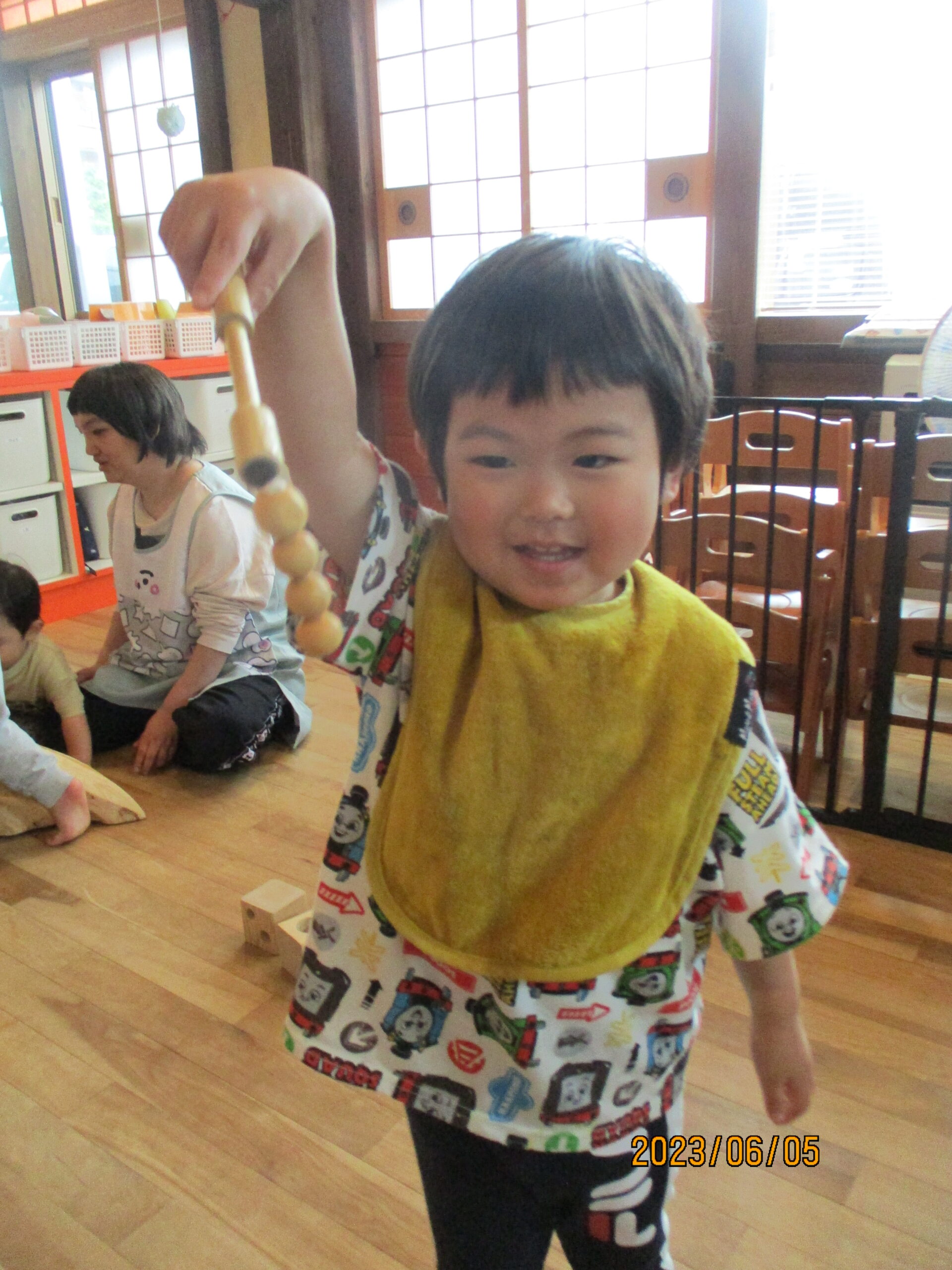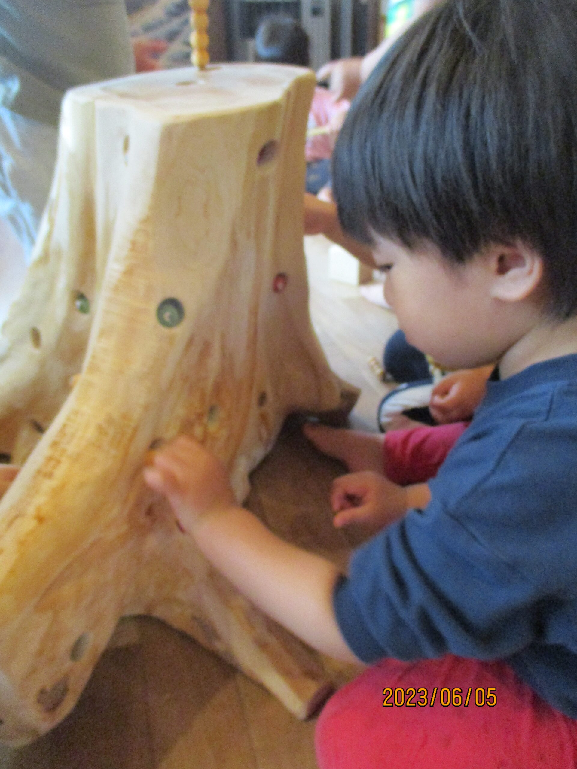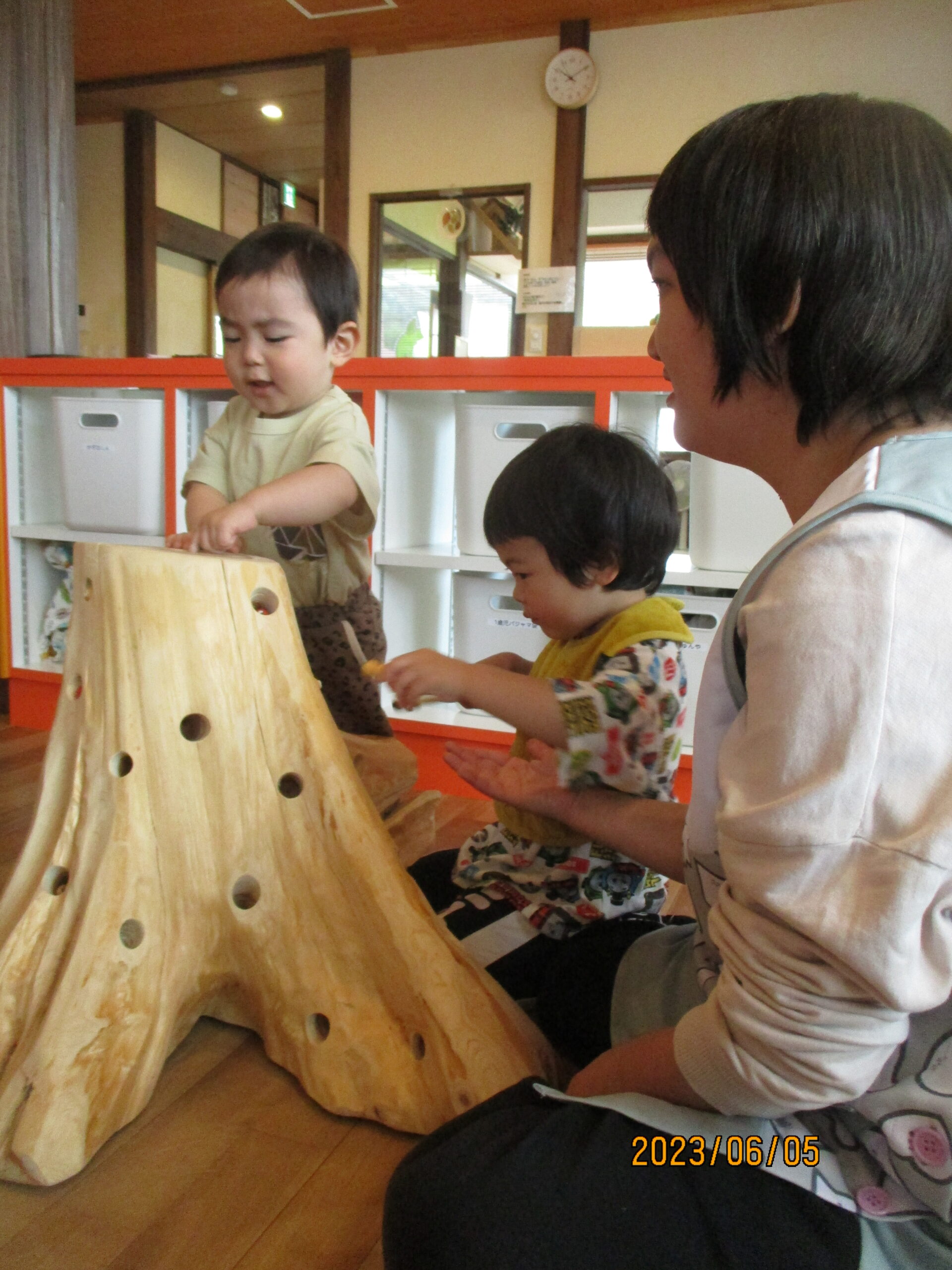 今日はいもむしの玩具や、積み木で遊びました♪木の棒をいもむしにくっつけたり、切り株の穴の中にいもむしを入れたりし、「いなーい」「どこかなぁ」と言って探していたこども達でした!