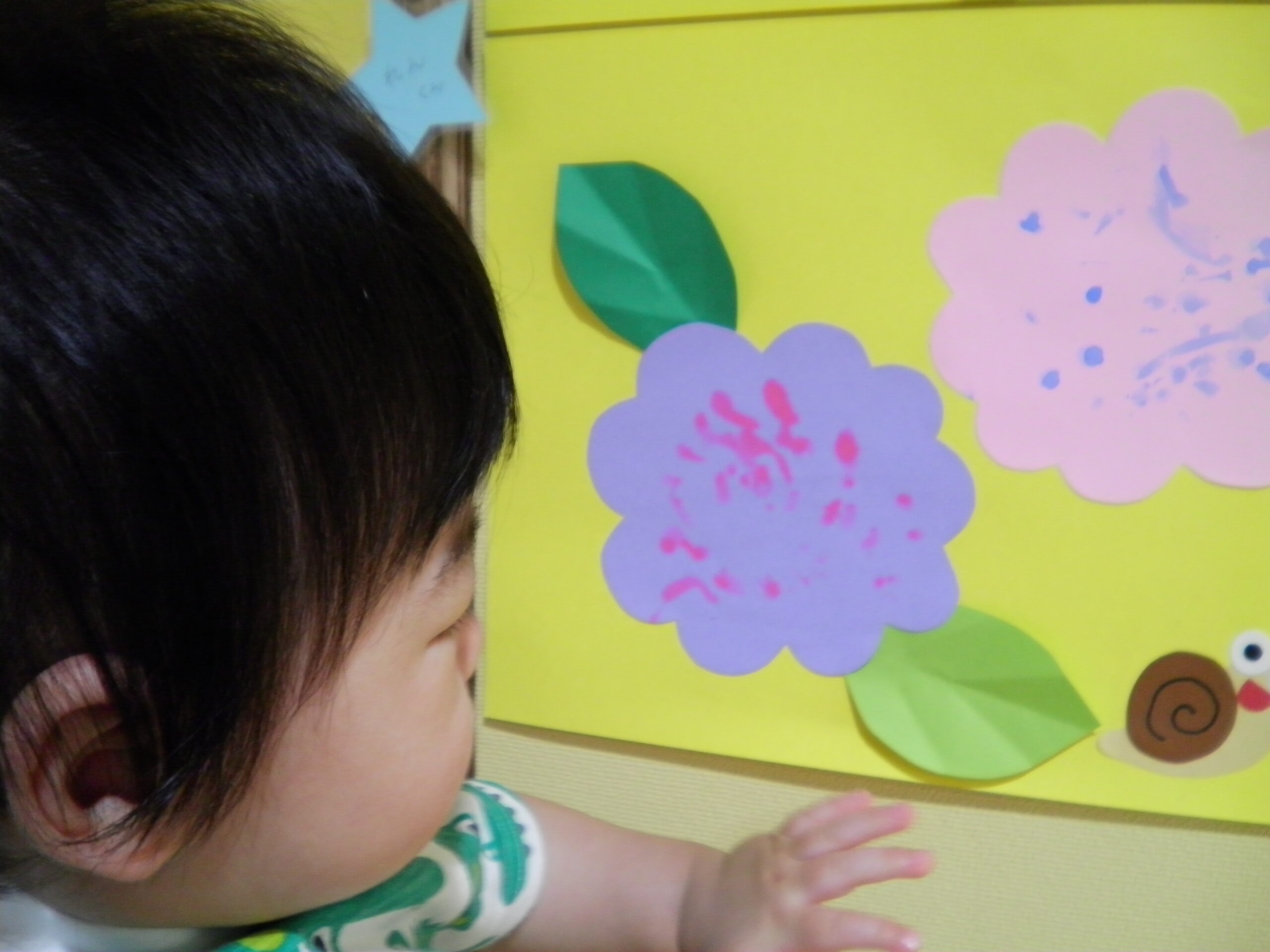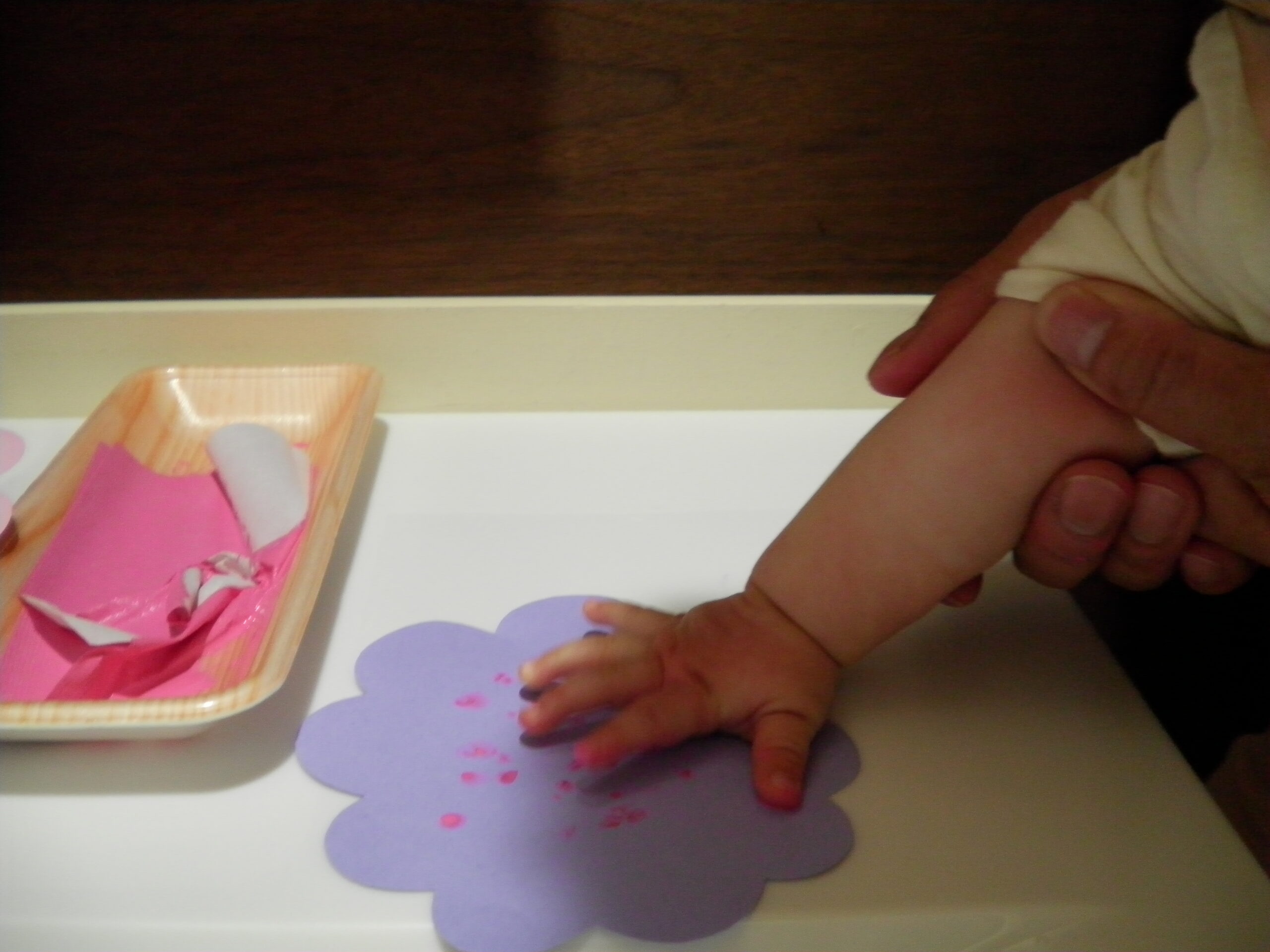 出来上がった製作をにこにこ😊しながら手で触っている姿は