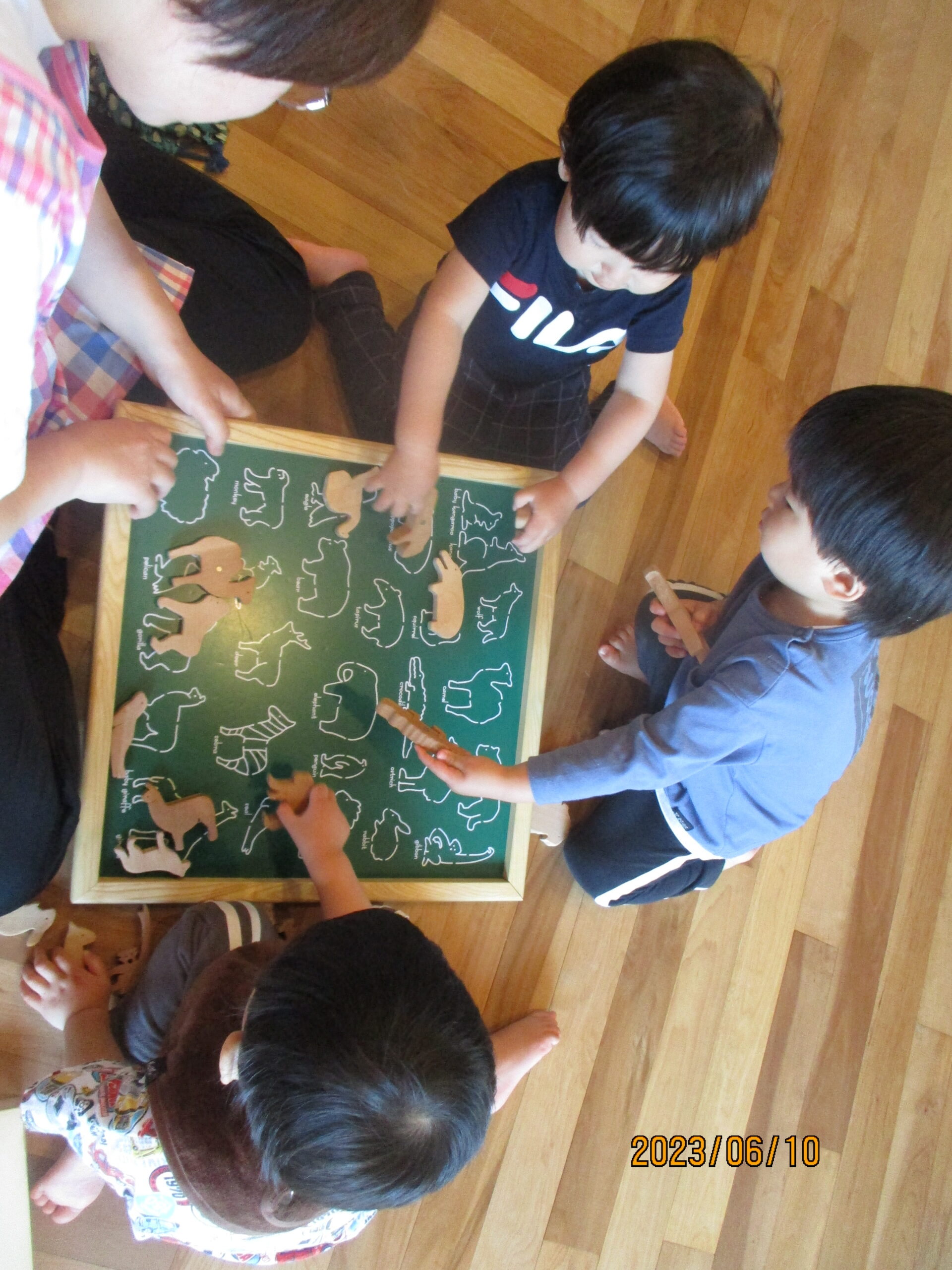 動物合わせの積み木でも遊びました。“この動物はどこだろう・・。”と