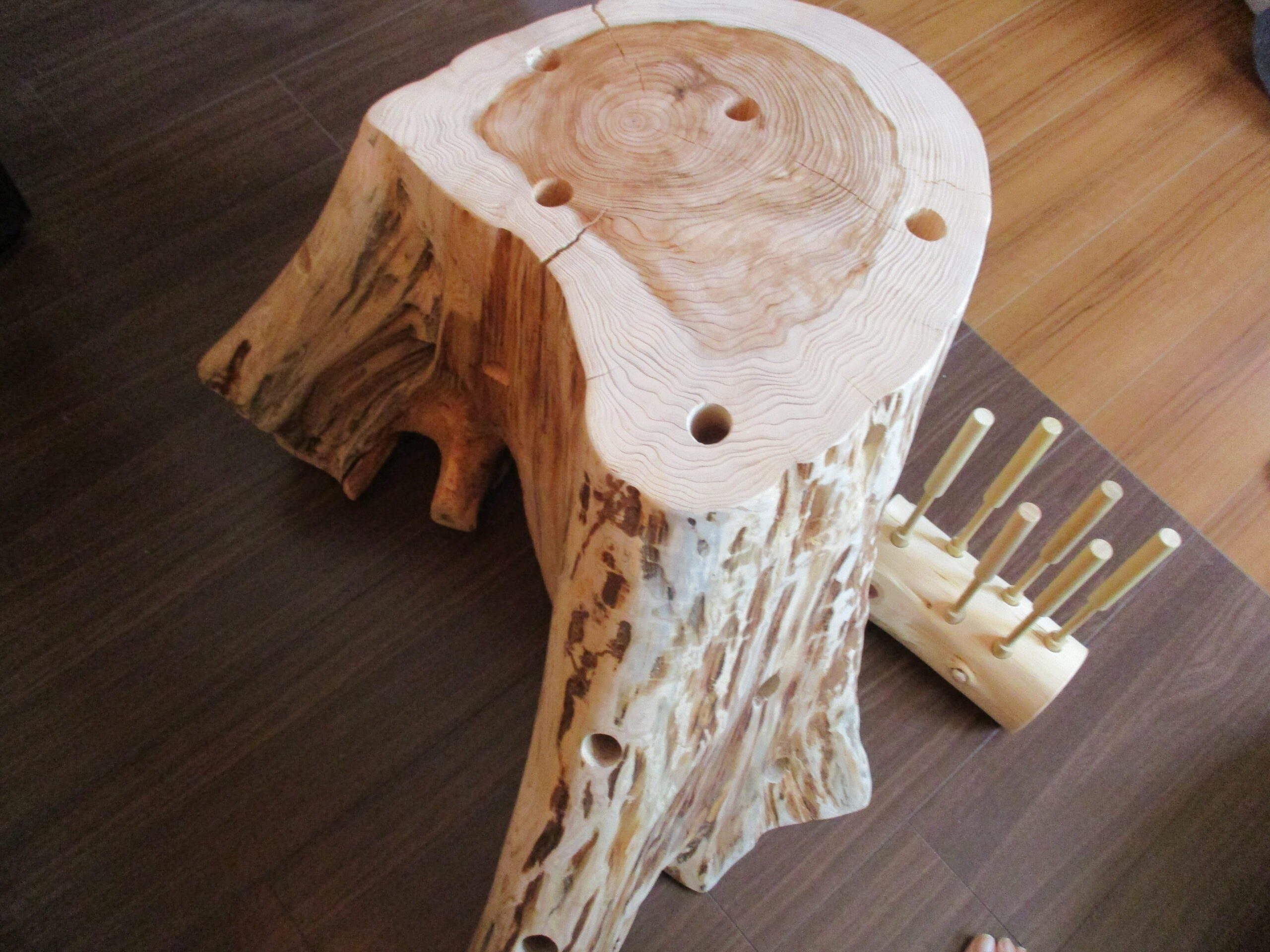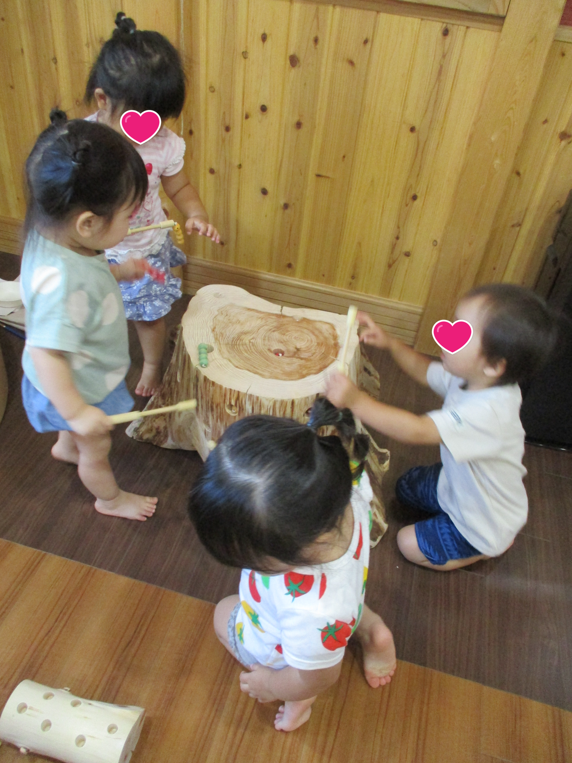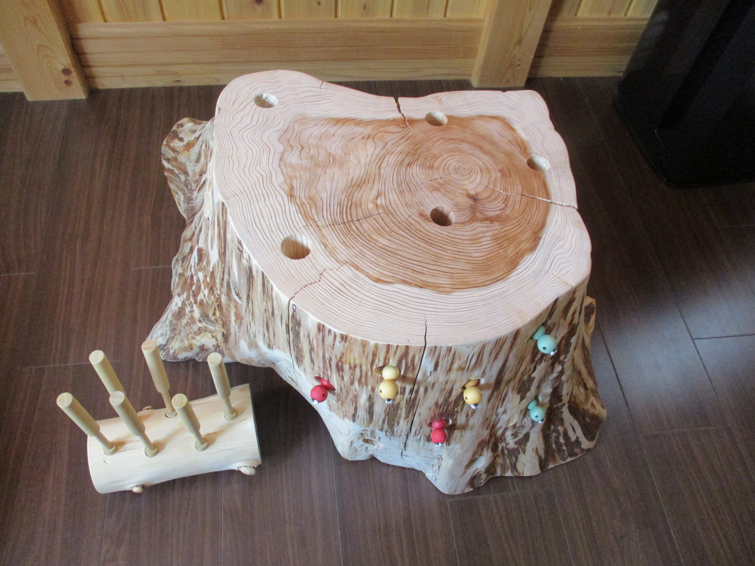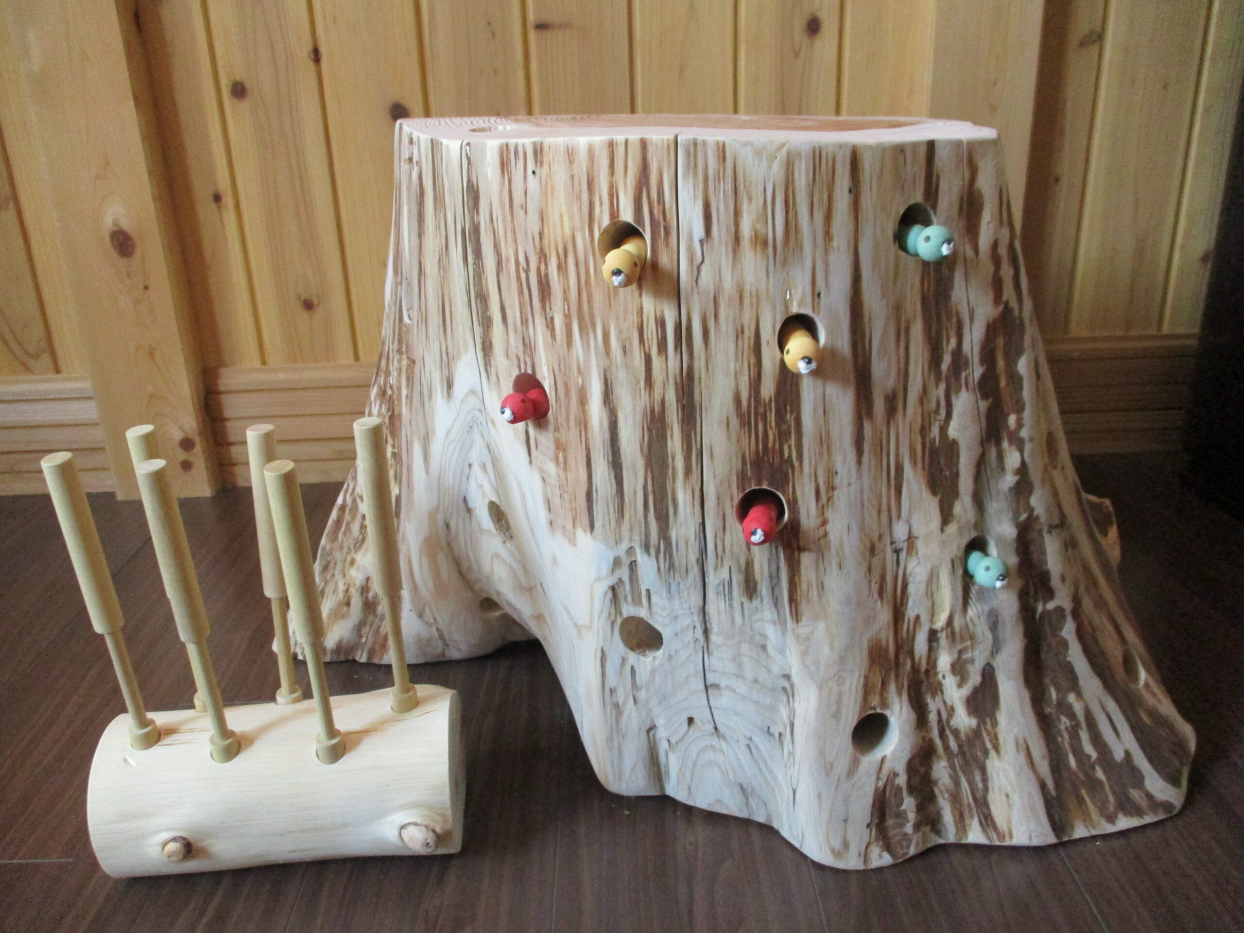 ひっつき虫という遊具です。いもむしさんのお家は本当の木の切り株を使用しており。