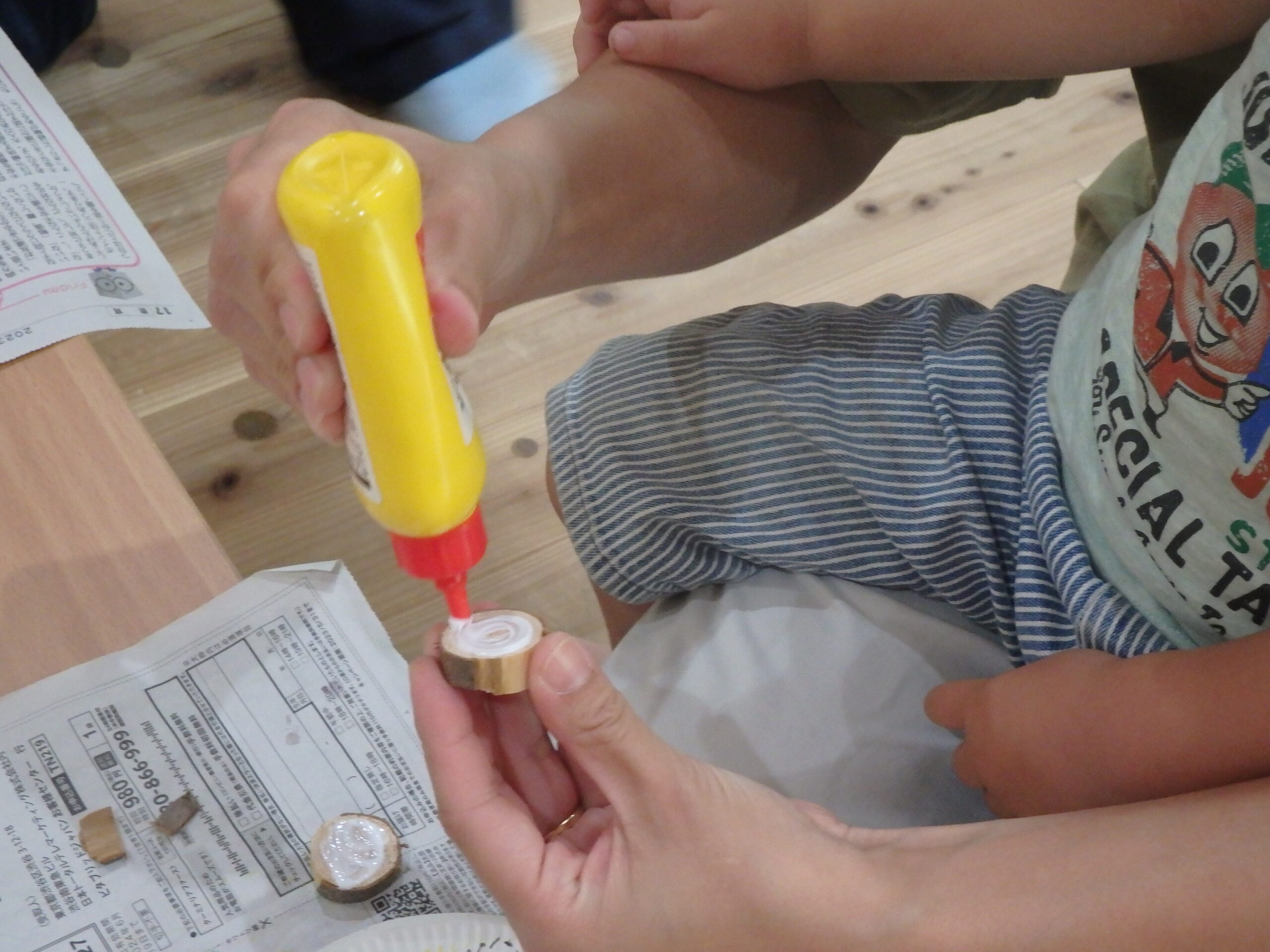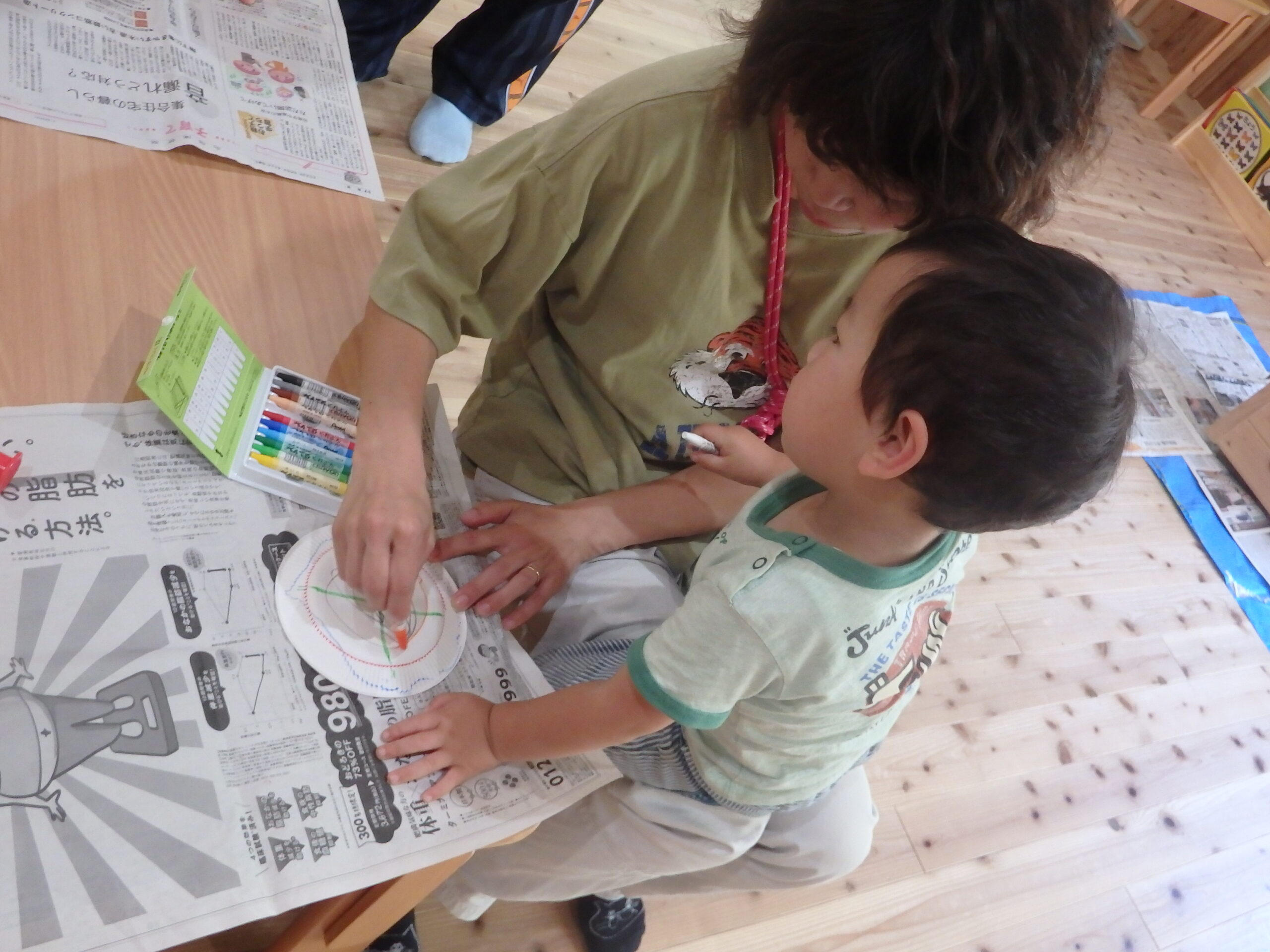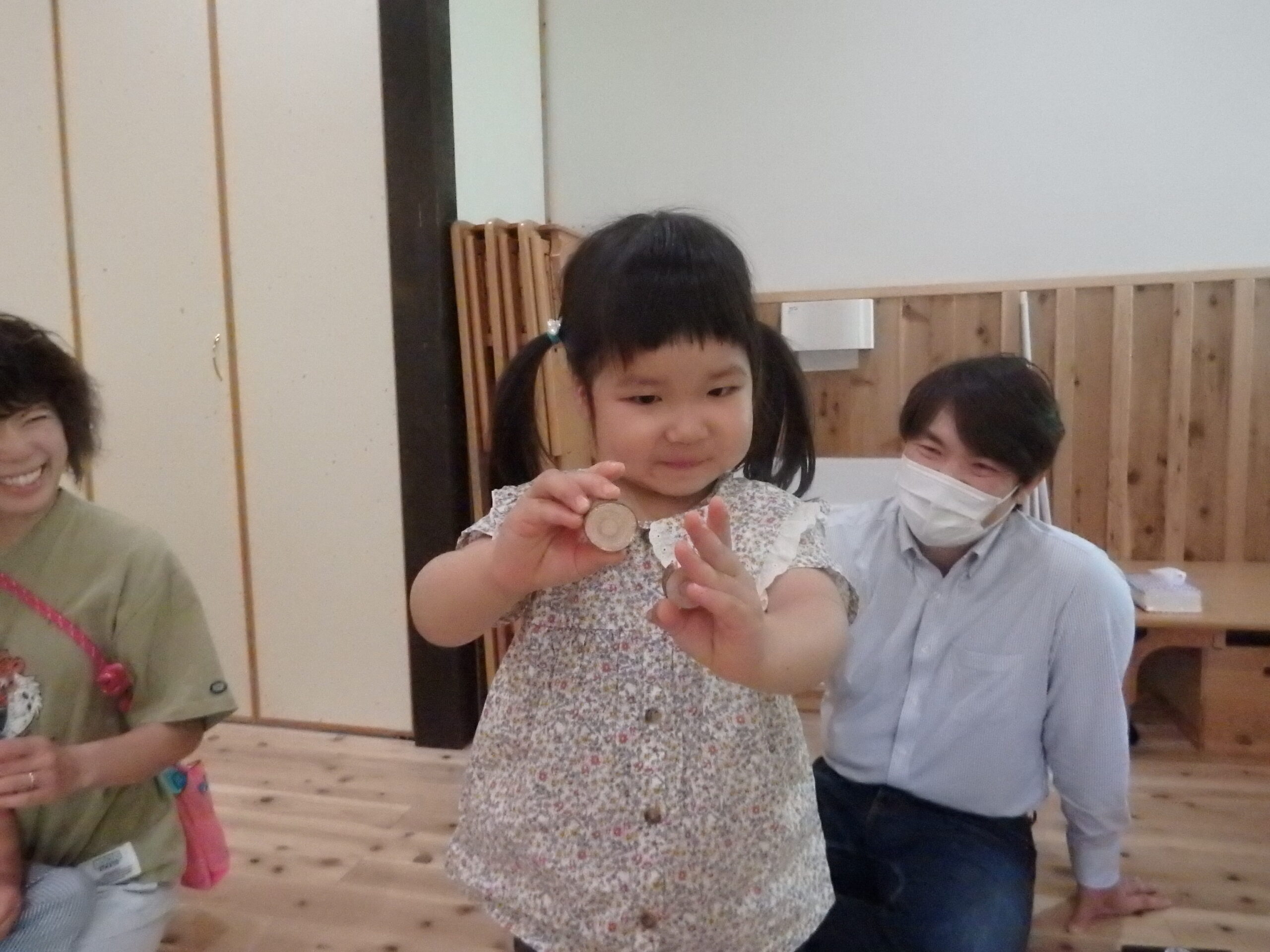 2・3歳児合同クラスのもも組は、木を使ったカスタネットを作りました! まずは、紙皿に絵を描いて・・ それから、初体験!木の枝切りに挑戦! 親子で上手に輪切り体験できました。