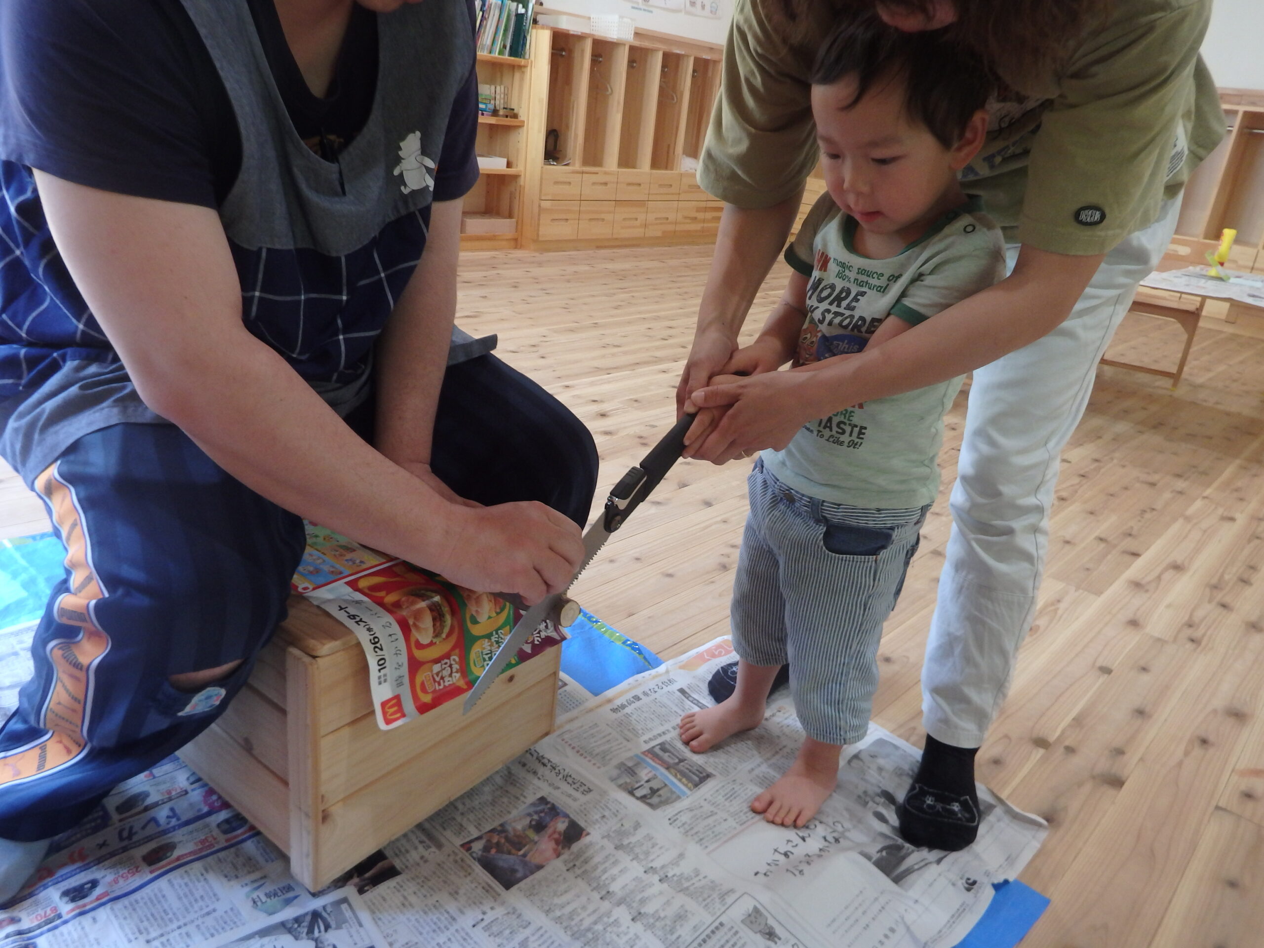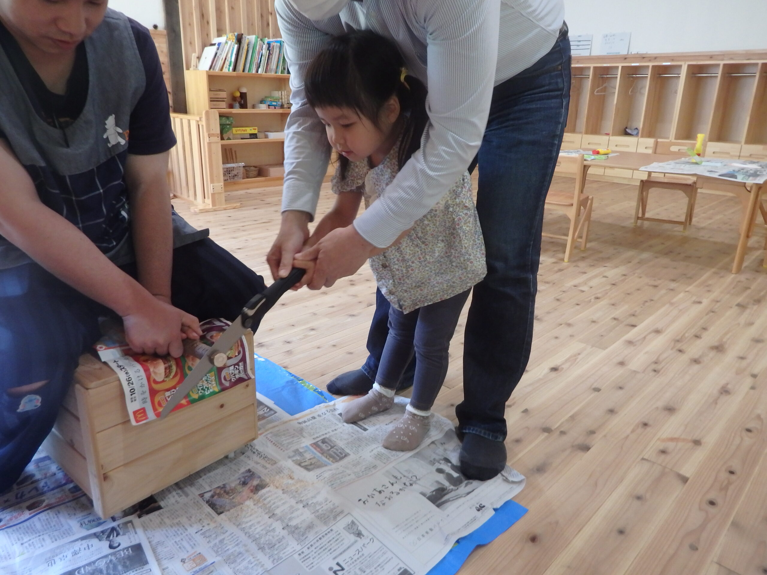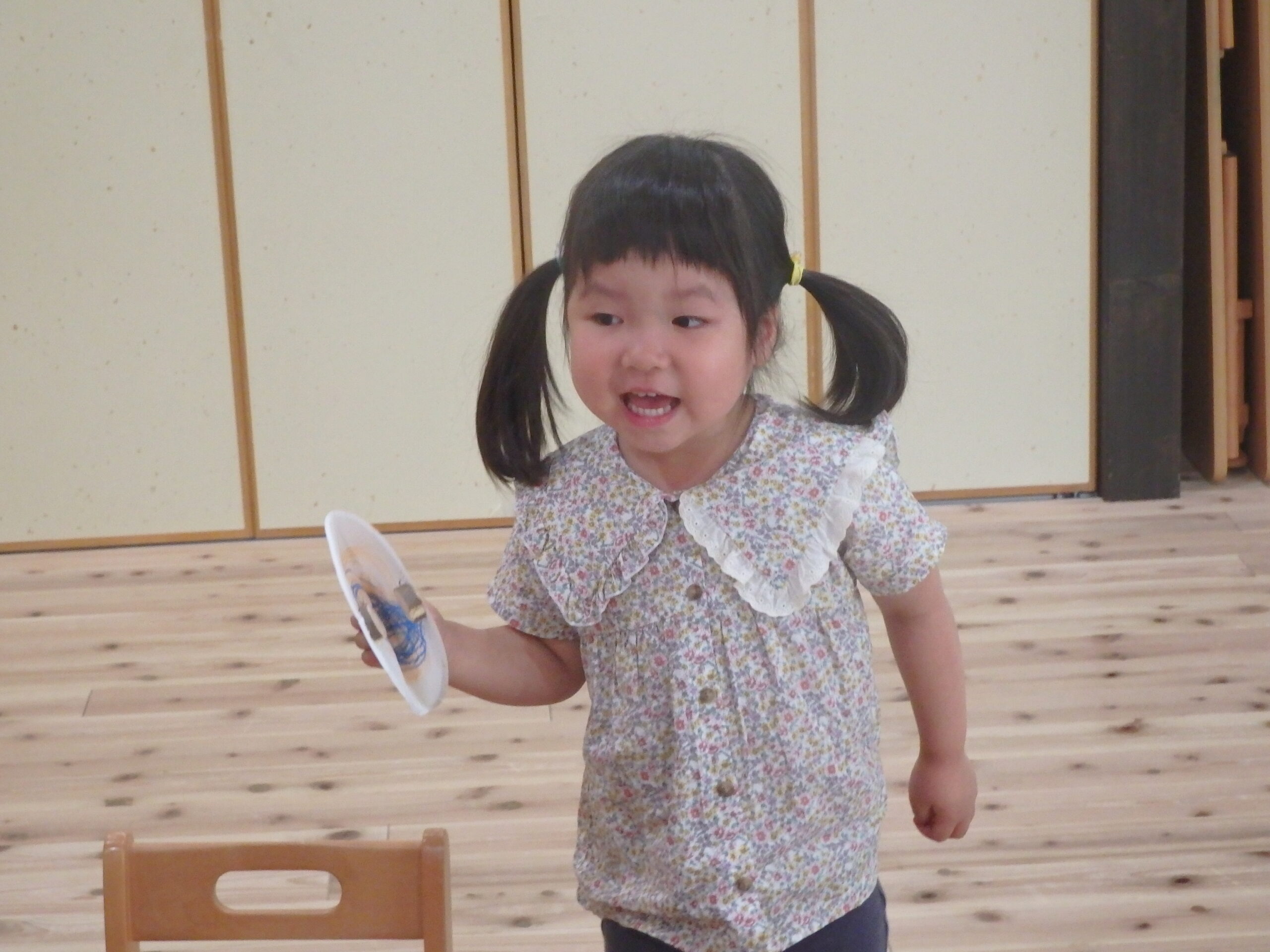 2・3歳児合同クラスのもも組は、木を使ったカスタネットを作りました! まずは、紙皿に絵を描いて・・ それから、初体験!木の枝切りに挑戦! 親子で上手に輪切り体験できました。
