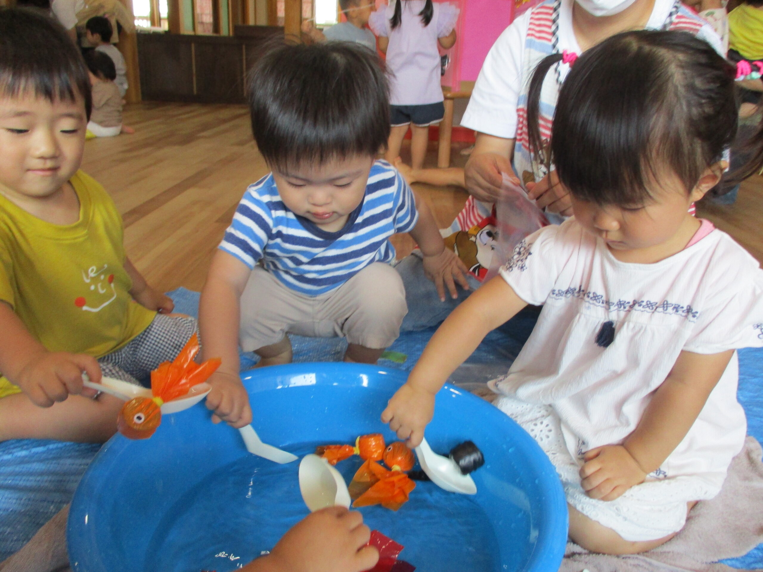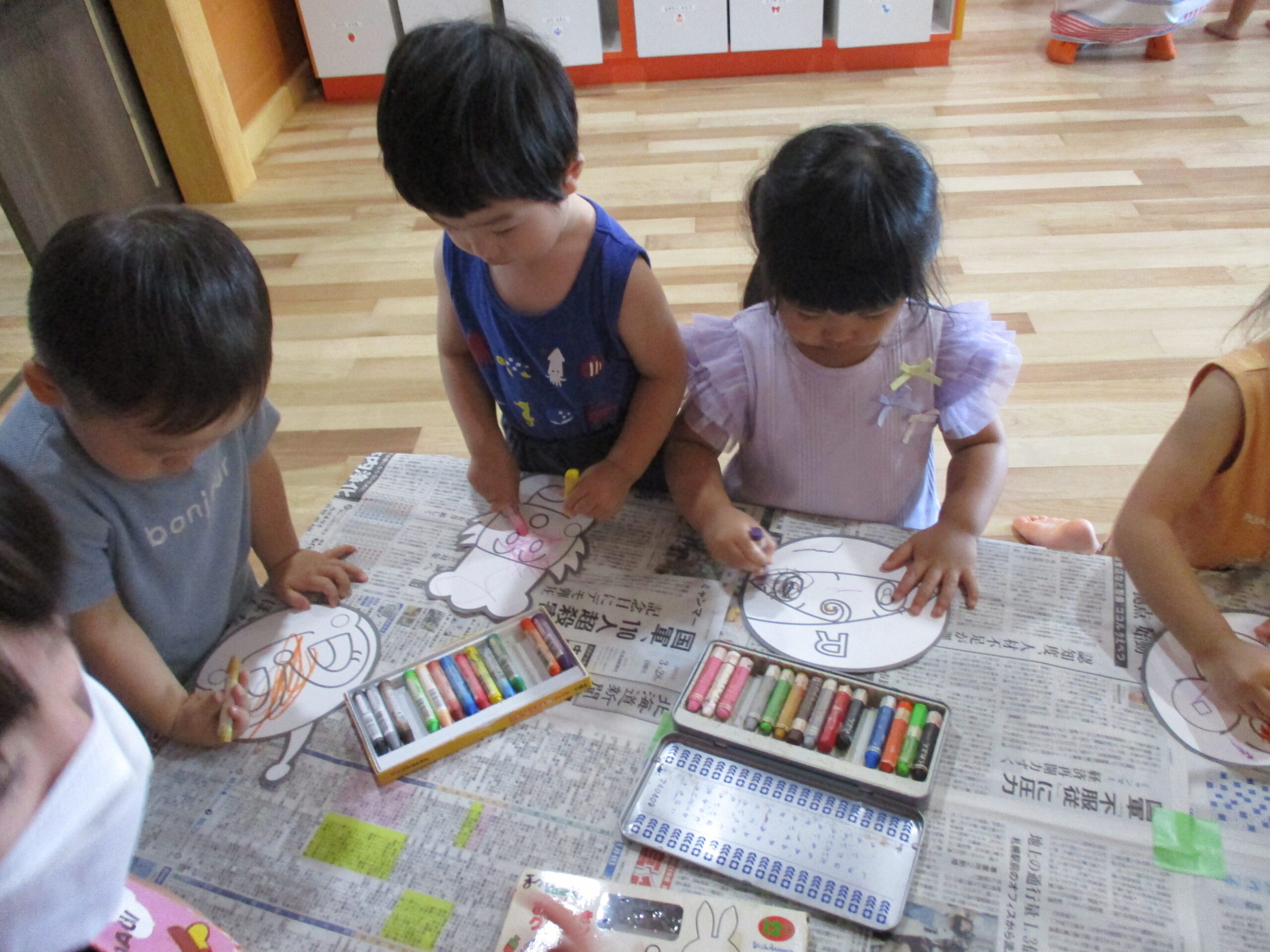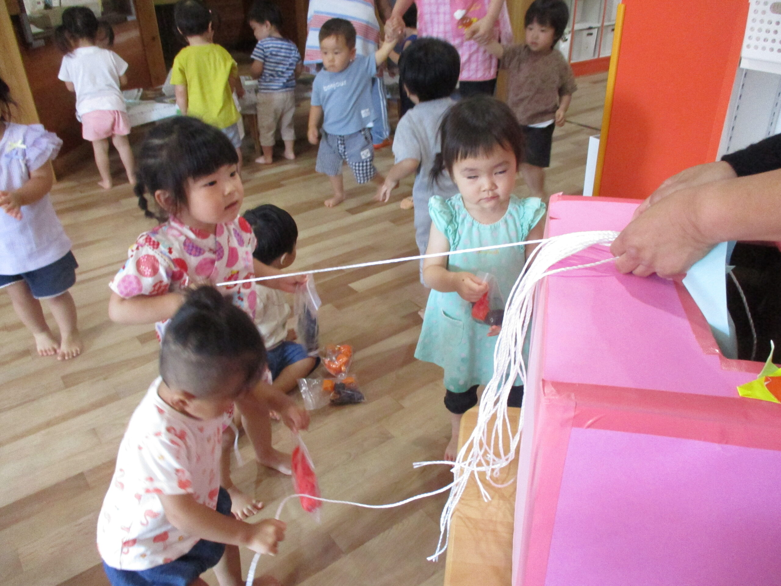 今日は、北海道での七夕です。保育園でも、子供たちは、お祭りごっこのように七夕祭りをして、お友だちや先生と一緒に楽しく過ごしました。金魚すくいでは、お友だちと一緒に、「何色の金魚を釣ろうかな?」と楽しく考えながらそおーっとレンゲですくったり、ひもくじでは、何が出るのかな?と興味を持ちながら、長いひもをどんどん引っ張り、かわいい袋が見えてくると「わー!」と歓声が上がっていました。お面つくりでは・・・キャラクターの中から、自分の好きな絵を選び、クレヨンで楽しくお絵描き!みんなで楽しい時間を過ごしました。