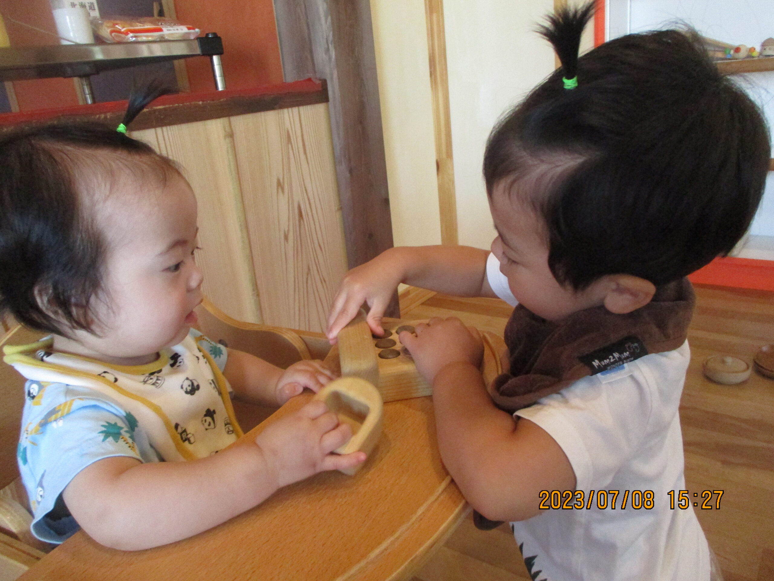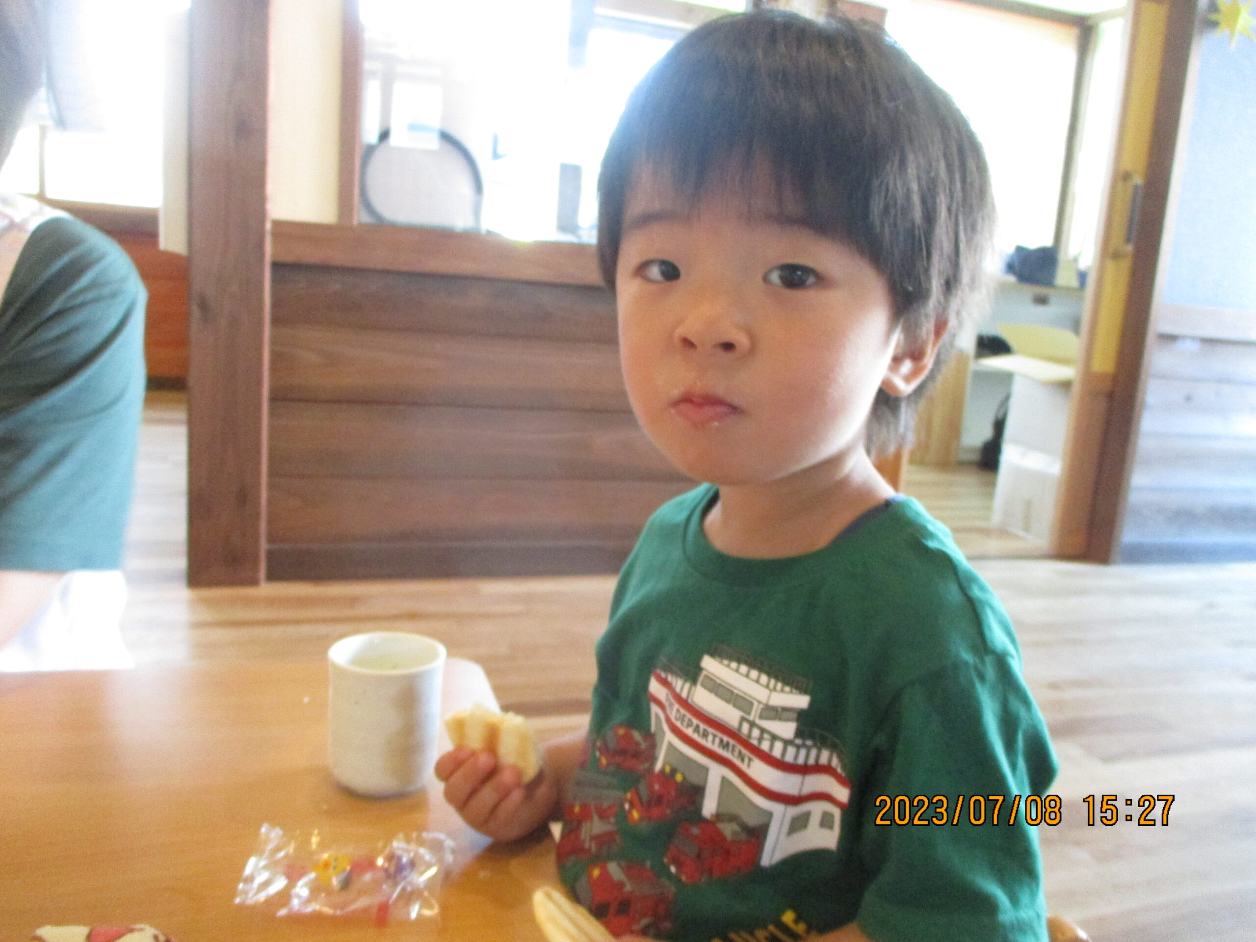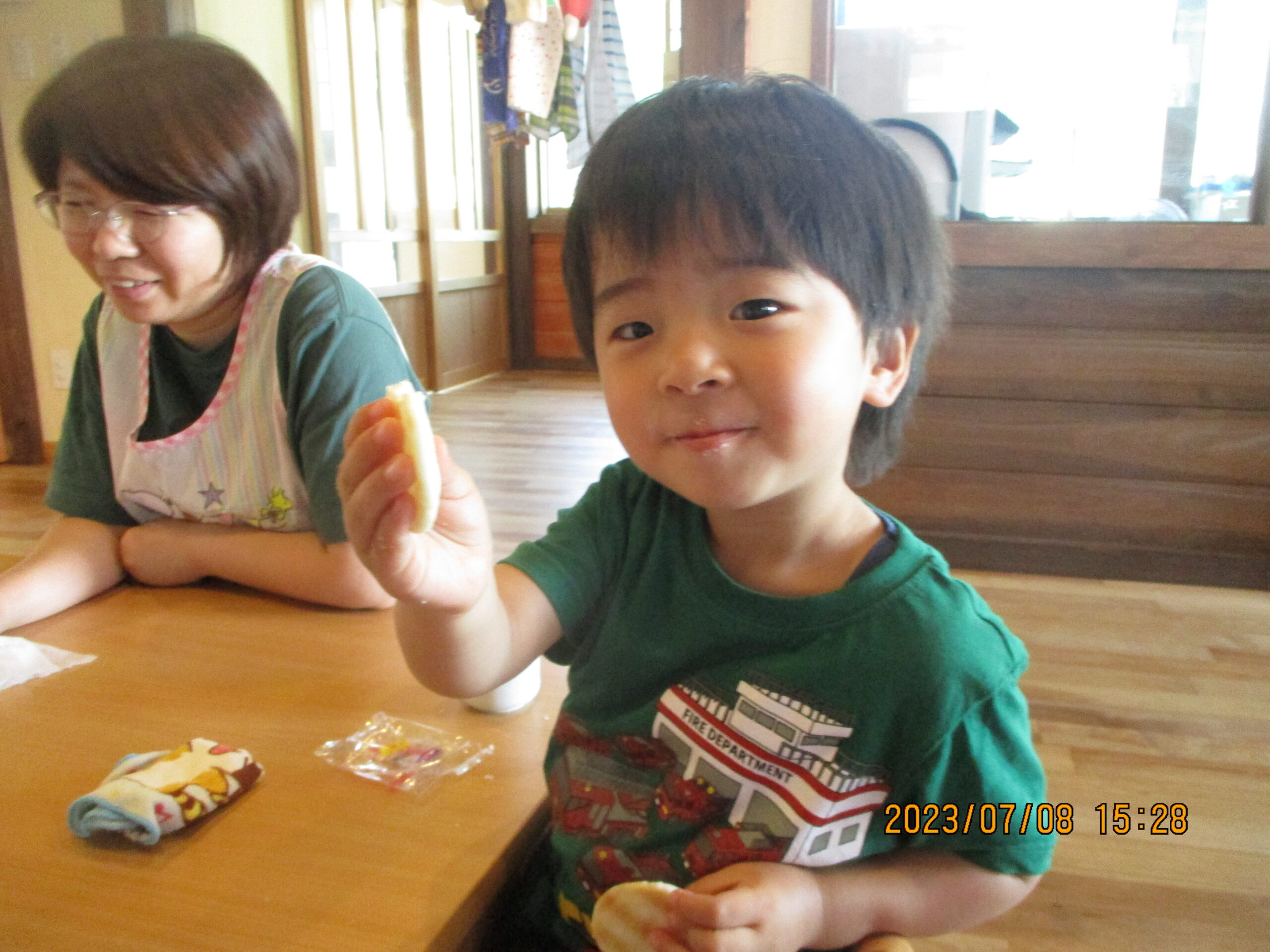 おやつを食べていたお友達。職員が「なに食べているの?」と