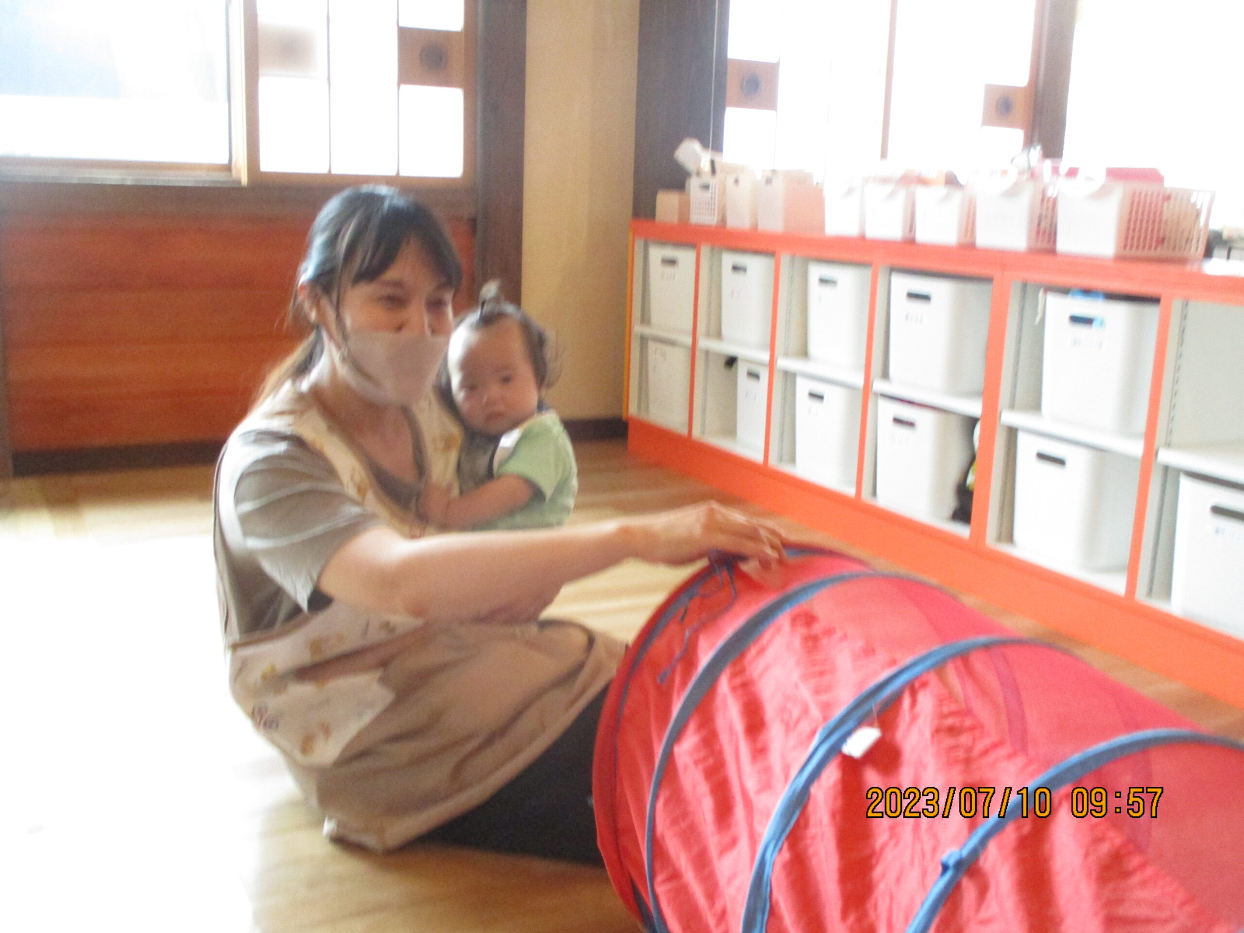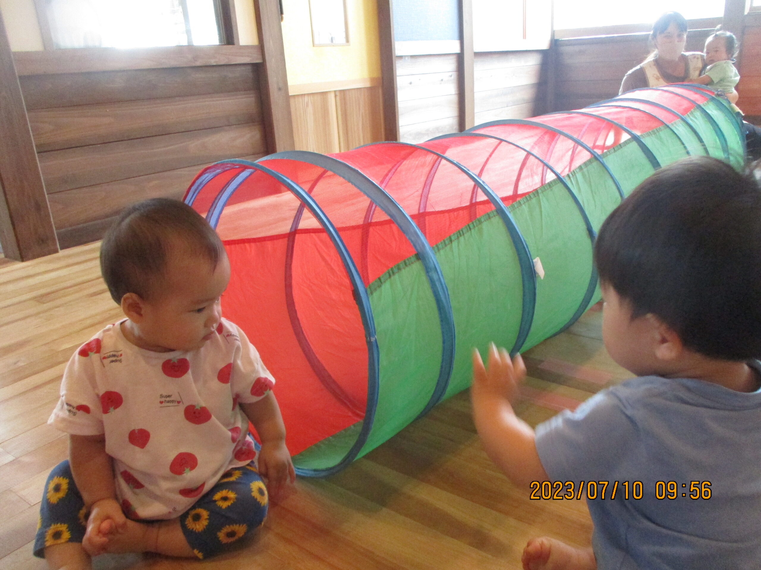 今日は、トンネル遊びをしました。 気にはなるけど中へ入るのは、もう少し先のようで 中をのぞいたり、外側を歩いたりして周囲を観察しています!