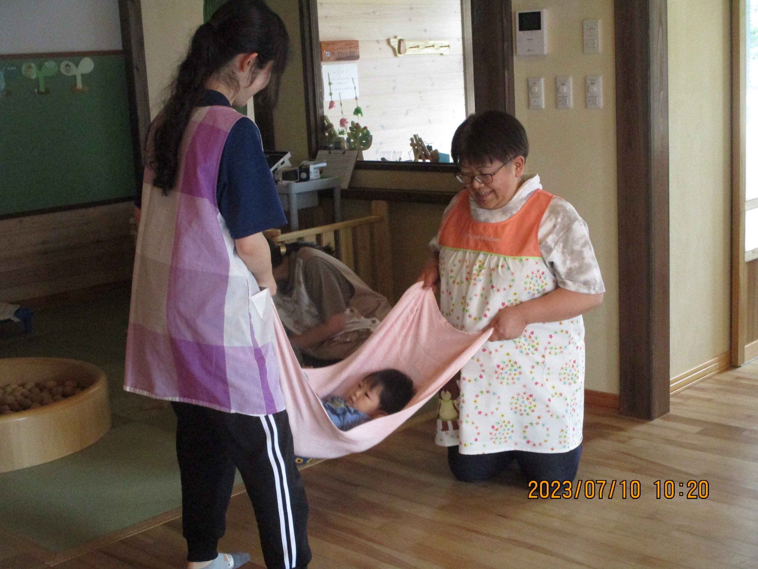 大きなタオルのゆらゆらブランコも楽しみました! 宙に浮く感覚は、きっと不思議です♪
