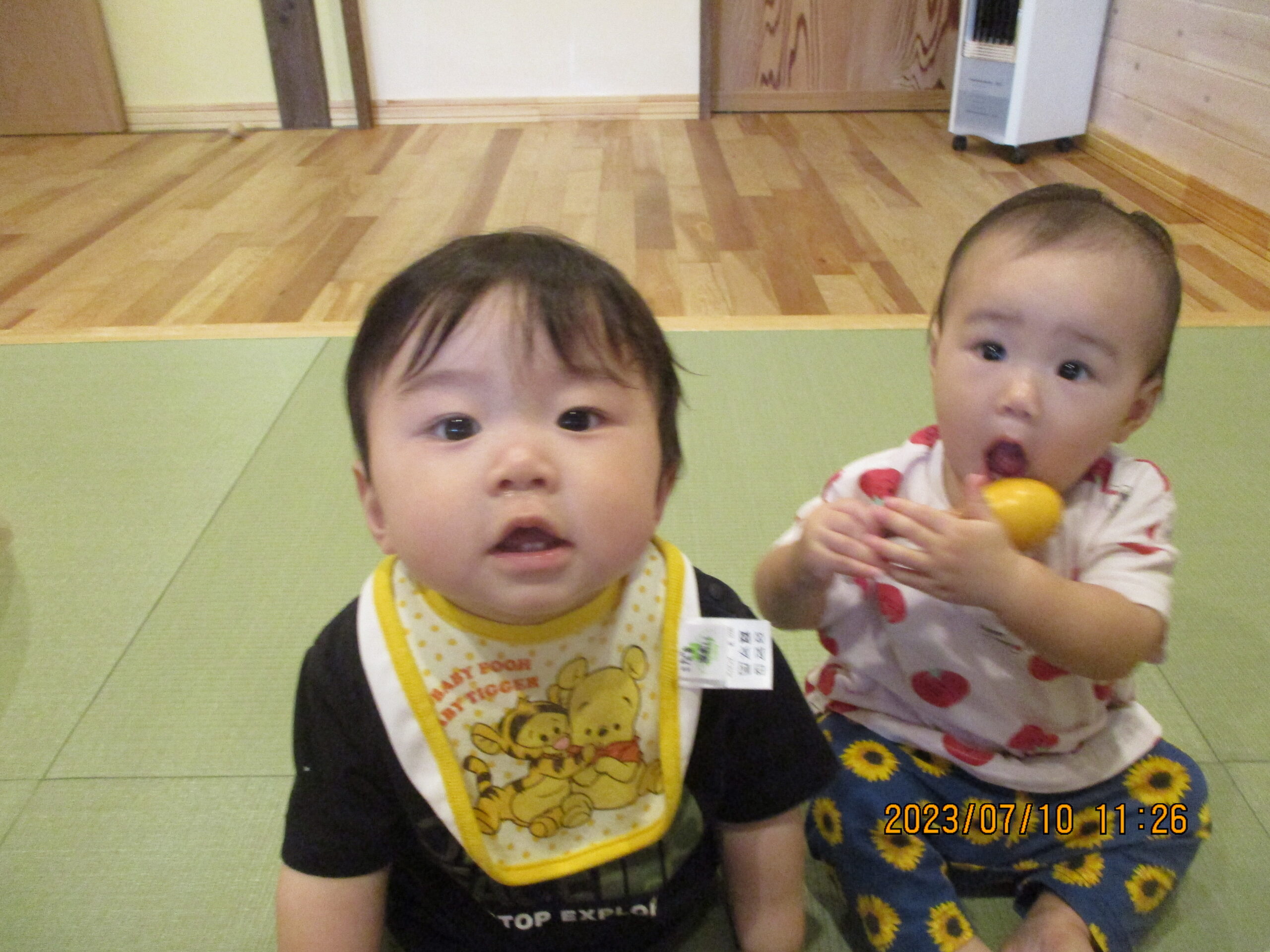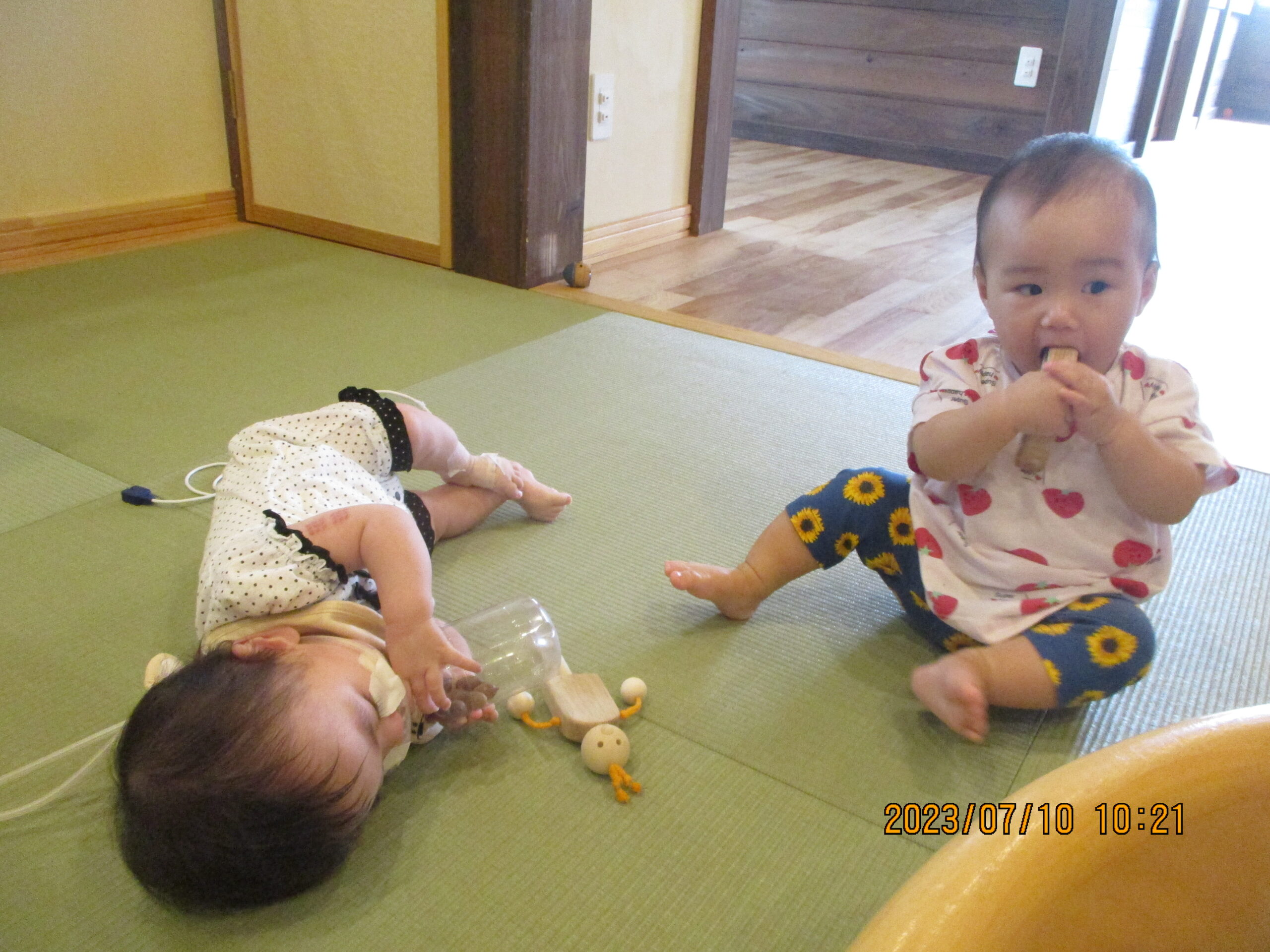 朝一番の、のんびりタイムです♪ お互いに近くにいることに慣れてきて リラックスして遊具で遊んでいます!