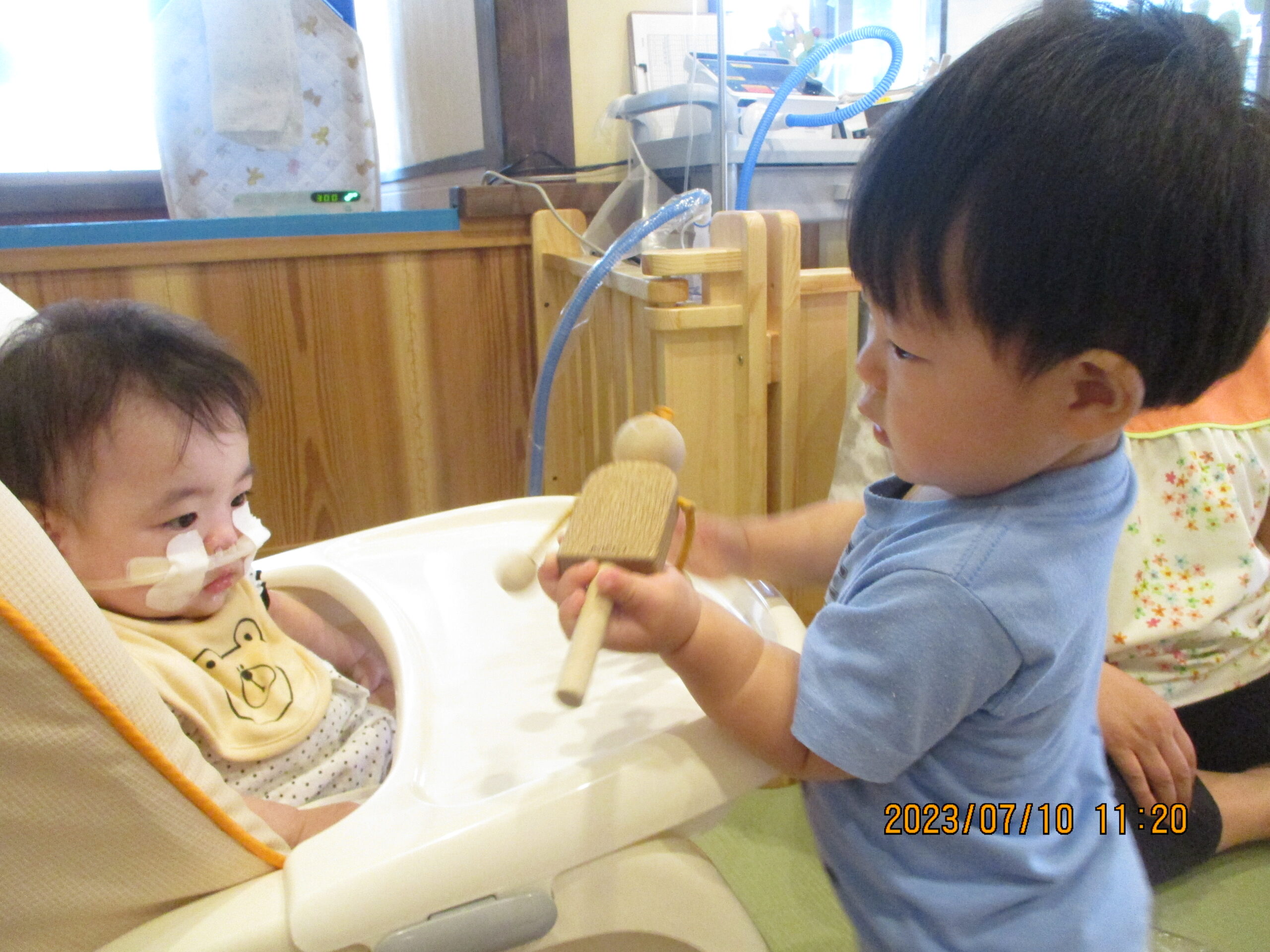 友達に遊具をプレゼントしています! 小さな声でそっと話しかけていました。 今日も、元気いっぱいで遊びましたよ♪