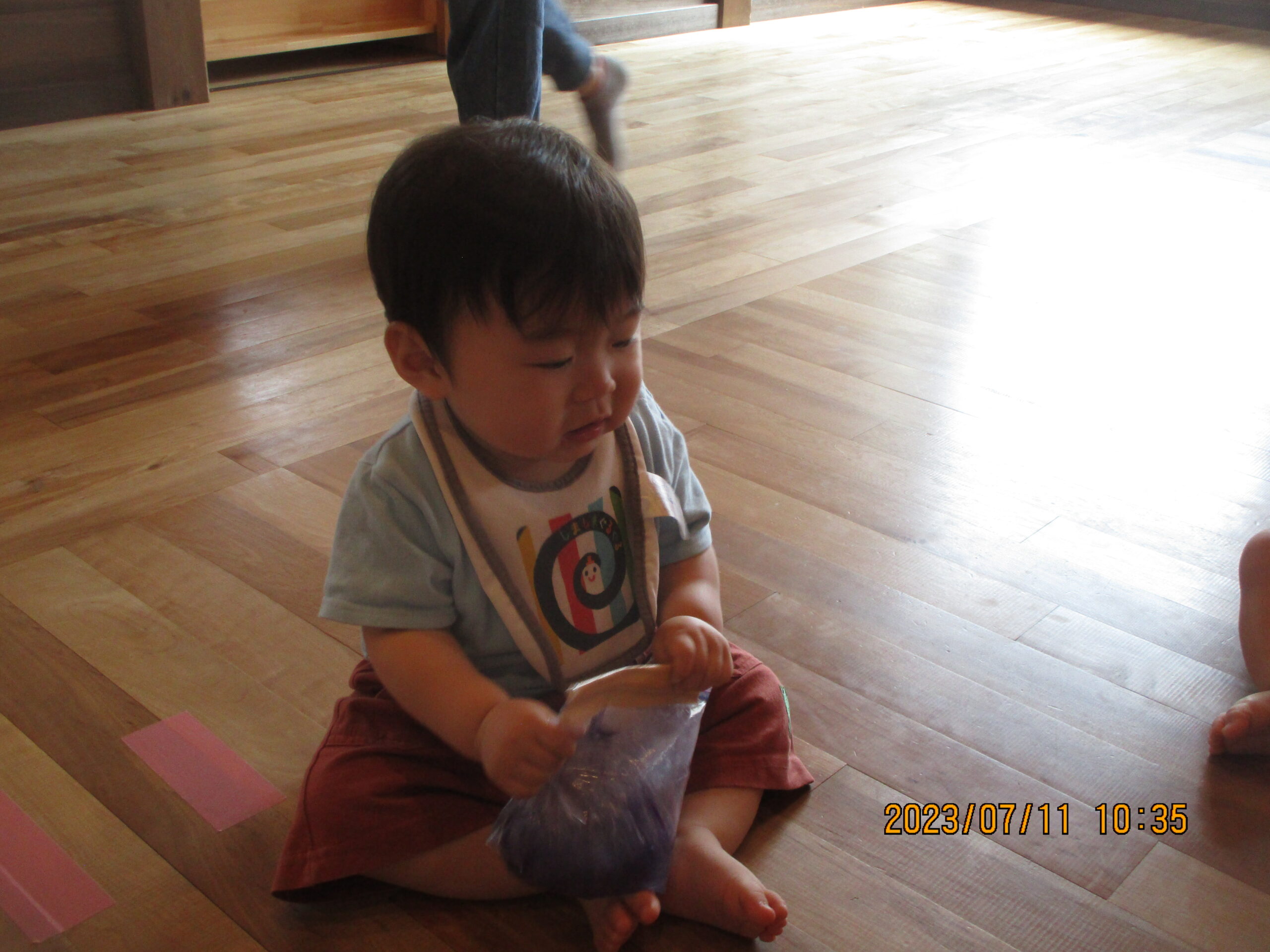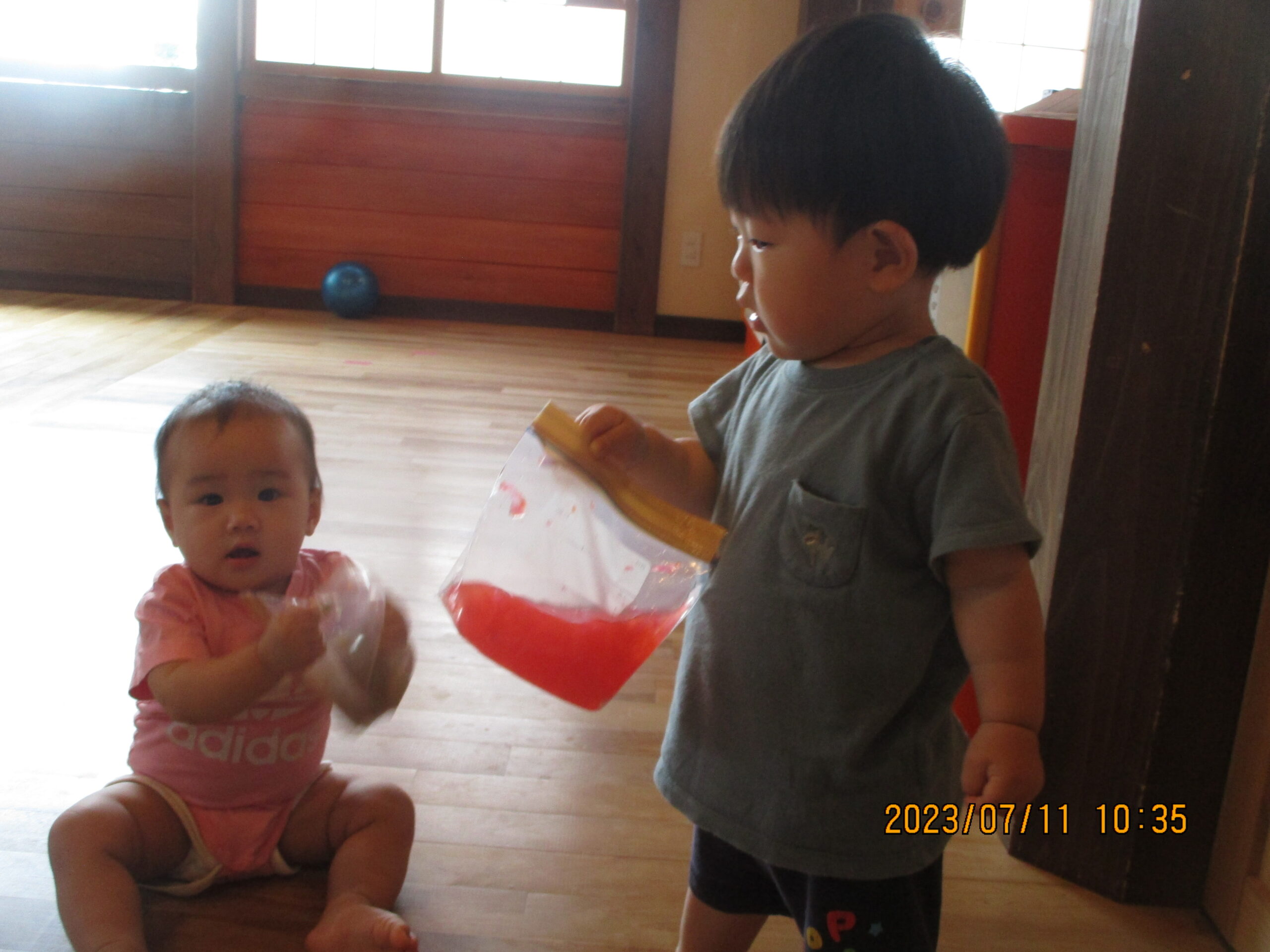 見ていることに気が付いたお兄さんお姉さんが、 プレゼントしてくれました。 色水入りの袋の触り心地は、ひんやりとしていて 気持ちよかったですよ!
