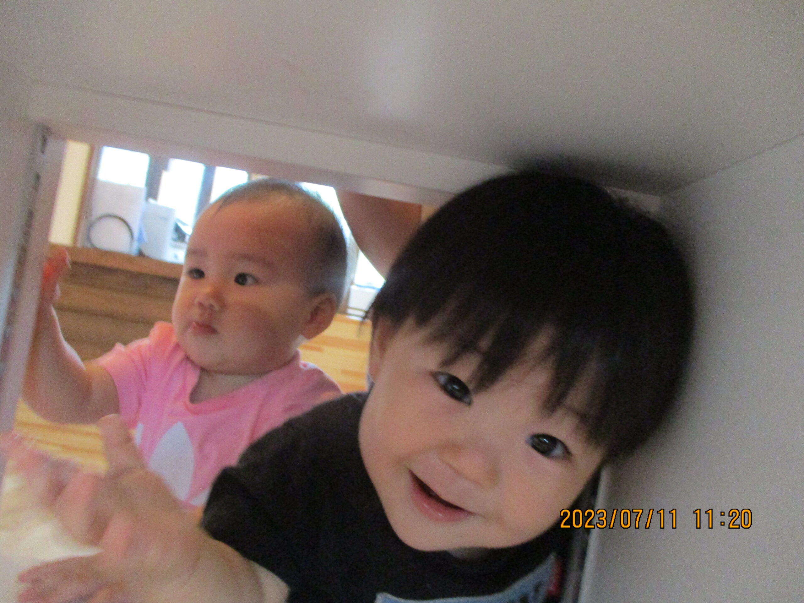 今日は、ボール遊びをしました。 遊んでいる途中で棚からお兄さんお姉さんの様子をのぞけることを 知った子ども達。