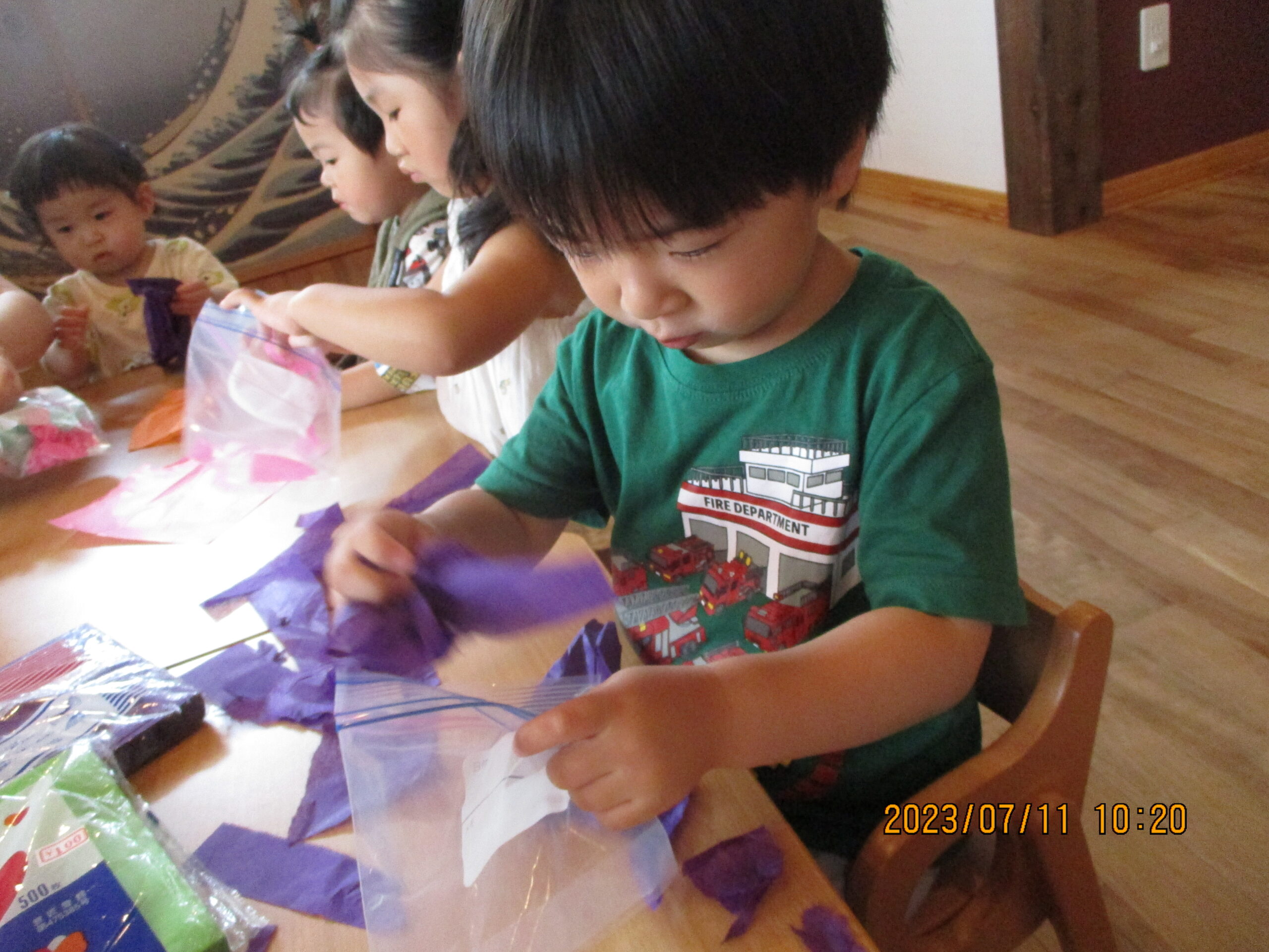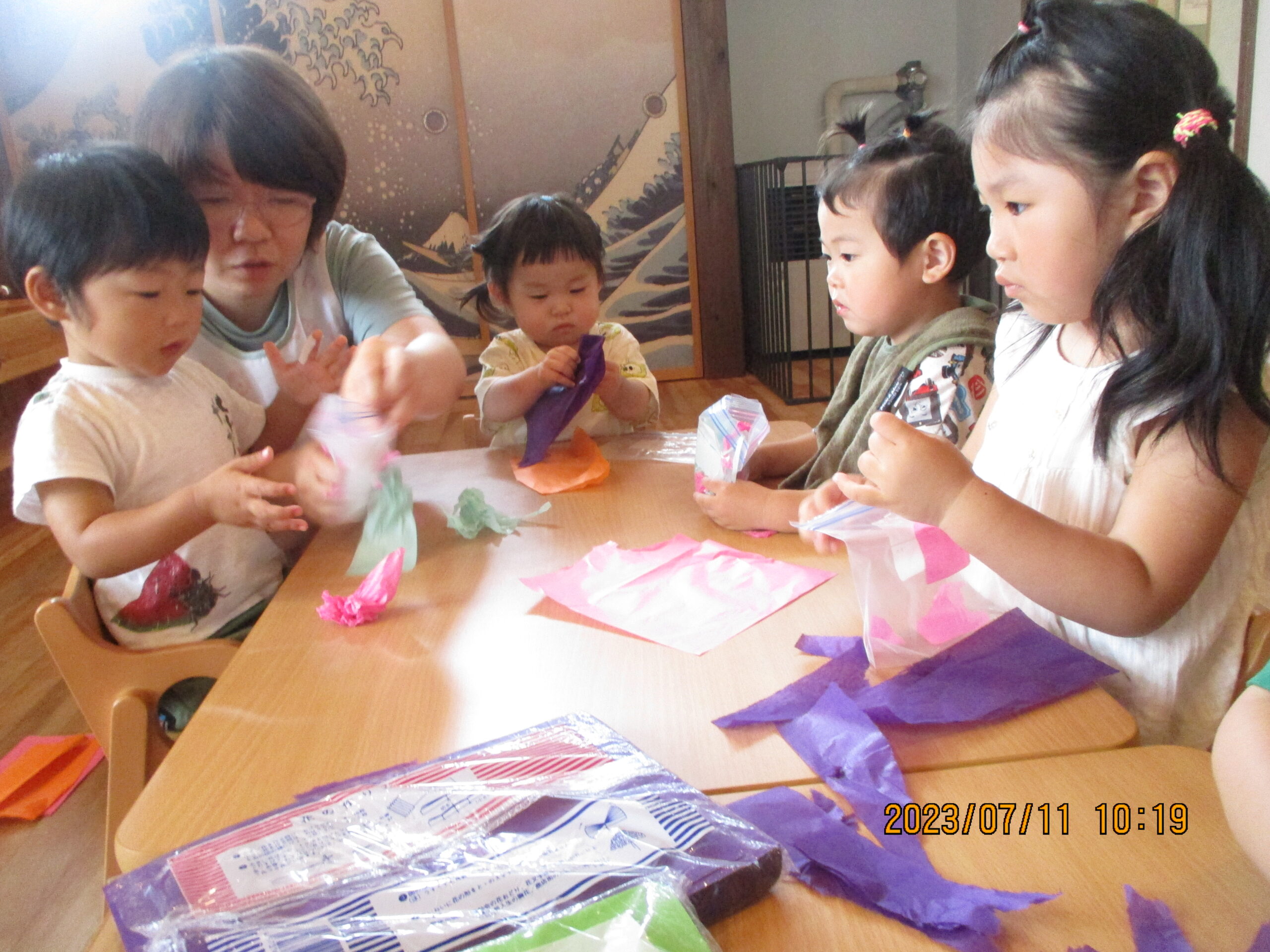 今日は、花紙を使って色水を作ったよ。早くやりたくて興味津々の皆。好きな色の花紙を選んで小さくちぎりました。