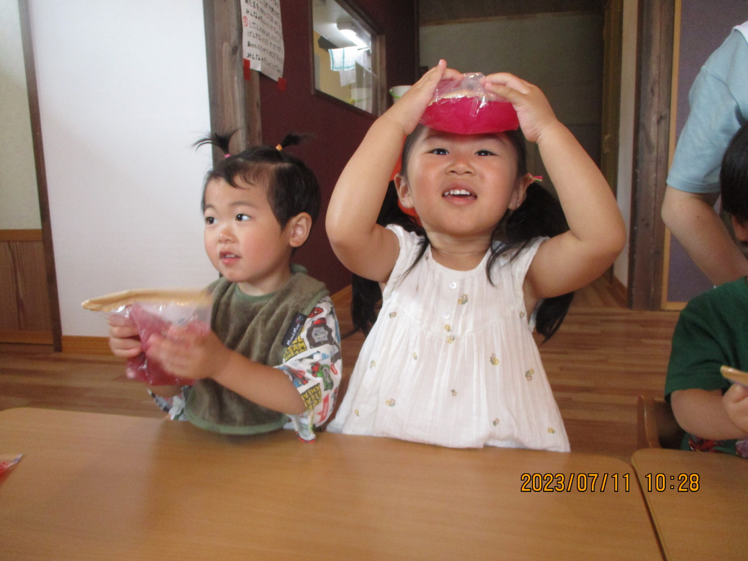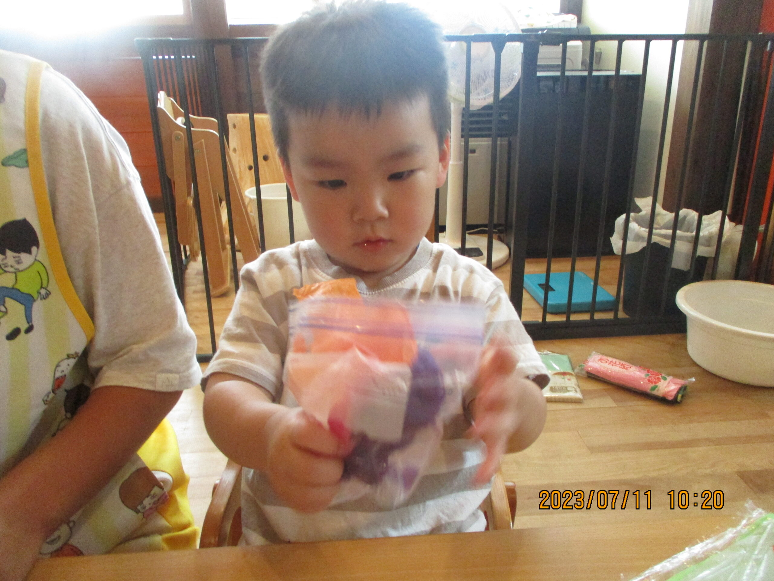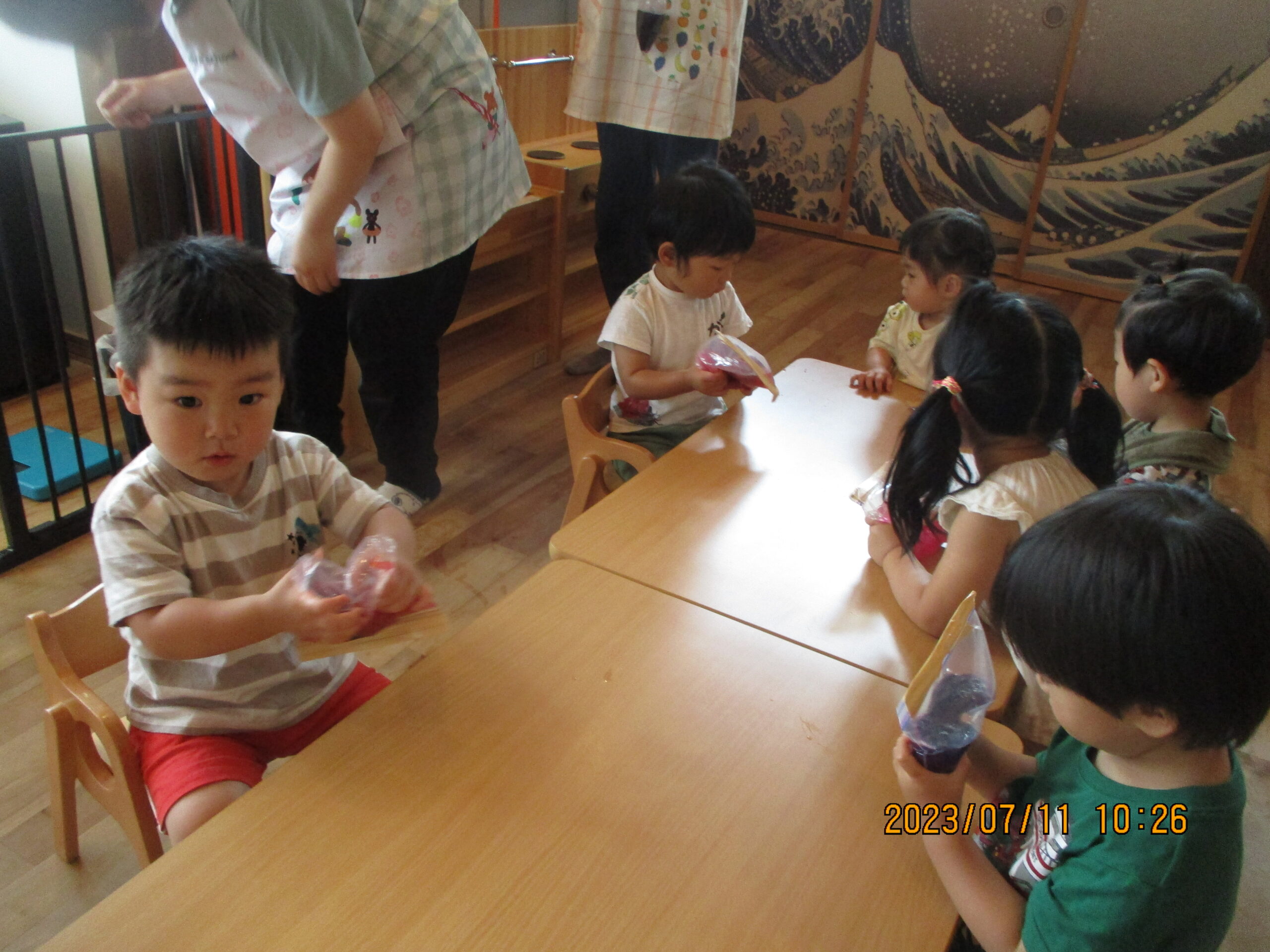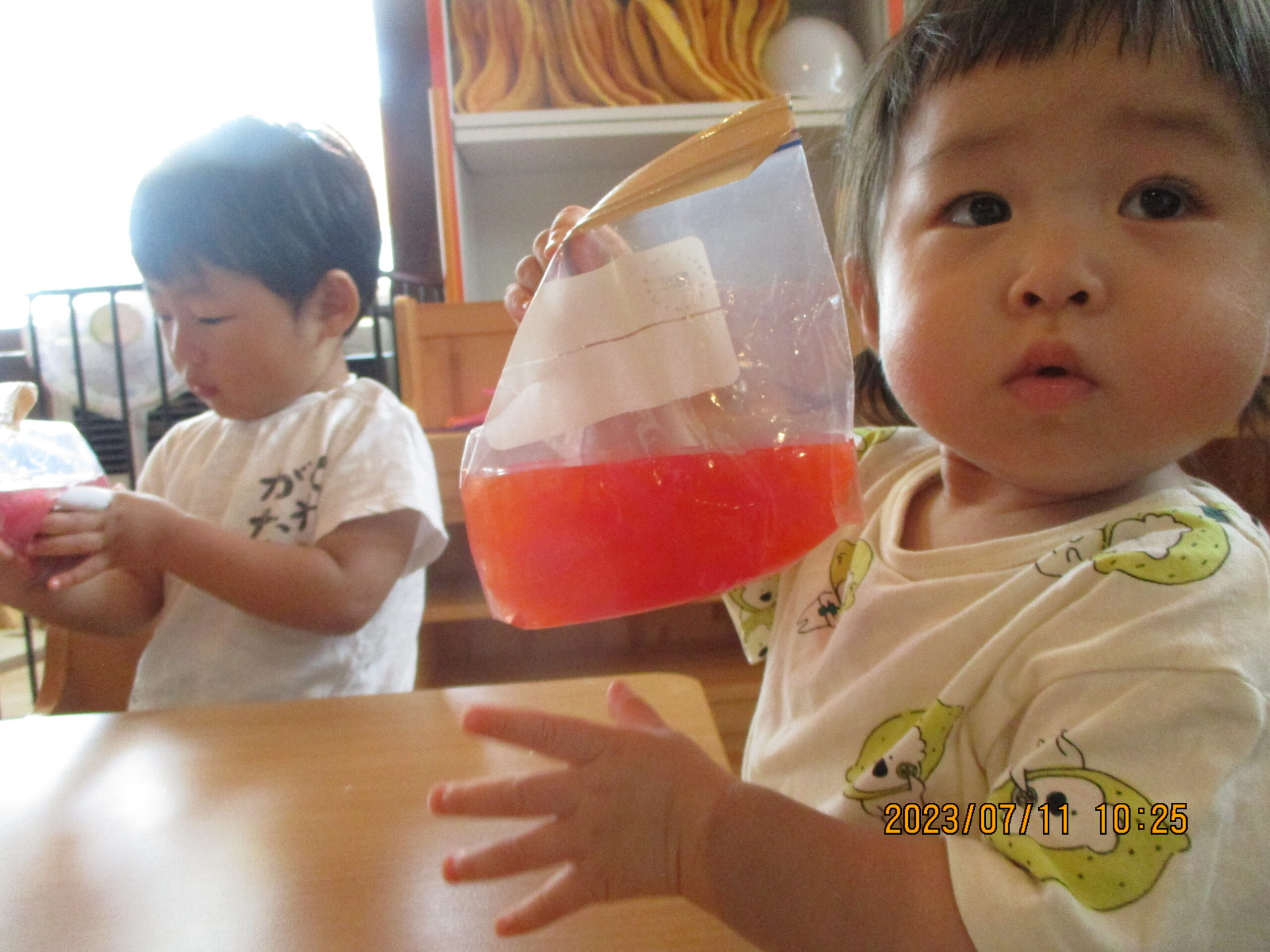 ペットボトルに入れてみると美味しそうなジュースに。袋から出した色水を触って楽しそうな姿がみられましたよ。