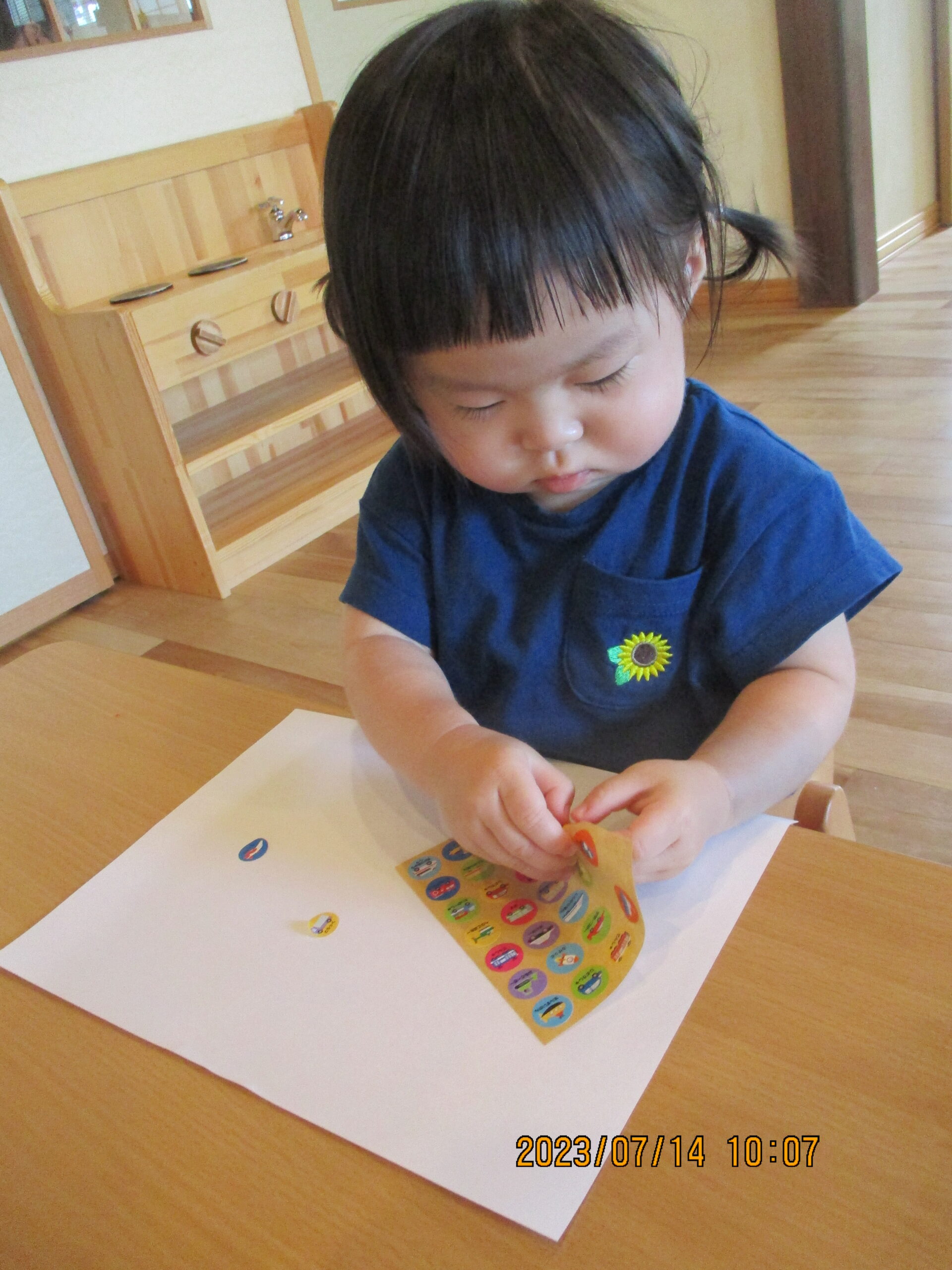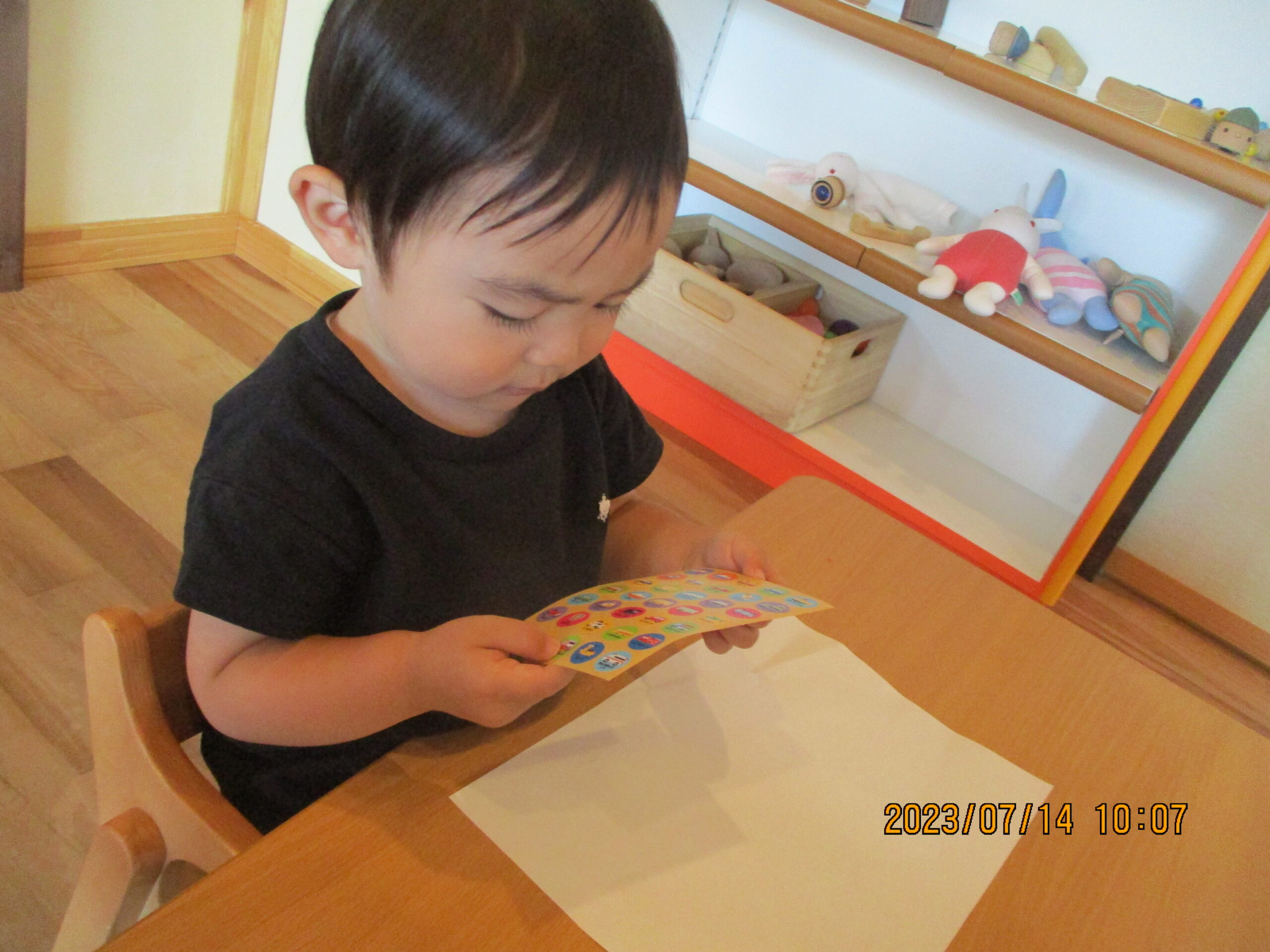 今日はシール貼りをしました。初めてのお友達もいましたが、2人ともとても上手にシールを貼っていましたよ!!