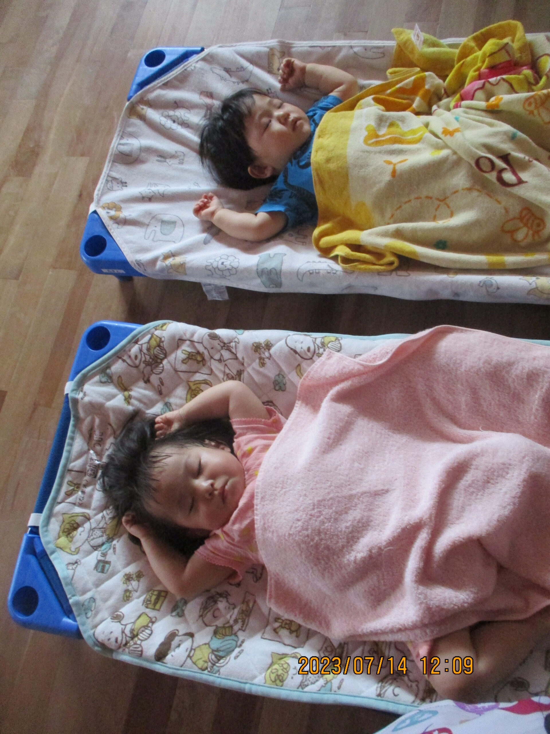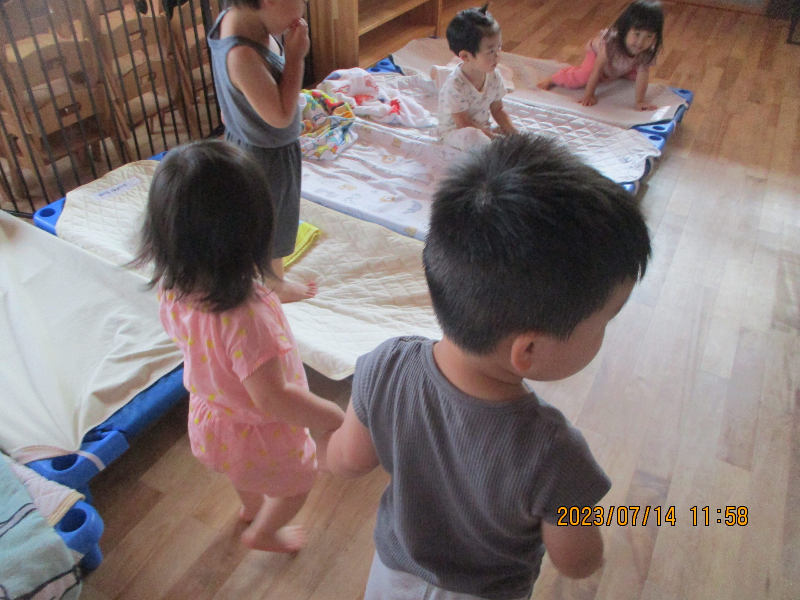 給食のあとはお昼寝の時間。くるみ組のお兄さんがくり組さんのお友達と手を繋ぎ一緒にお布団まで行く可愛い姿も見られましたよ。