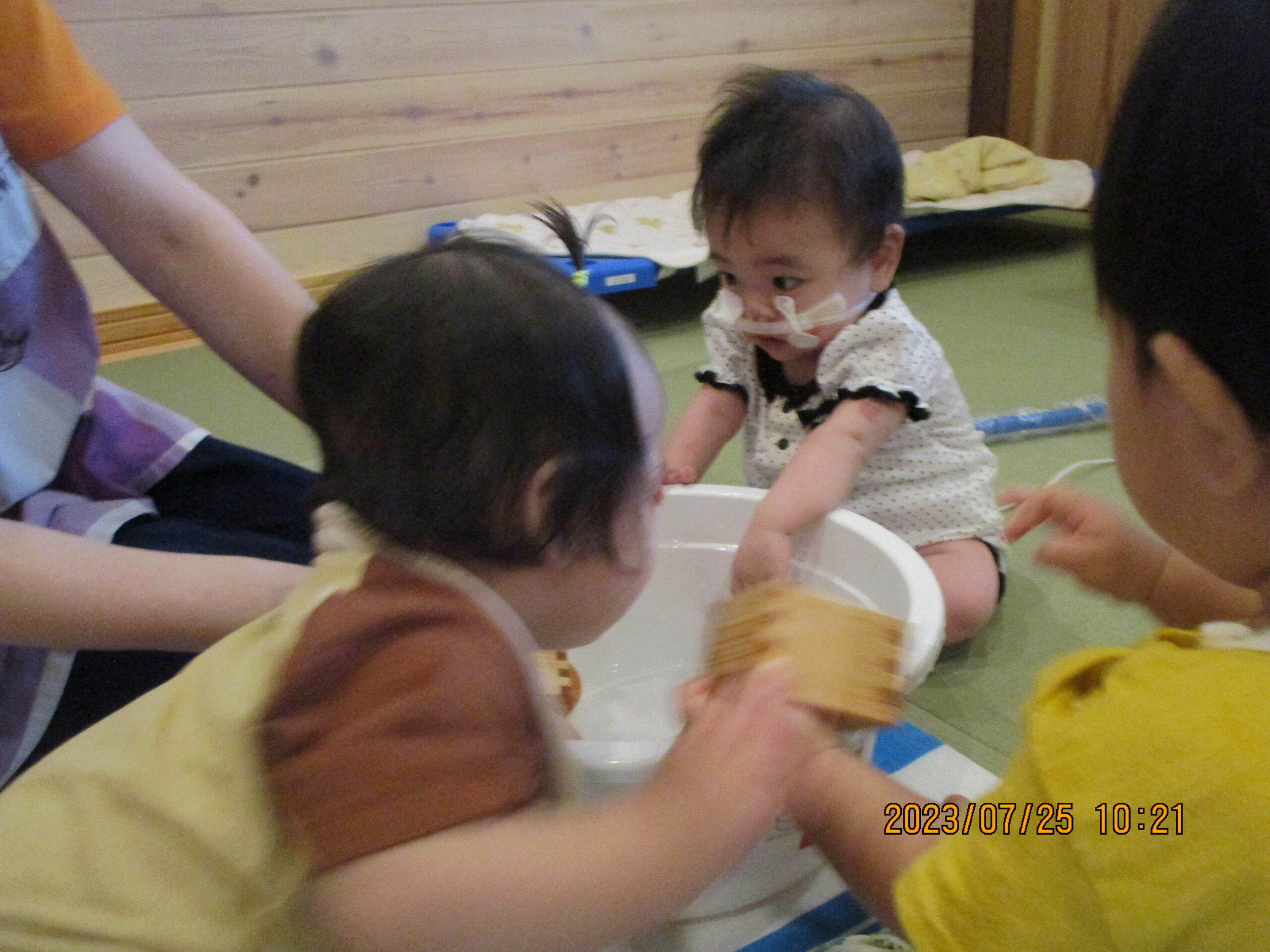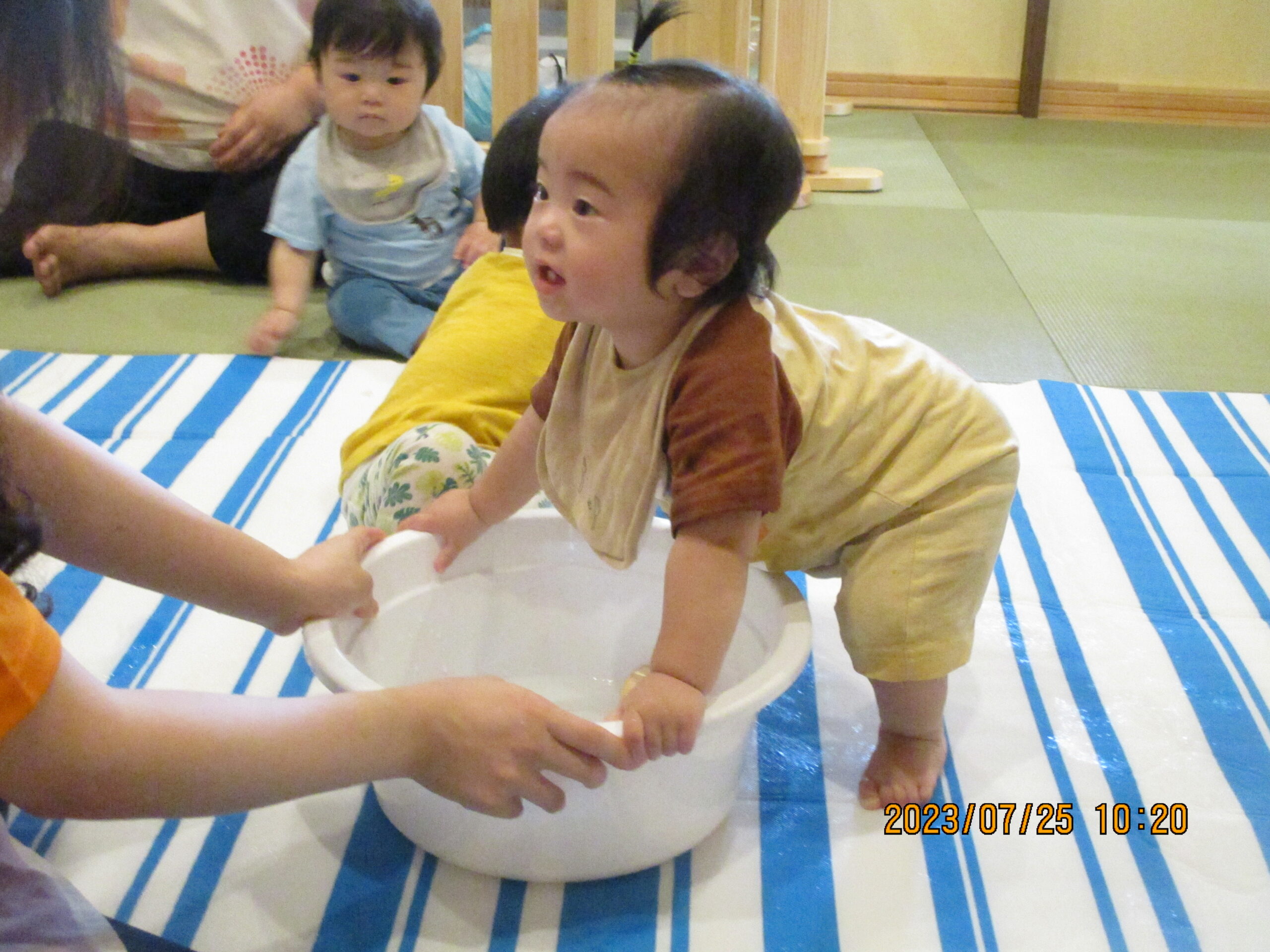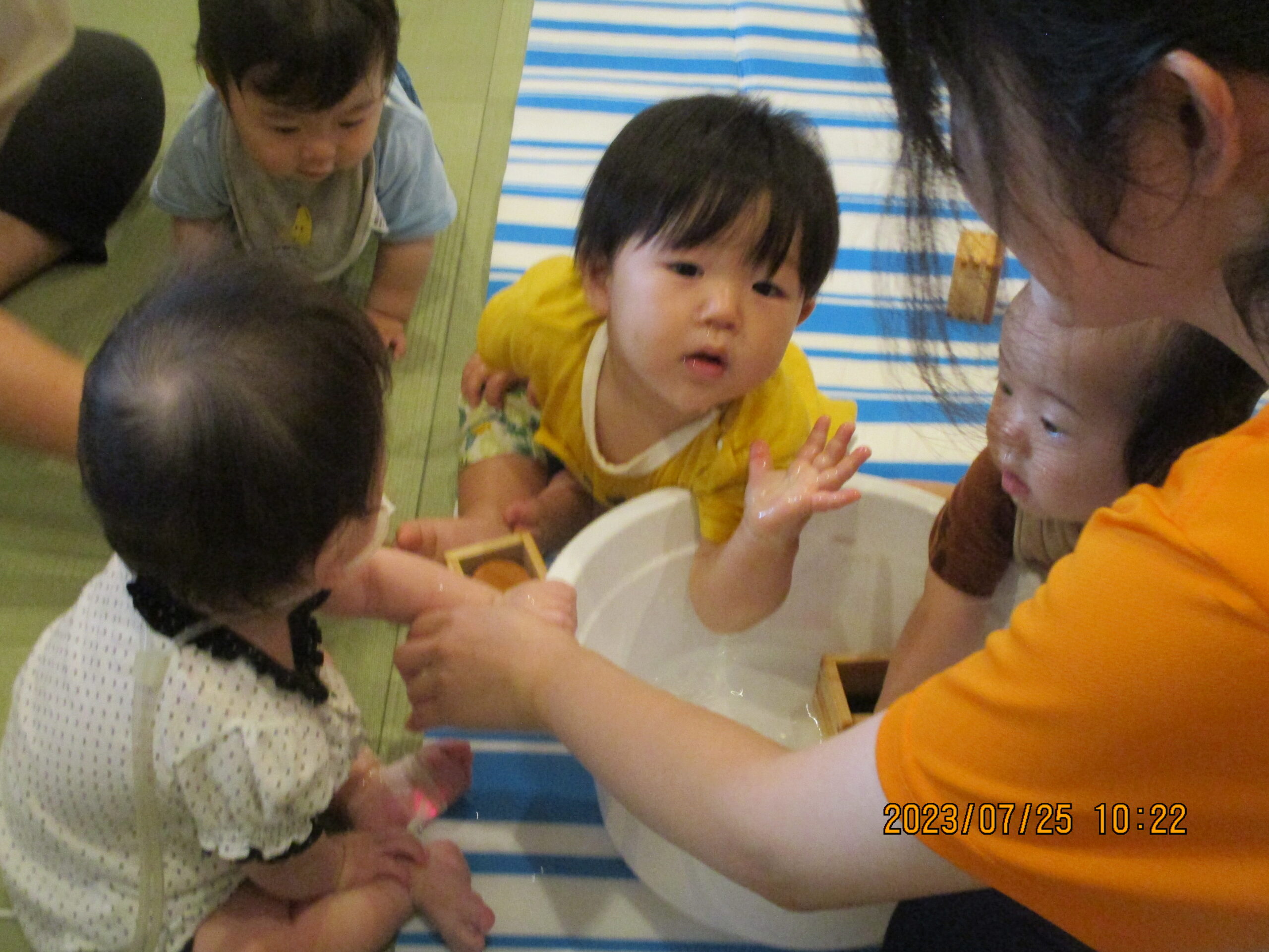 職員が水の入ったタライを出すと、子ども達は 何も言わずとも集まり、水を触りにきました。