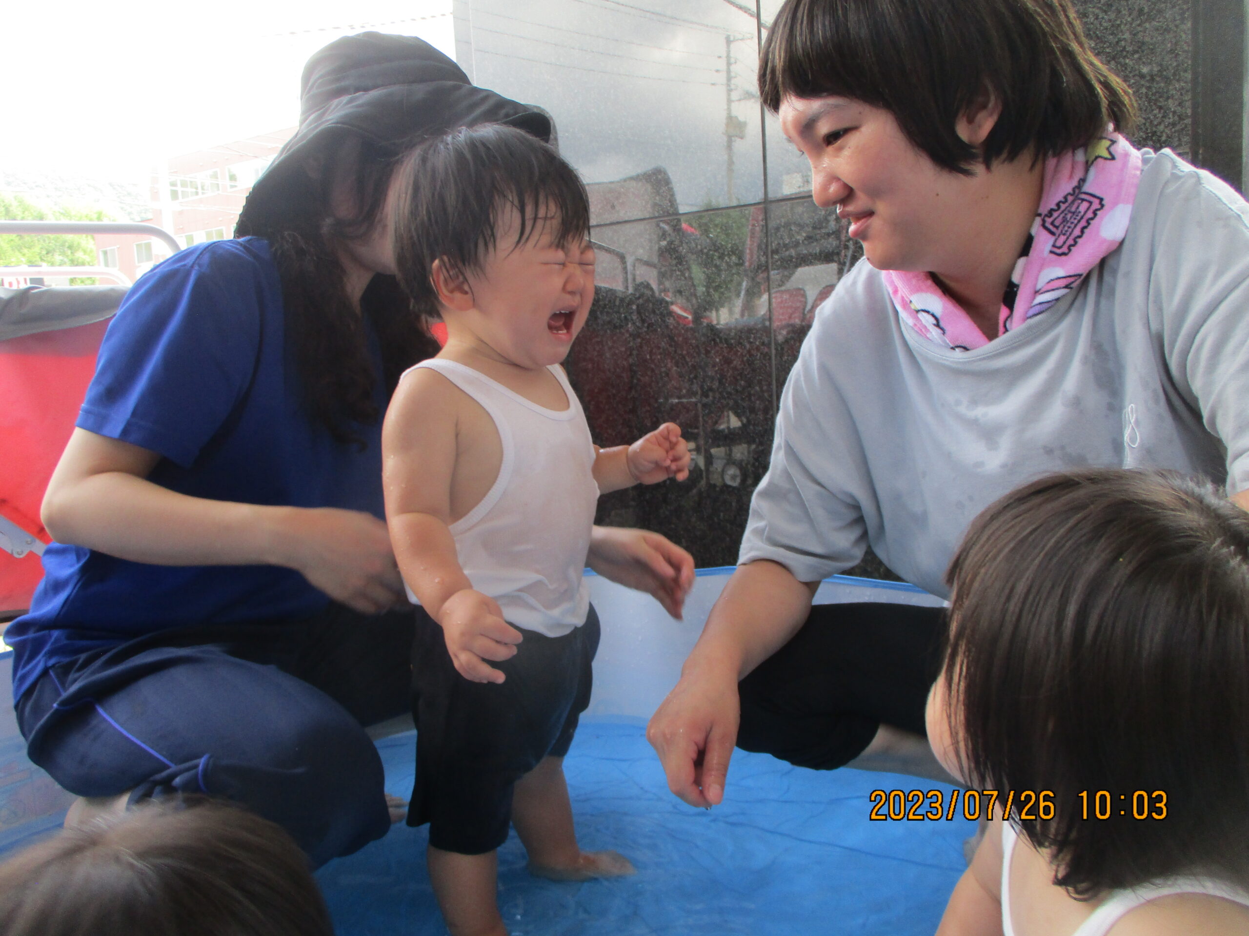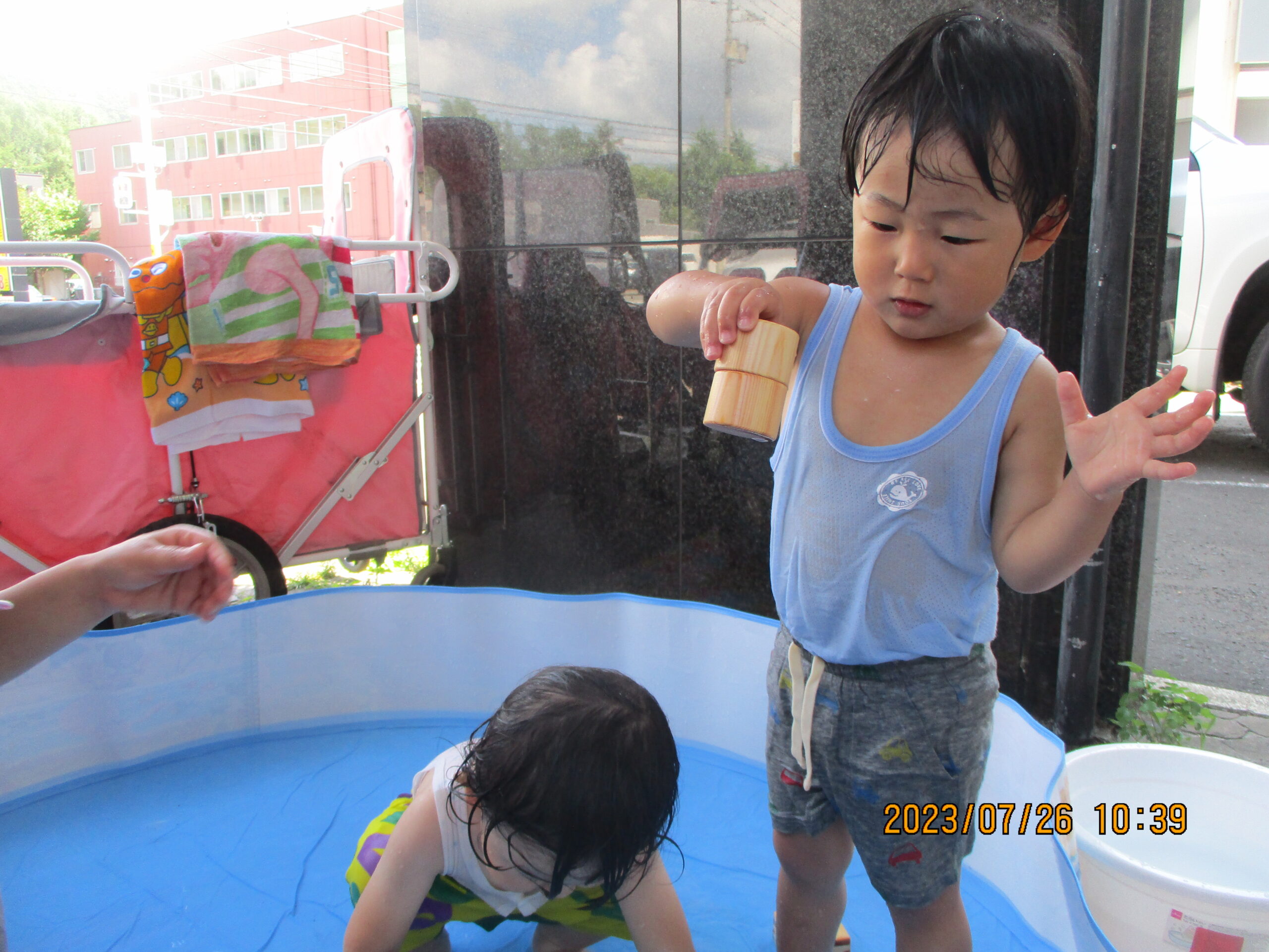 今日は暑かったので水遊びをしました♪初めての子もいましたが、お友達や保育士と楽しく遊んでいましたよ。