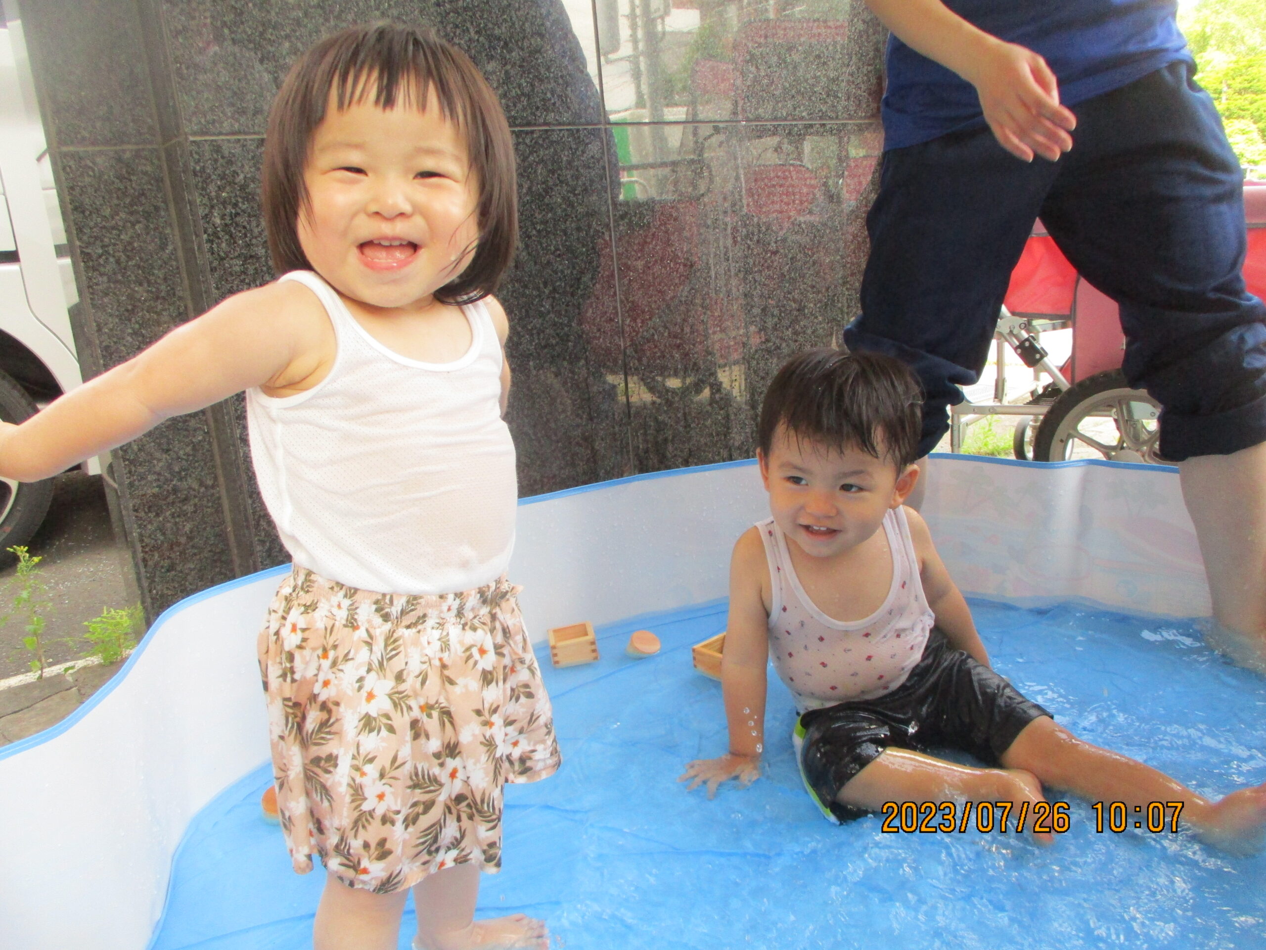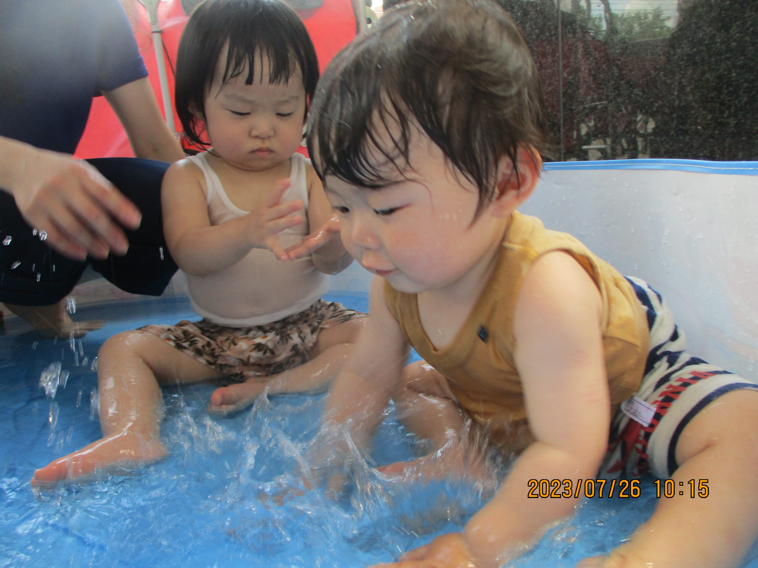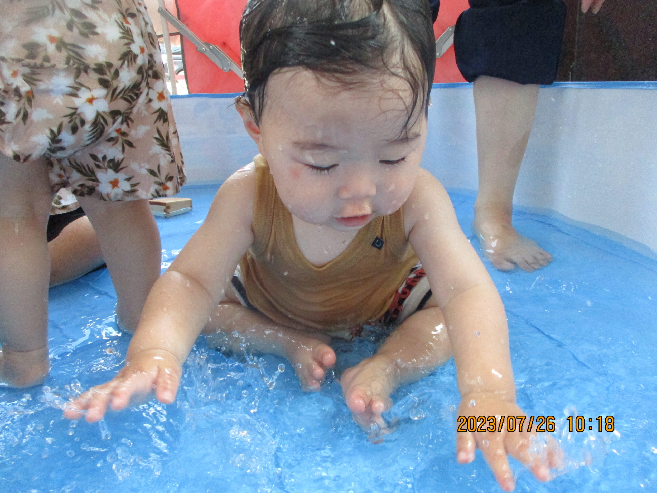水の中に入ると、水の中に手を入れバシャバシャしたり、お友達と水のかけあっこを楽しんでいる姿も見られました。