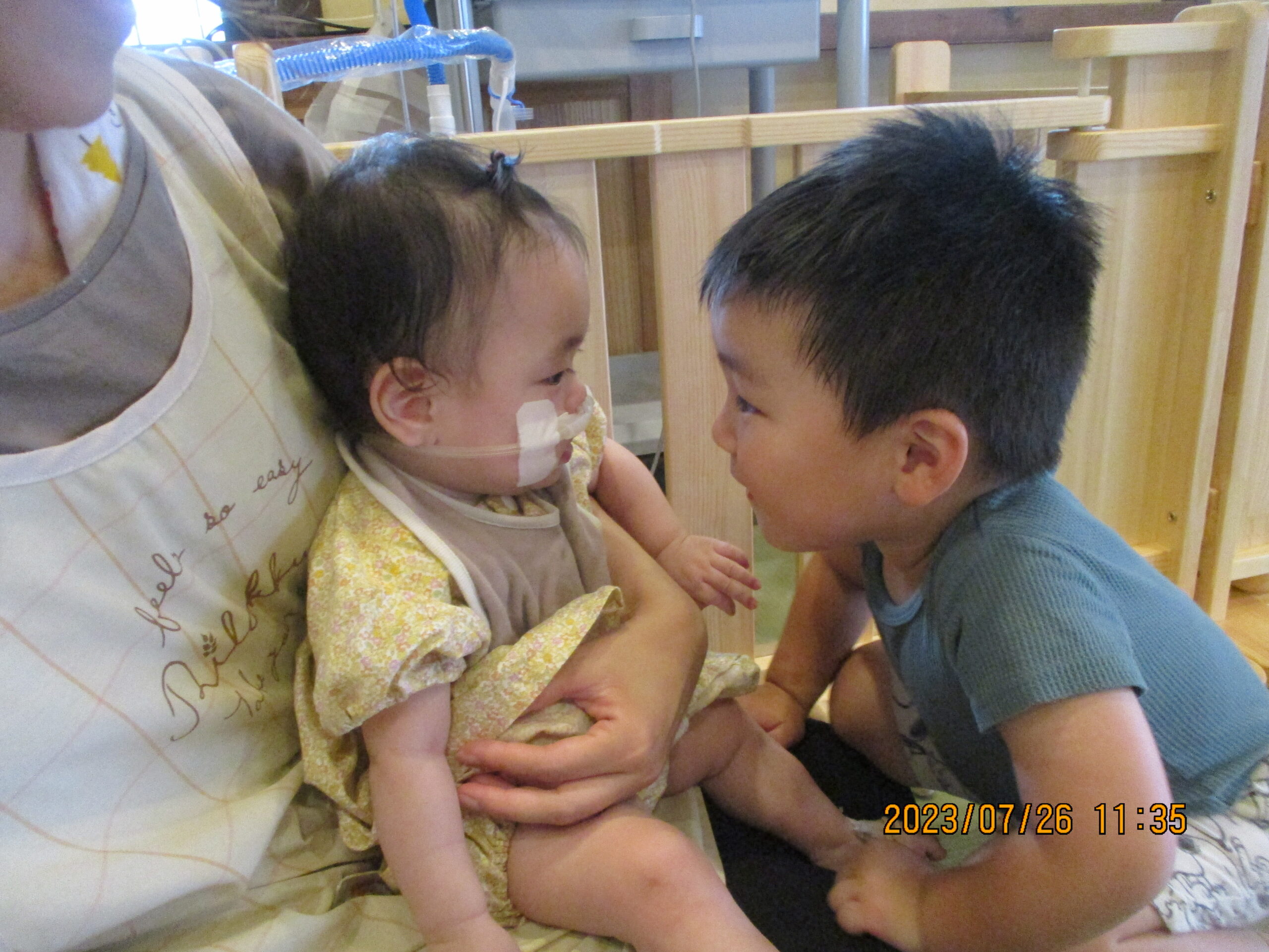 給食を食べ終わりお着替えをしていると・・・。くるみ組のお兄さんがどんぐり組のお友達と見つめあっている可愛い姿も見られました!