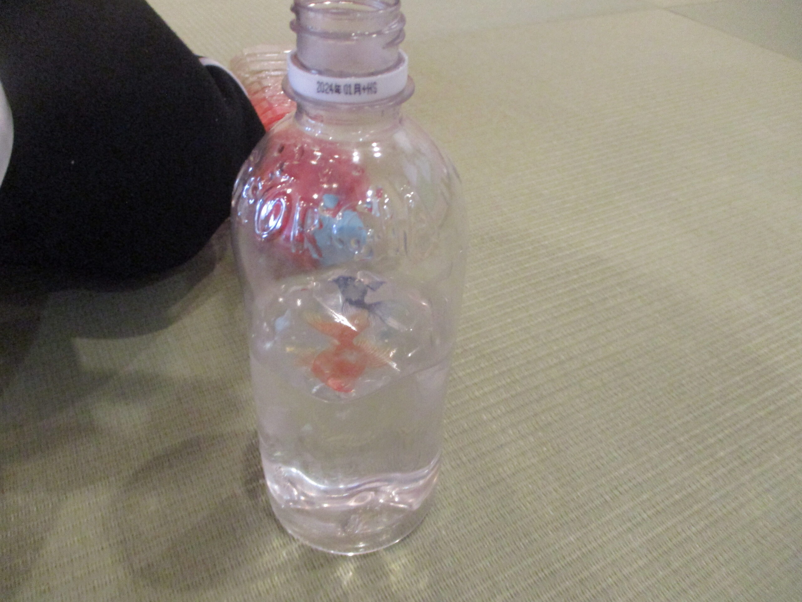 今日は、昨日に引き続き、ペットボトルの冷たい水に金魚などのキラキラとしたフィルムを入れて