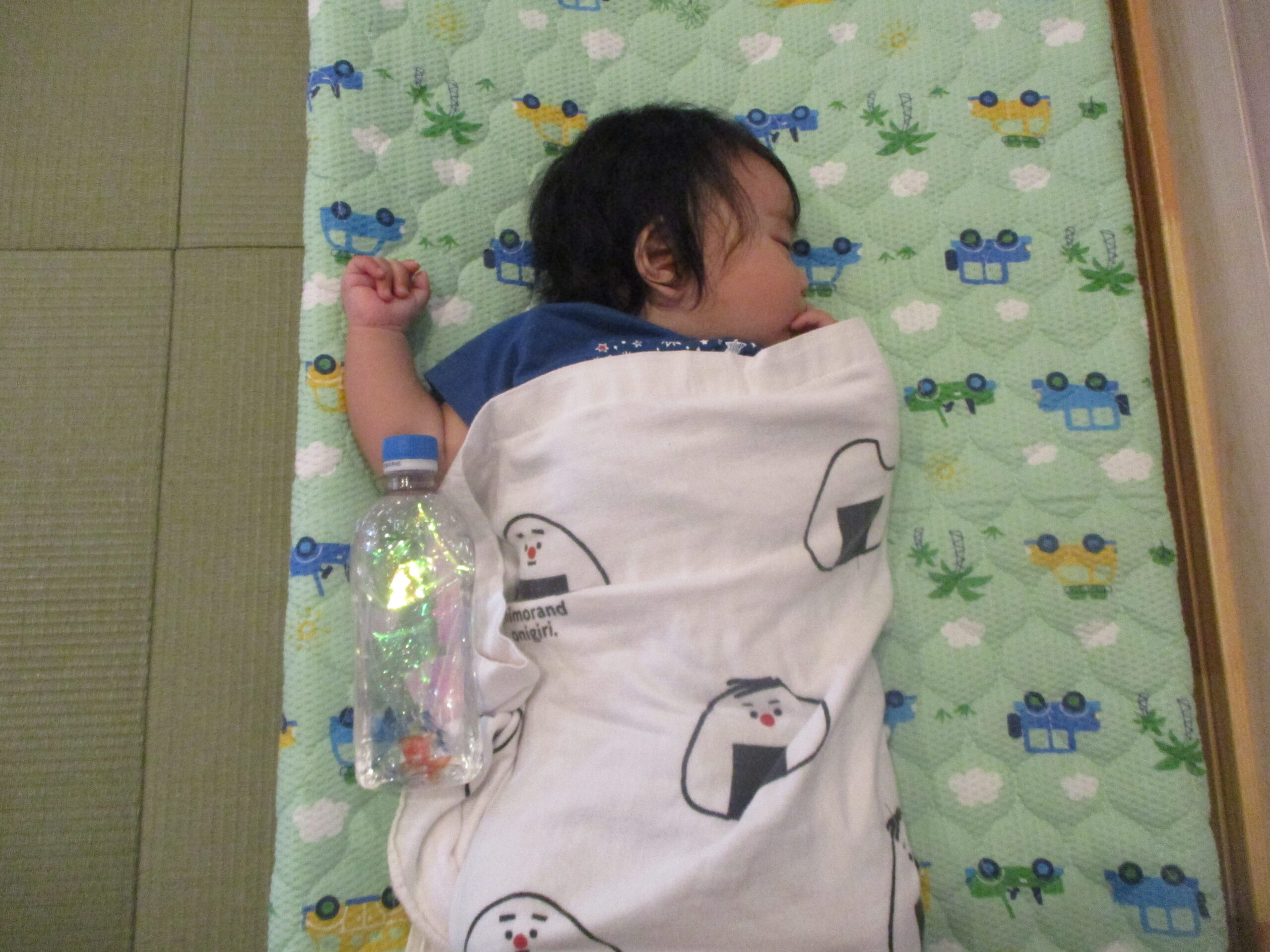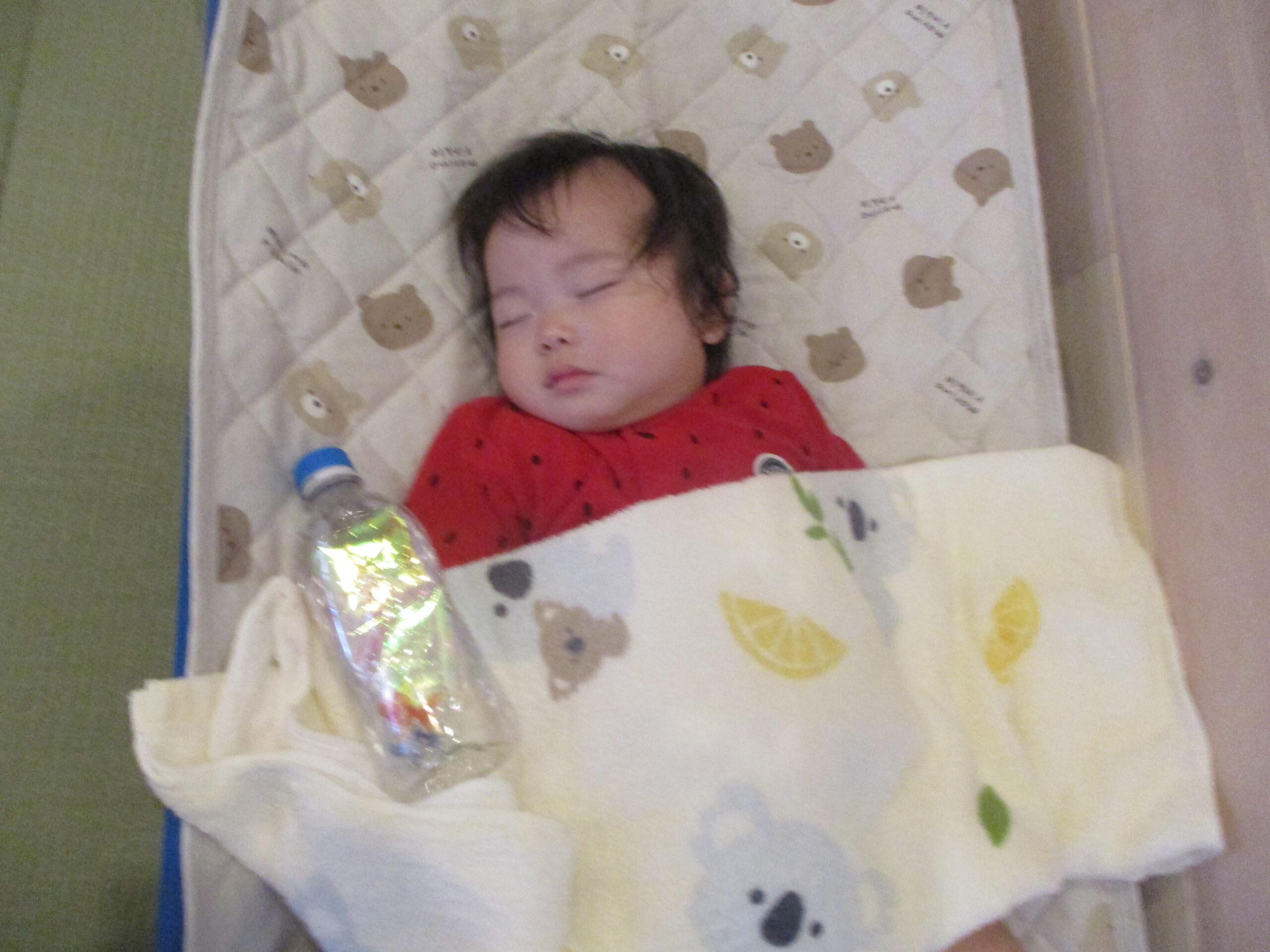 寝ている二人にも、タオルの上からほんのり冷たいペットボトルを置いてみました。