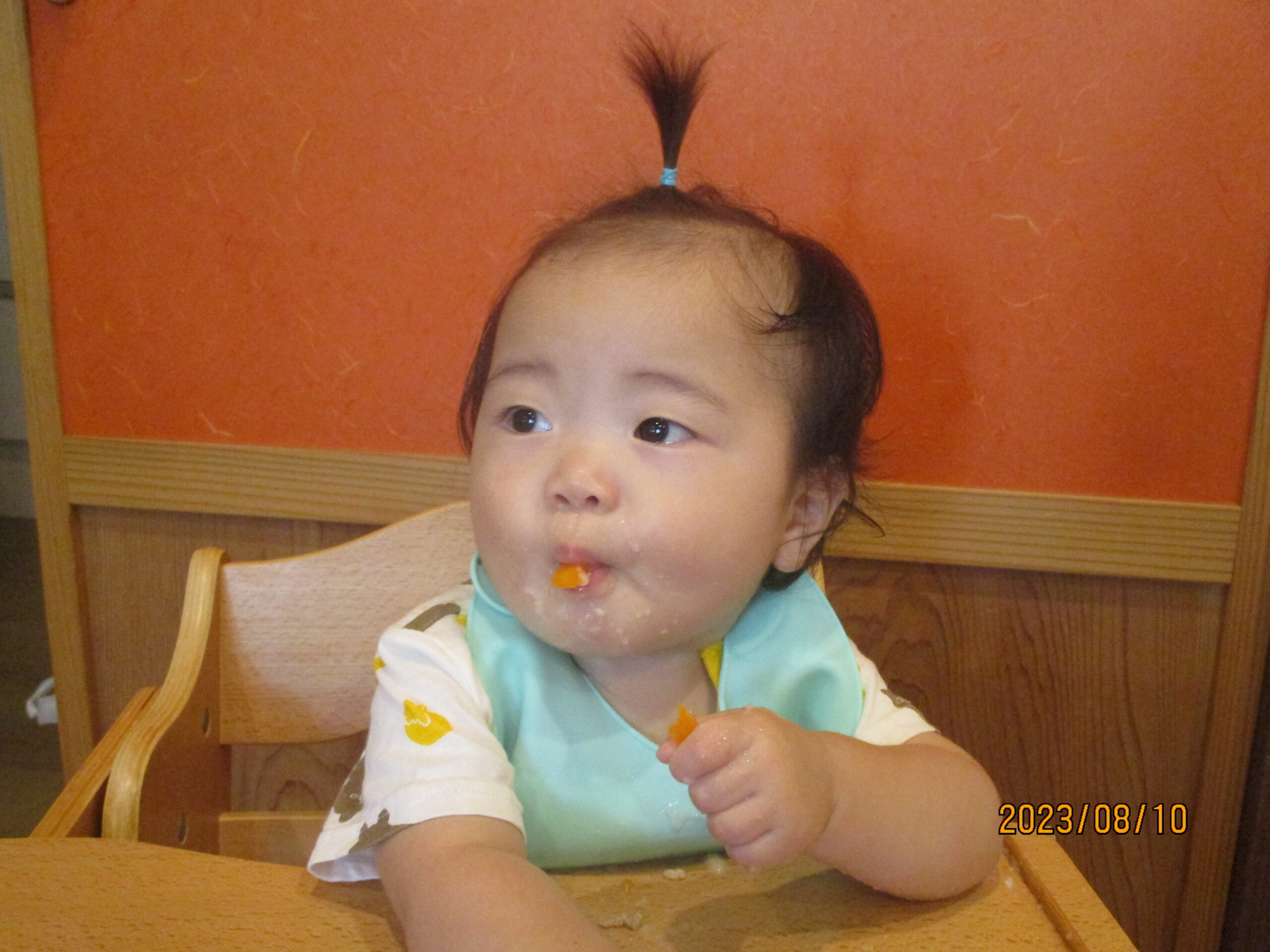 野菜を、もりもりと食べています。最近では嚙む動作が上手になり、手づかみで食べる姿が増えてきています!
