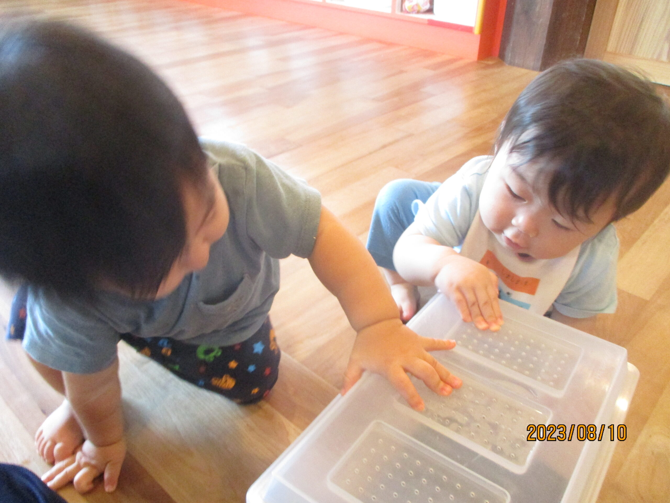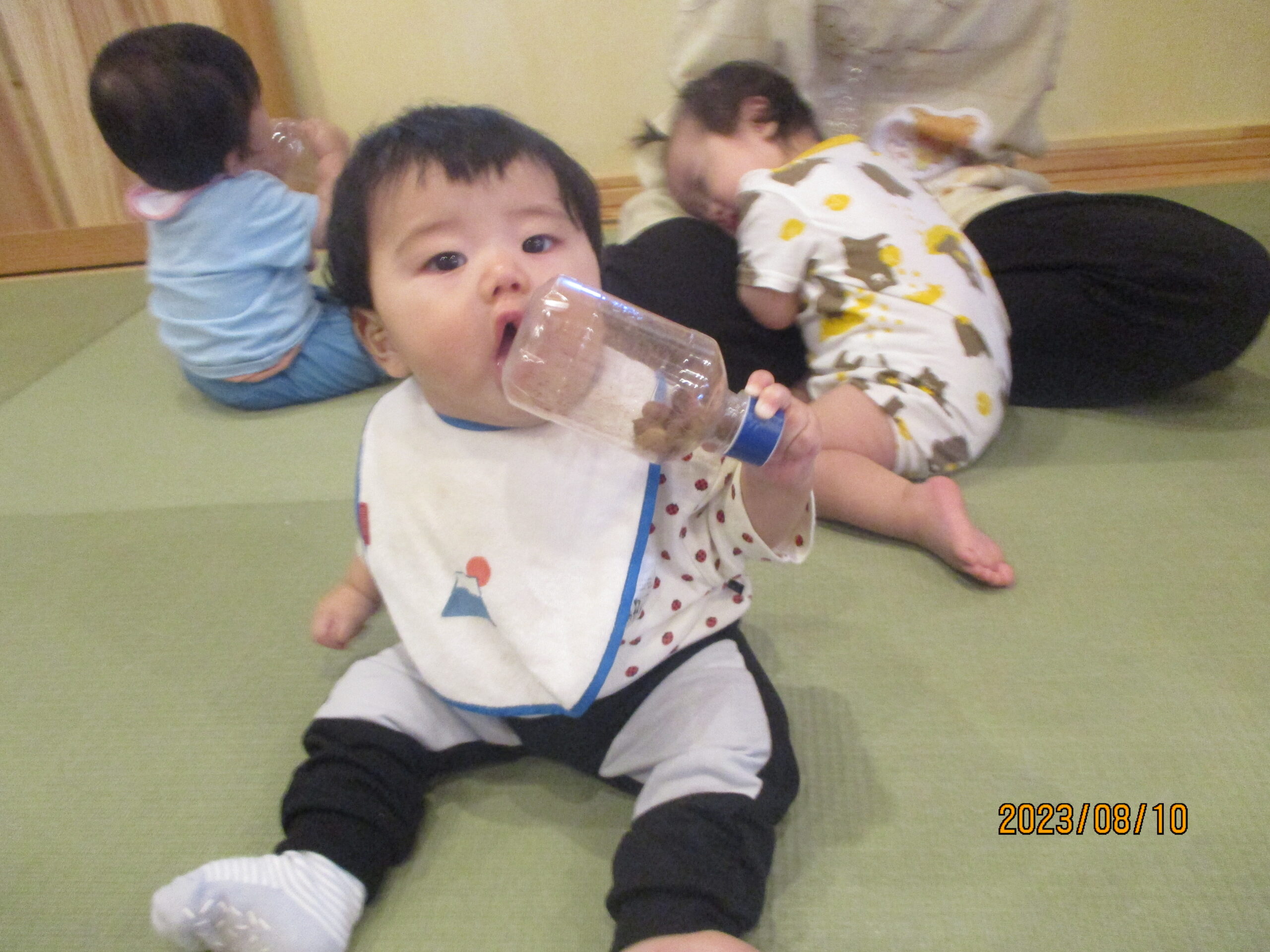 ご飯後、まどろみの時間です。どんぐりマラカスを振って音を楽しんでいる子どもと…。