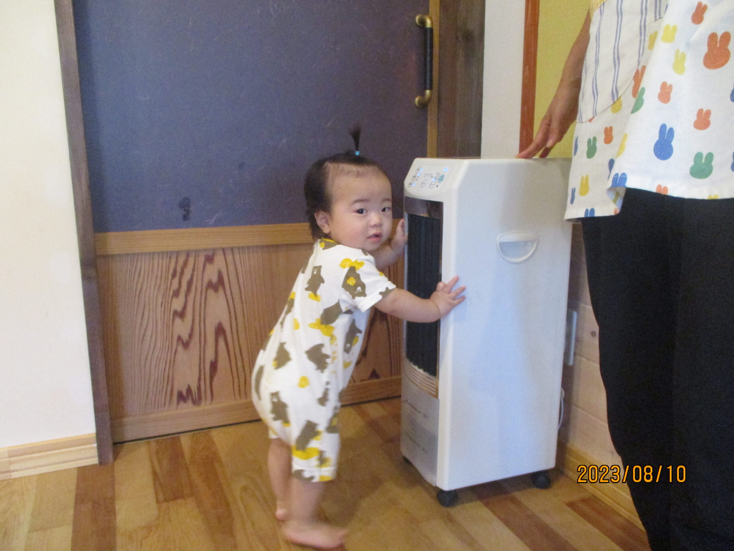 冷風機から冷たい風が来ることを知っていて、子ども達が代わる代わるやって来ます。