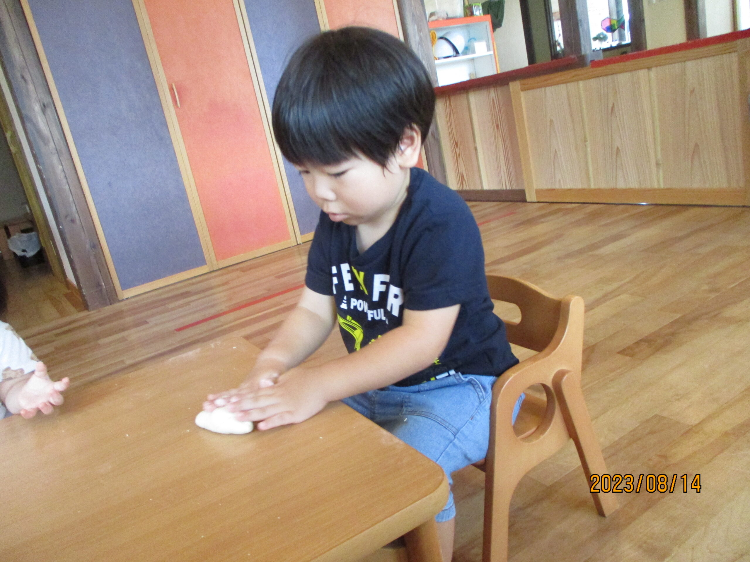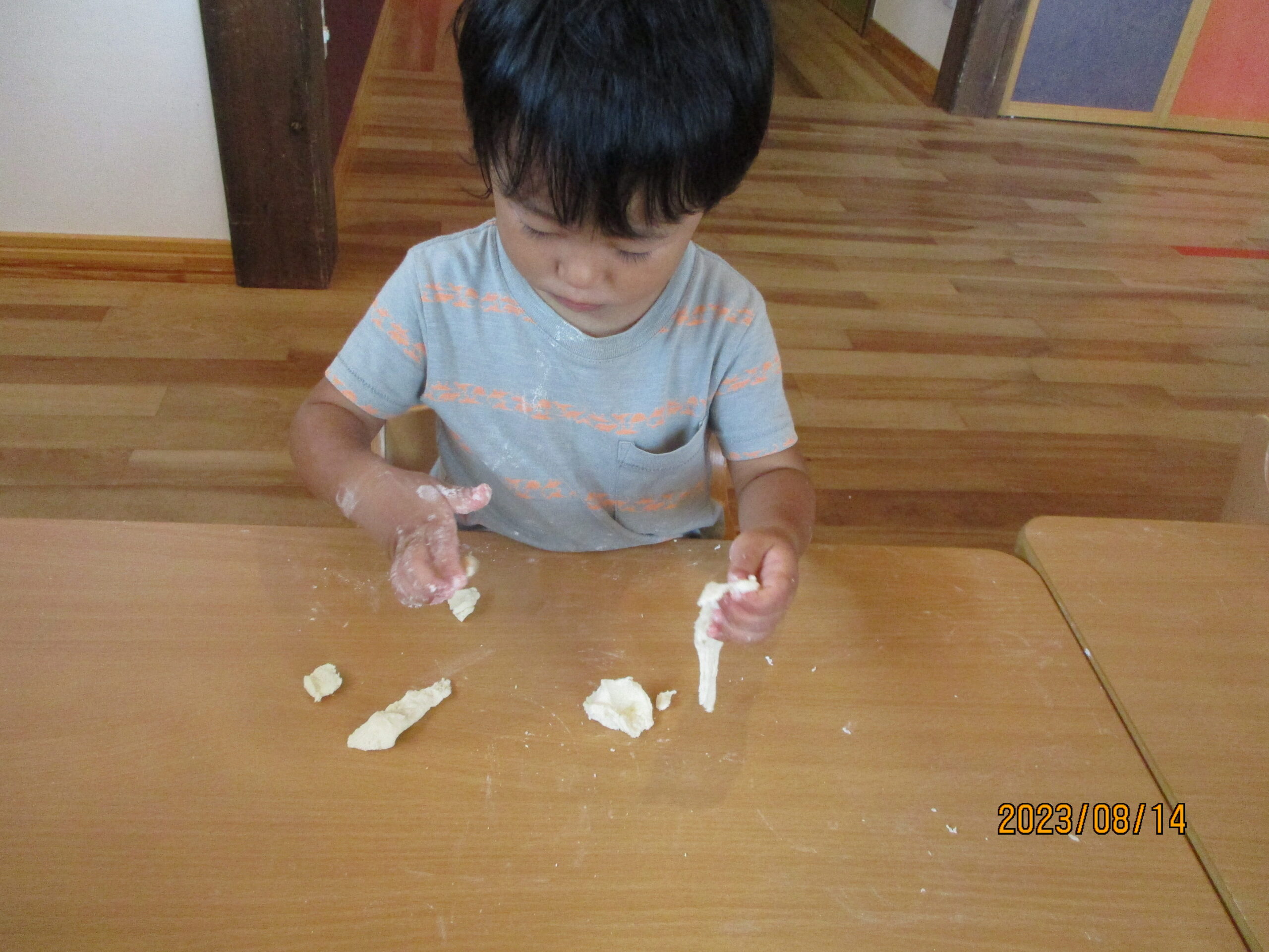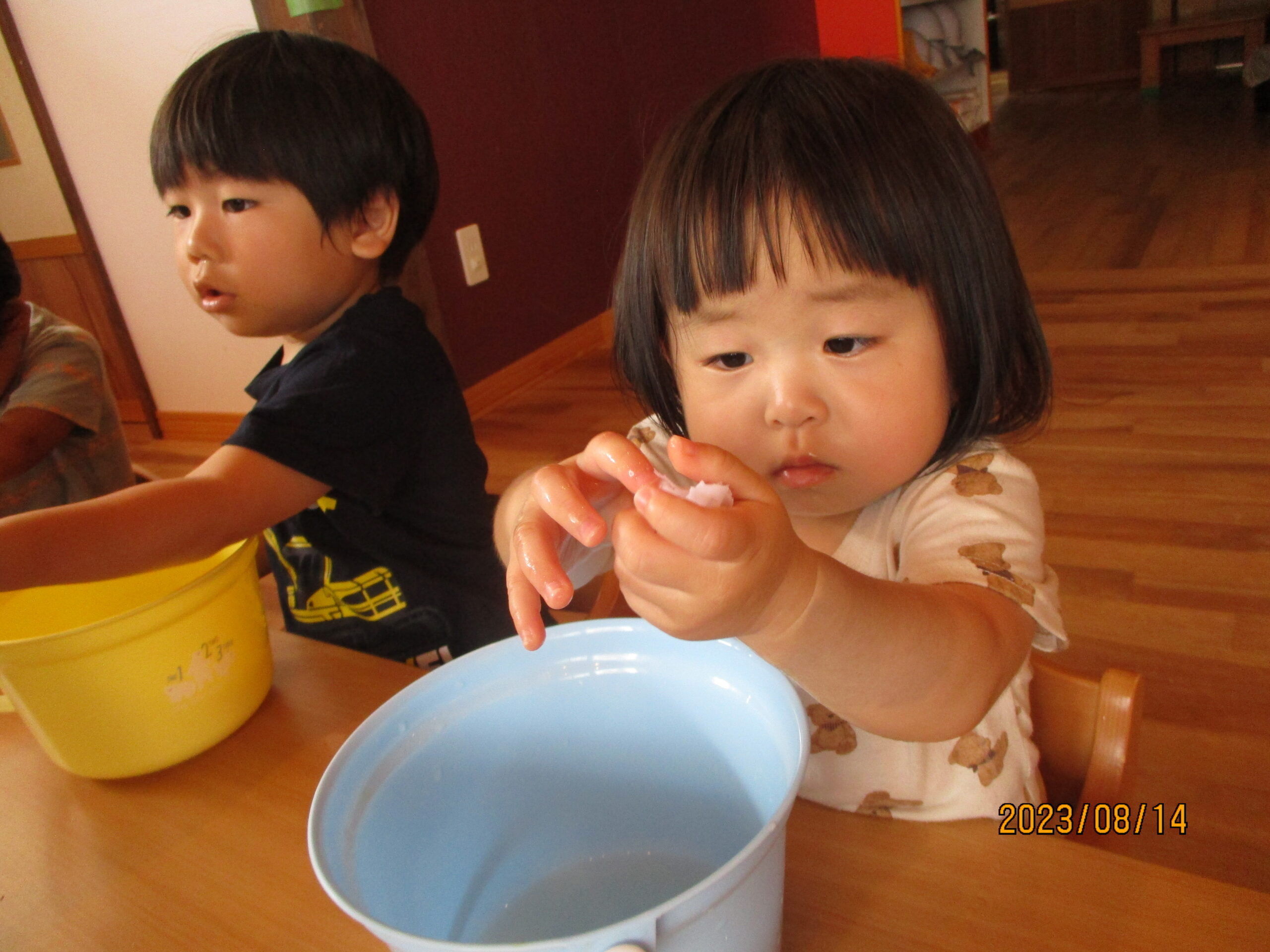 今日のくり組、くるみ組の活動では、小麦粉粘土や、色水遊びをしました。 小麦粉粘土では、丸めたり潰したり、伸ばしたりと感触を味わいながら遊んでいましたよ。