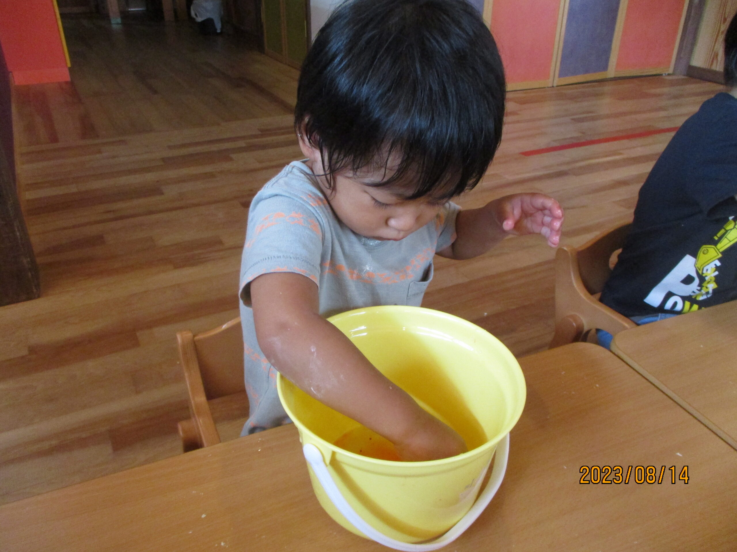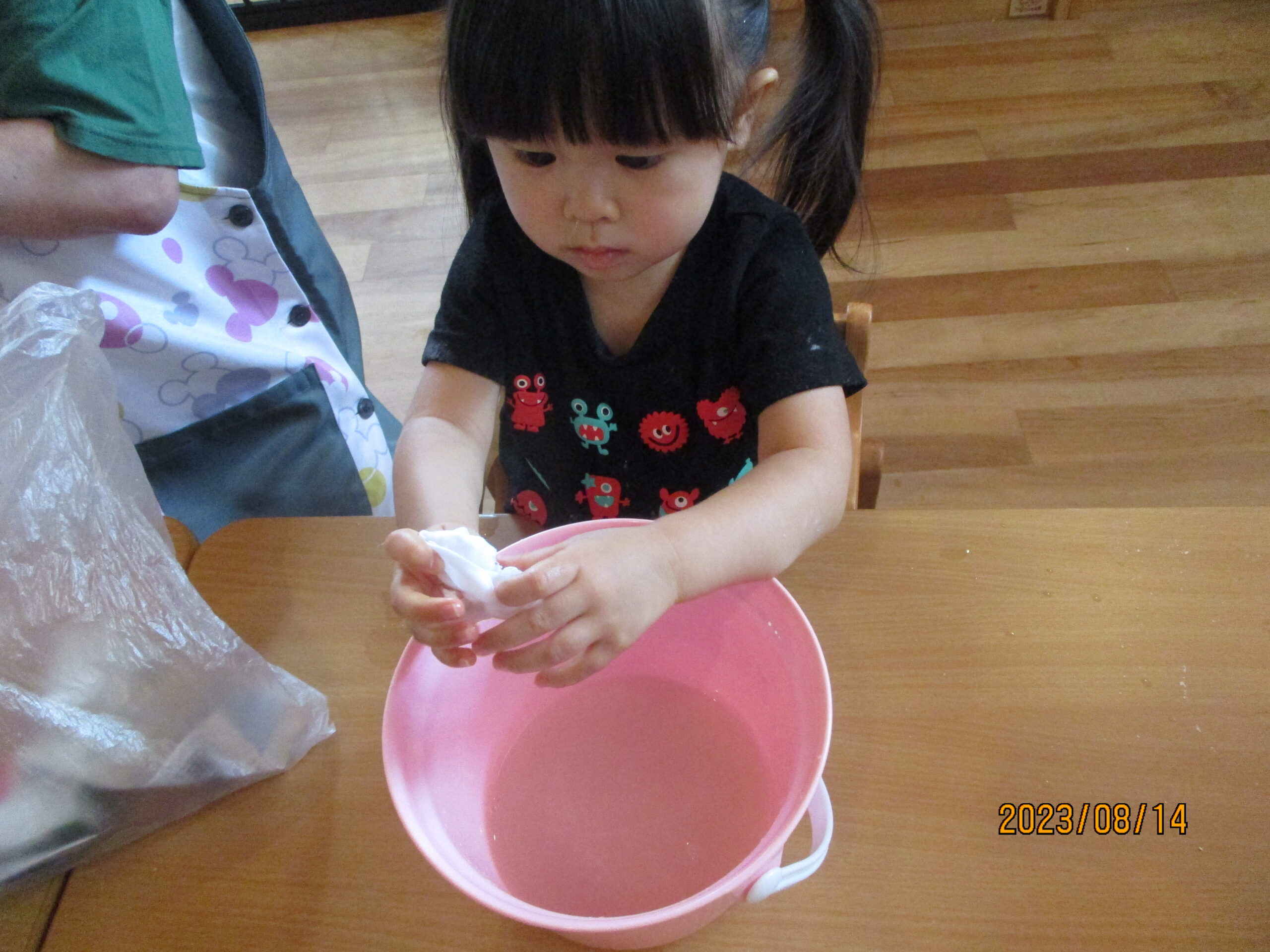 色水遊びでは、バケツの中に水と食紅を入れ、布を入れると布の色が変わる。と言う変化を楽しみながら遊びました。布の色が変わると不思議な顔で遊んでいた子ども達でした。