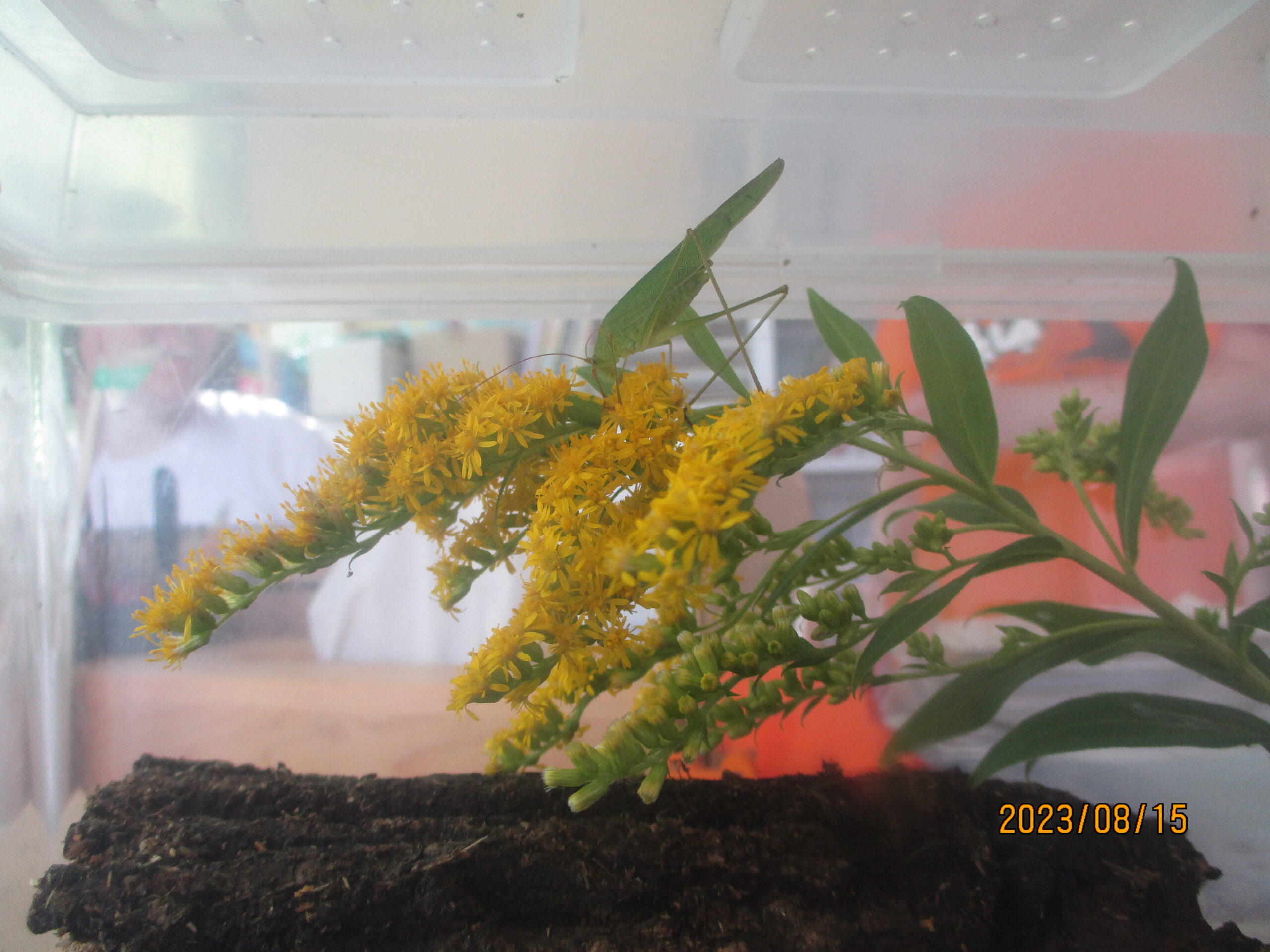 そして、つゆむしについて調べたところ、セイタカアワダチソウを好むことが分かり、お花を入れてお家をリフォームしました。お花を食べて以前より元気に跳び回るようになりました。