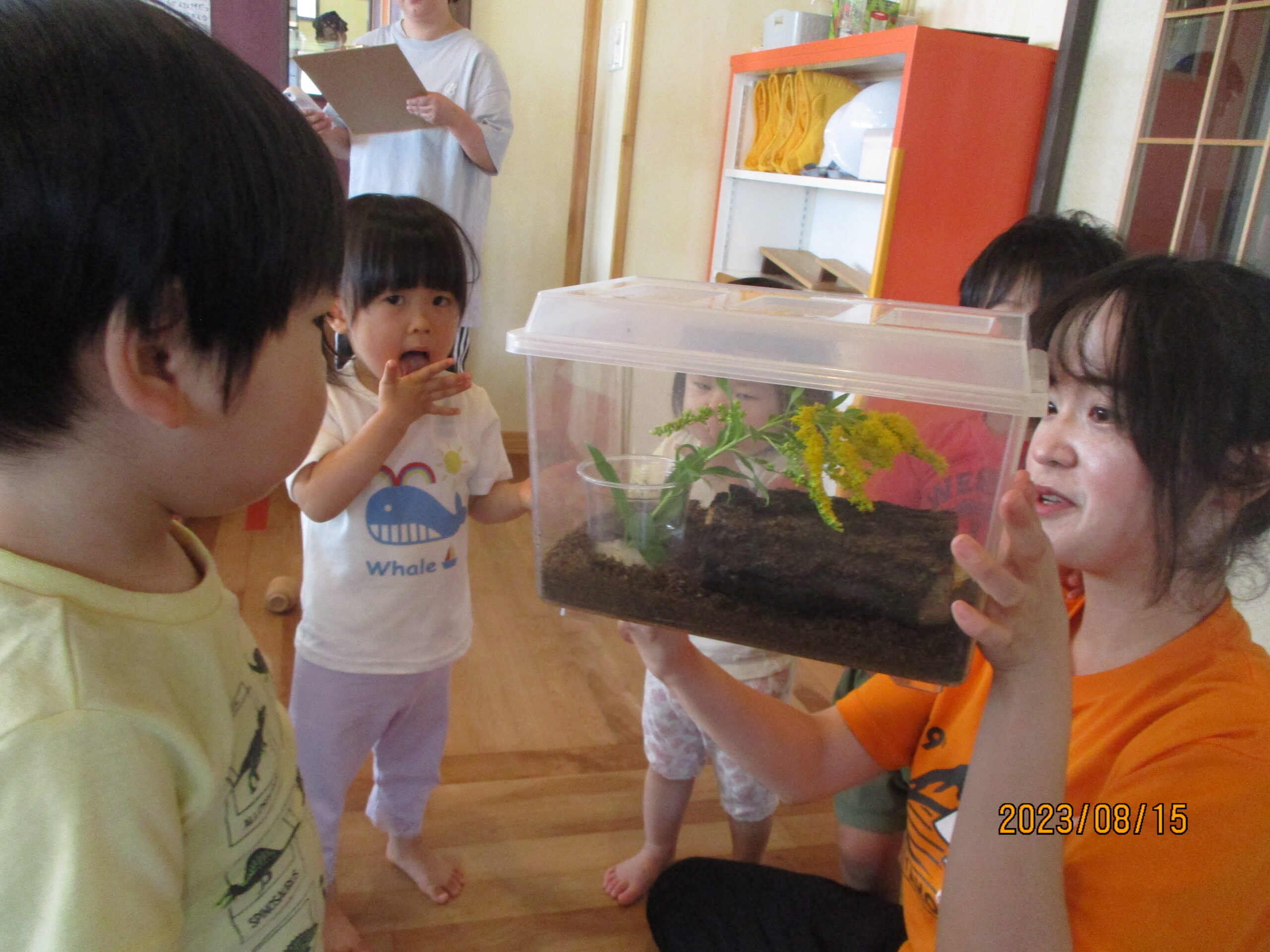 今日も虫さんに挨拶をしてから活動がスタートです。昨日まで、バッタさんとブログに載せていましたが、正式名所は“つゆむし”というそうです。(子どもにとっては通称、バッタさんかもしれません。どちらの名前でもいいことになっています♪)
