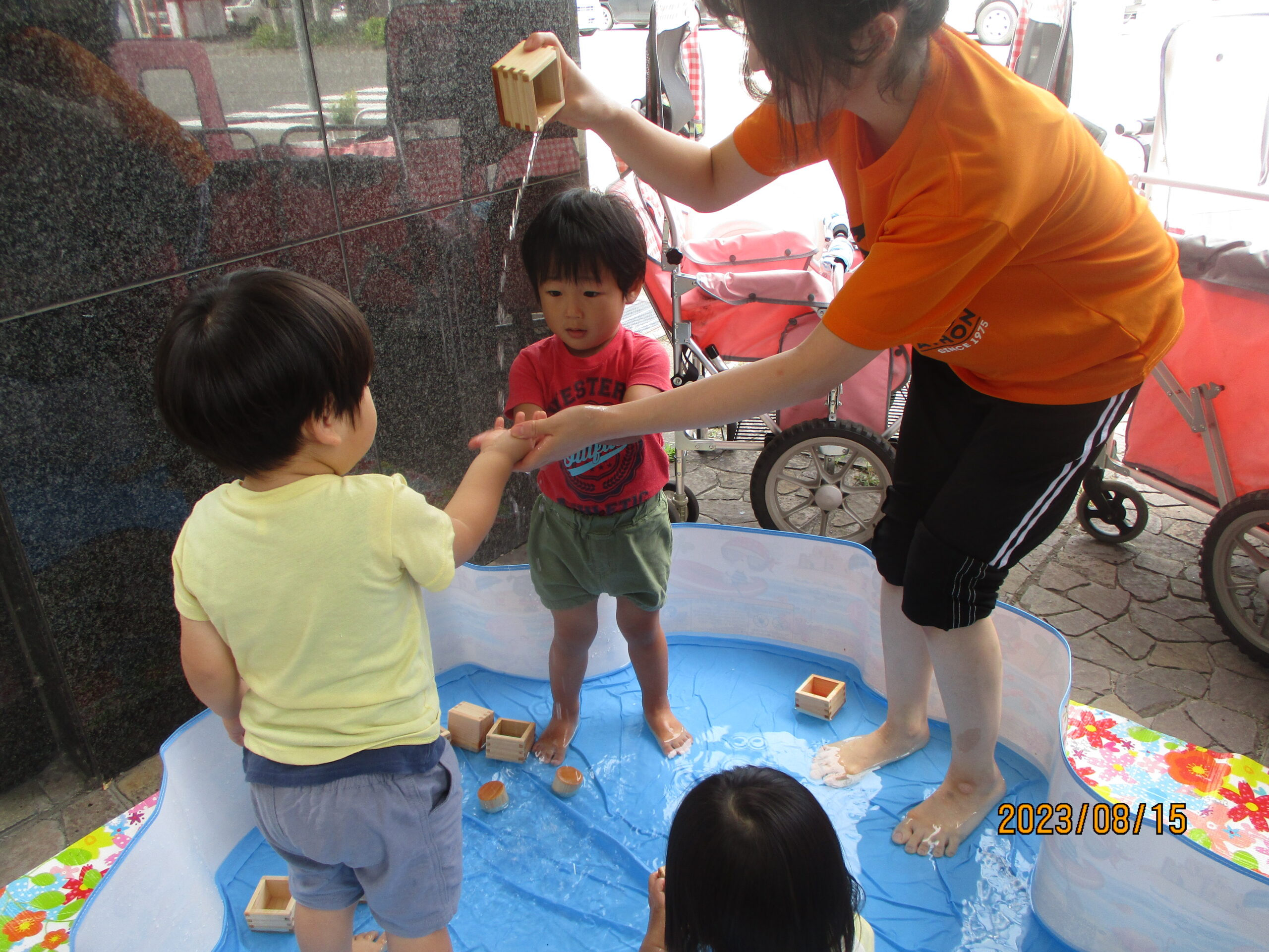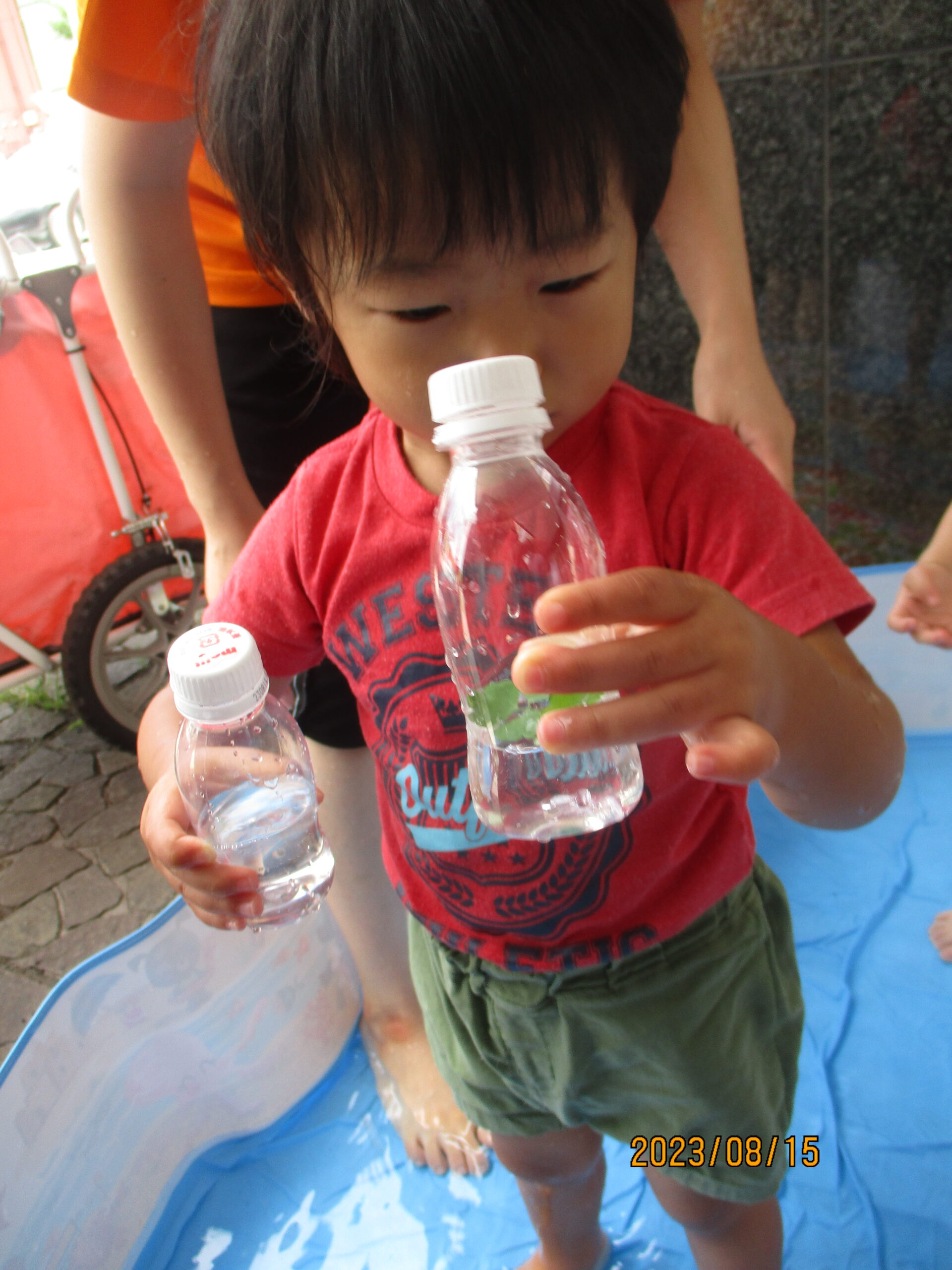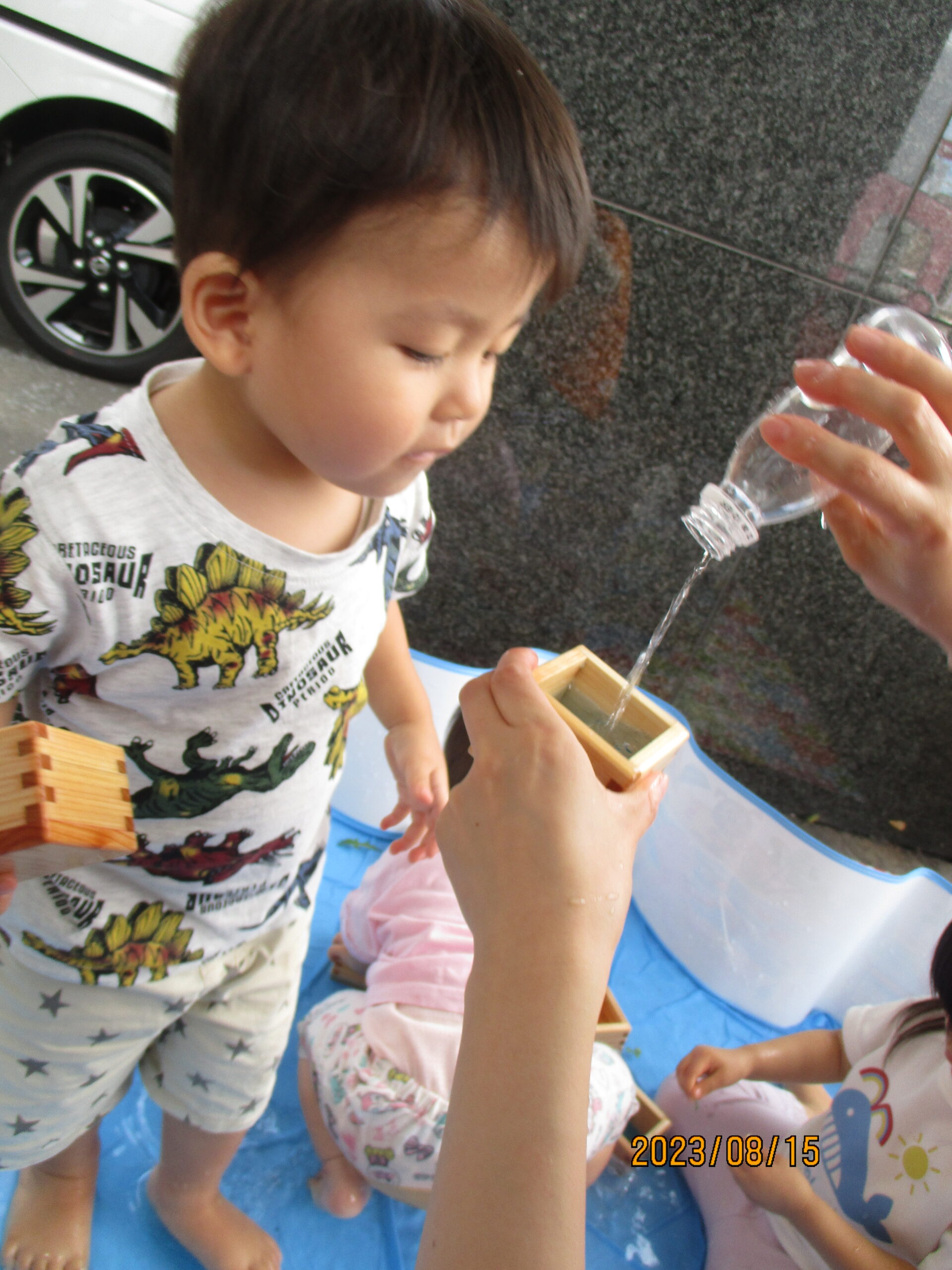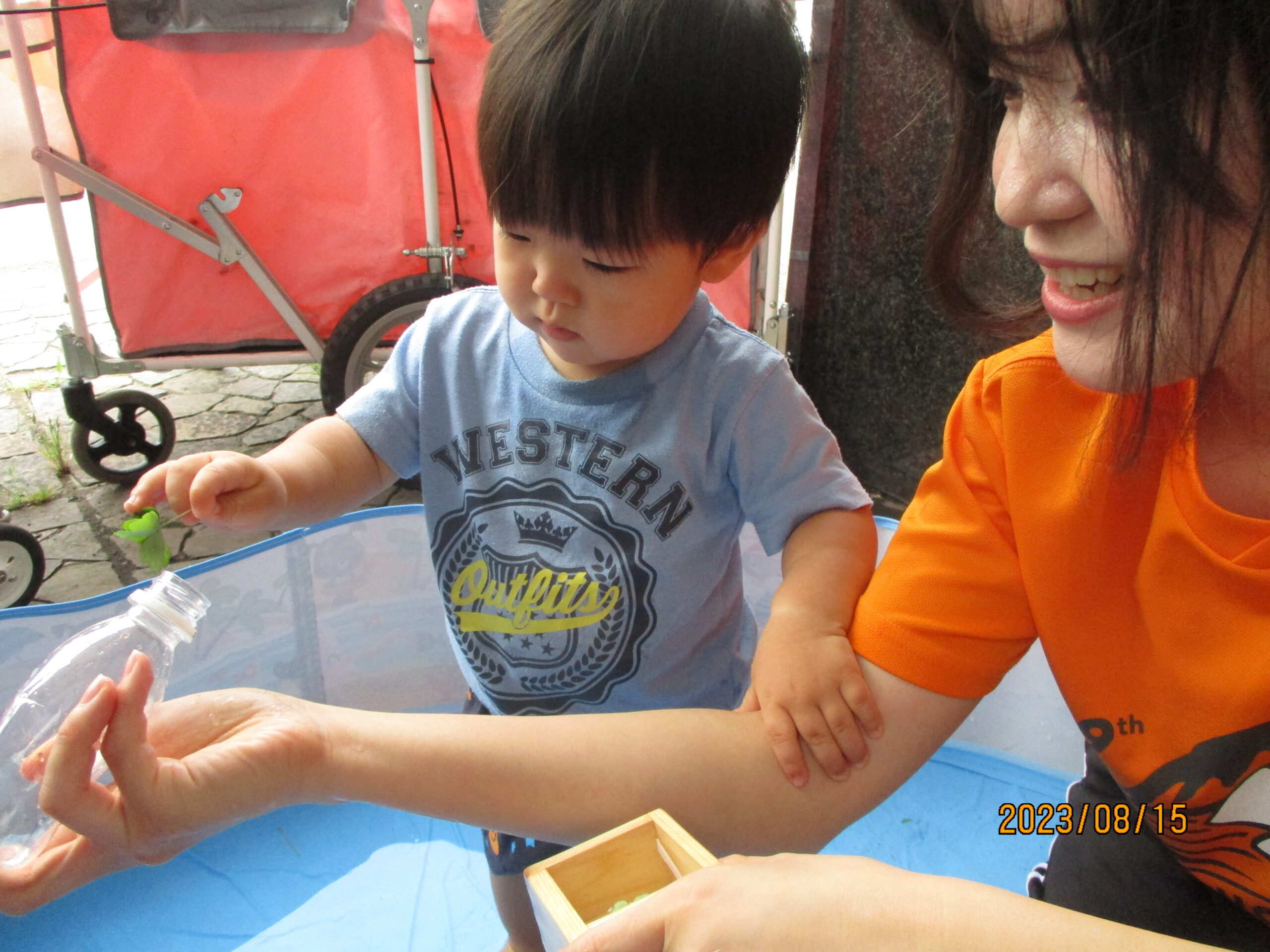 つゆむしさんとの触れ合いのあとは、水遊びです。三つ葉やイチョウの葉を水に浮かべて楽しみました。浮いている葉っぱを指さして、魚など海の生き物に見える子どももいて、想像力が素敵だと感じる場面もありましたよ。