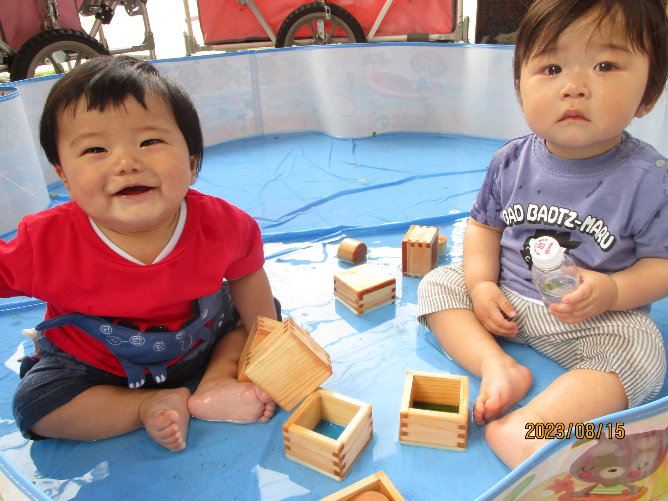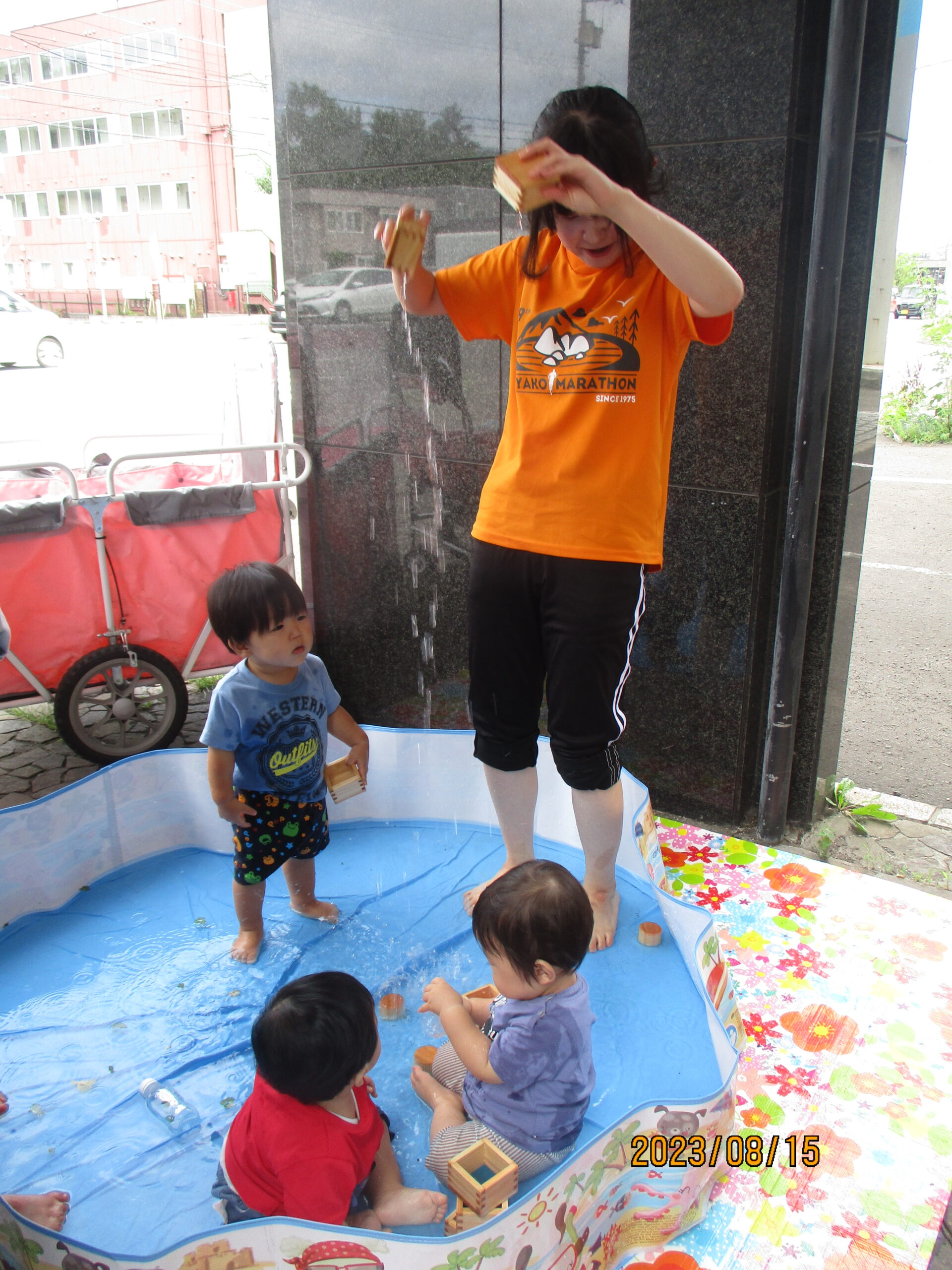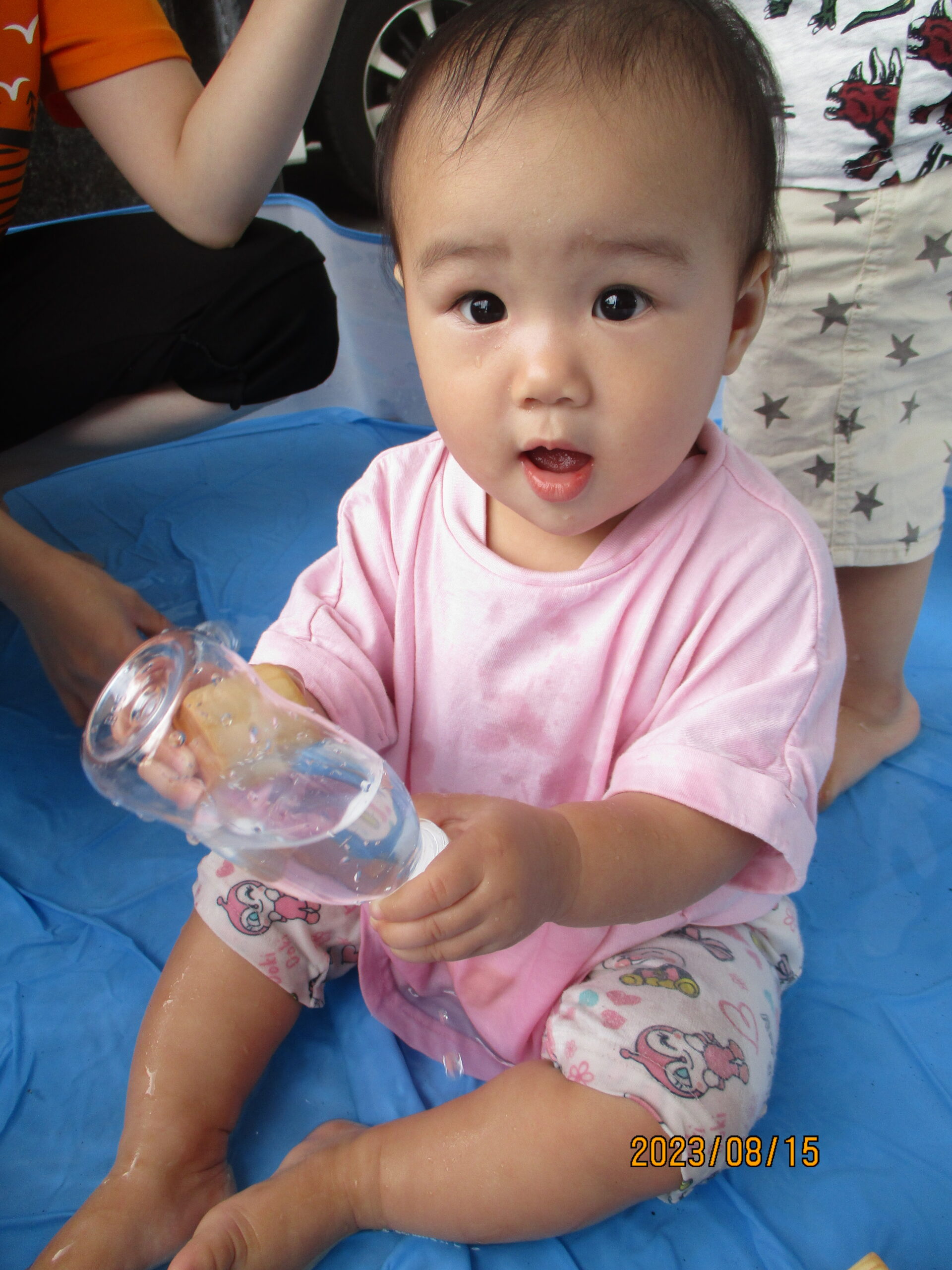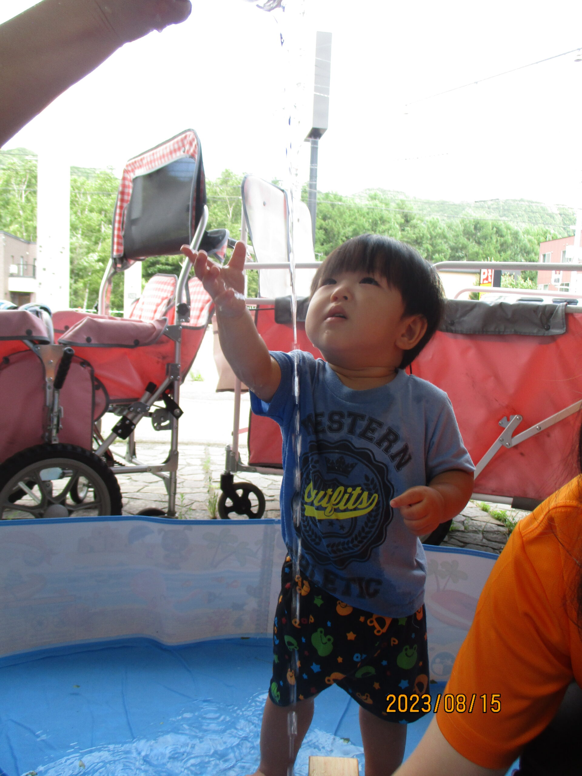 つゆむしさんとの触れ合いのあとは、水遊びです。三つ葉やイチョウの葉を水に浮かべて楽しみました。浮いている葉っぱを指さして、魚など海の生き物に見える子どももいて、想像力が素敵だと感じる場面もありましたよ。