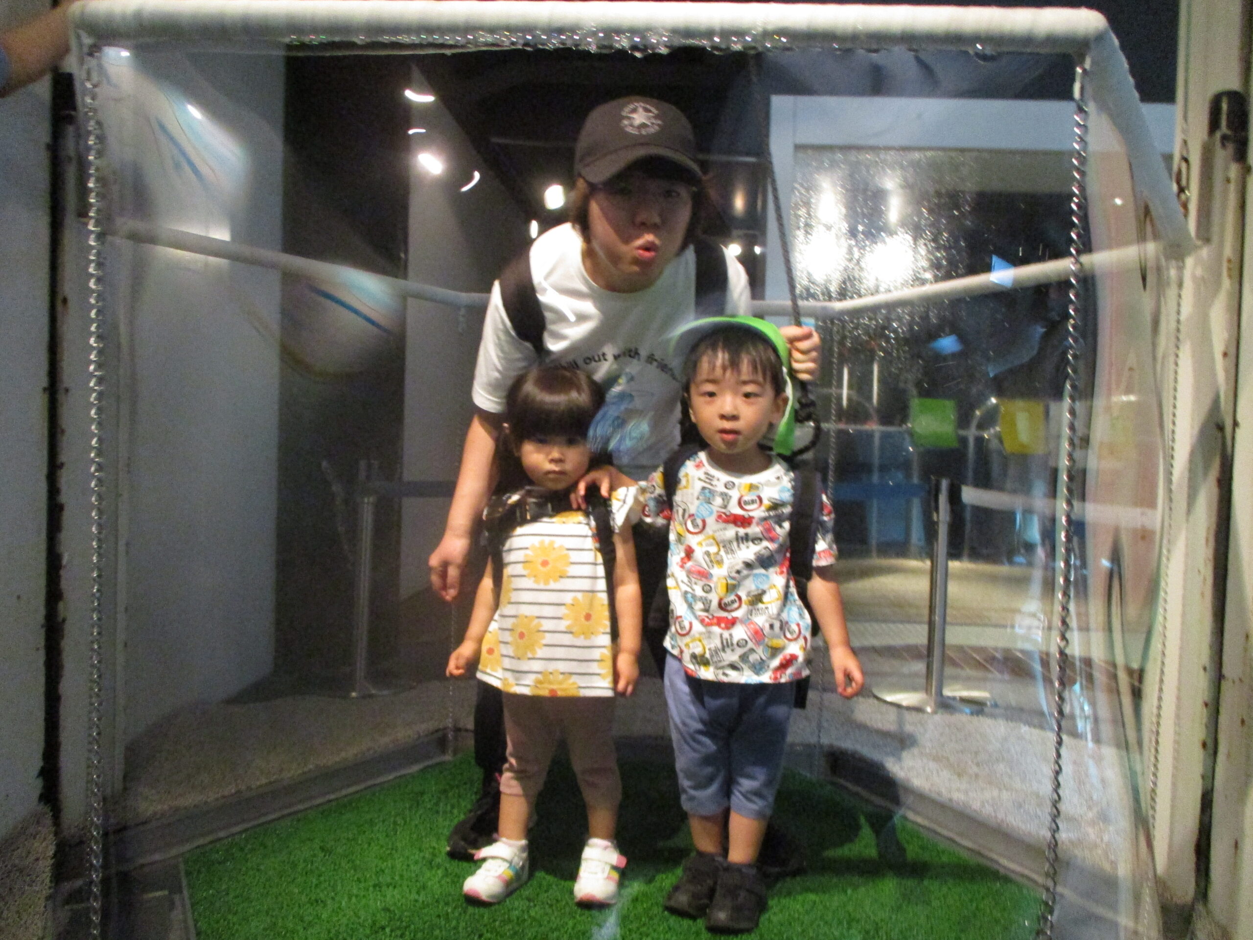 水道記念館では大きなシャボン玉の中に入って不思議体験をしてきました。息を吹きかけるとなみうつところを楽しんでいました。