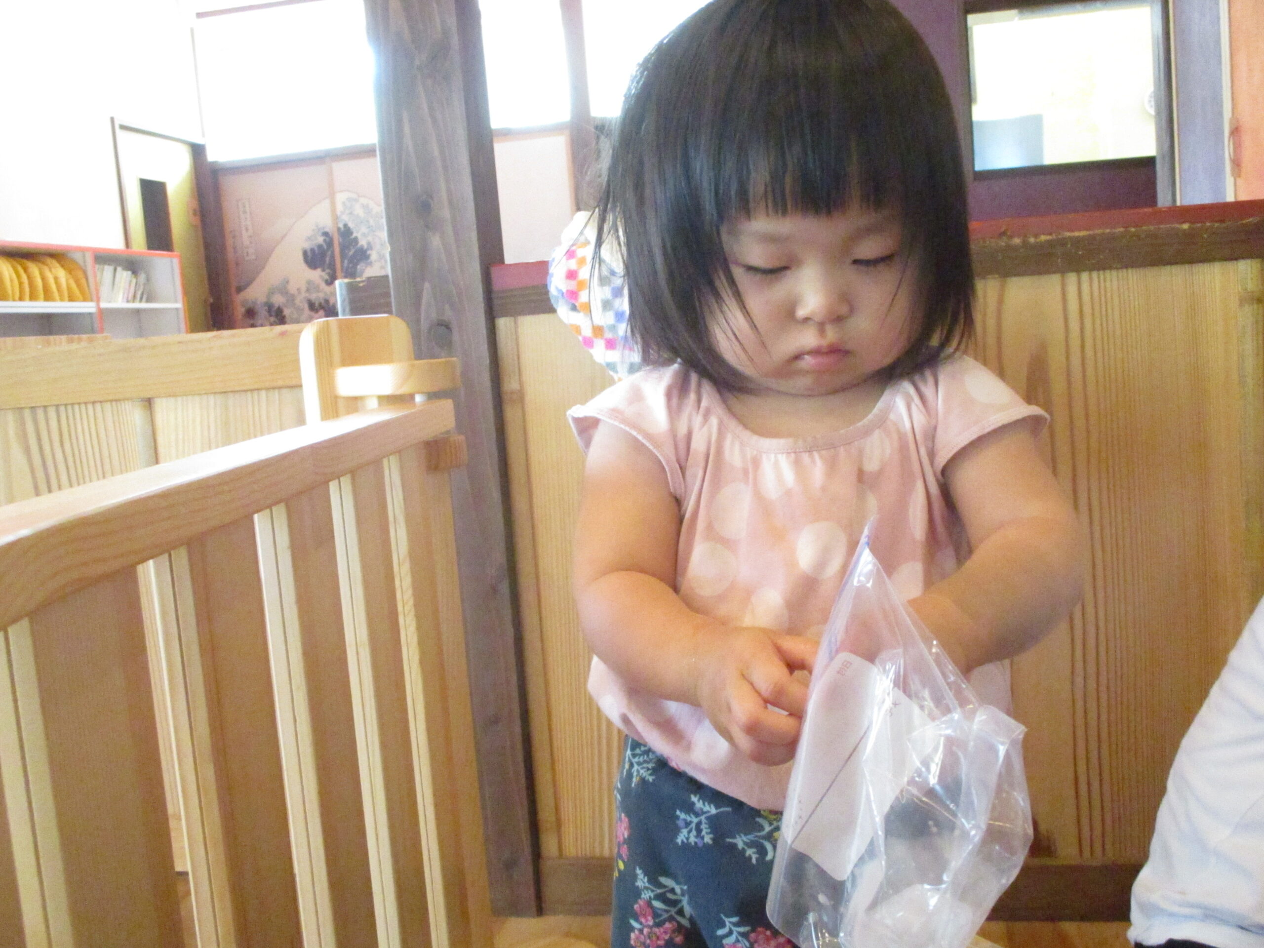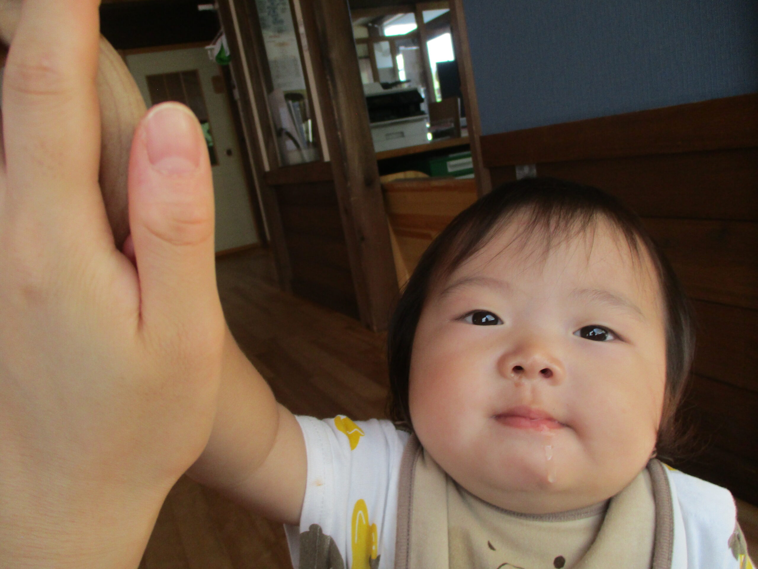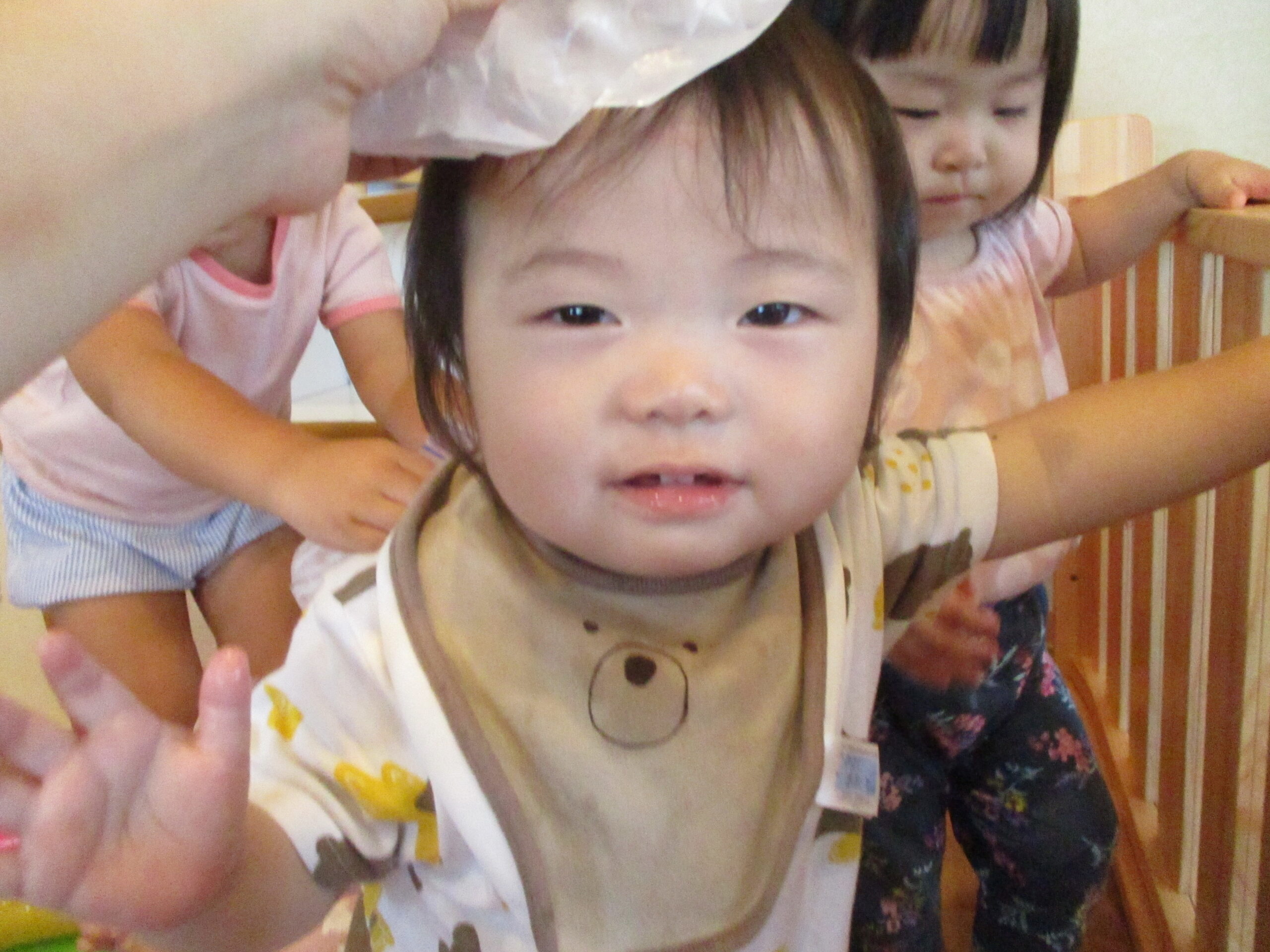 今日も元気いっぱいで一日が始まります。職員の顔を見て、にこにこ。可愛さがあふれていましたよ♪