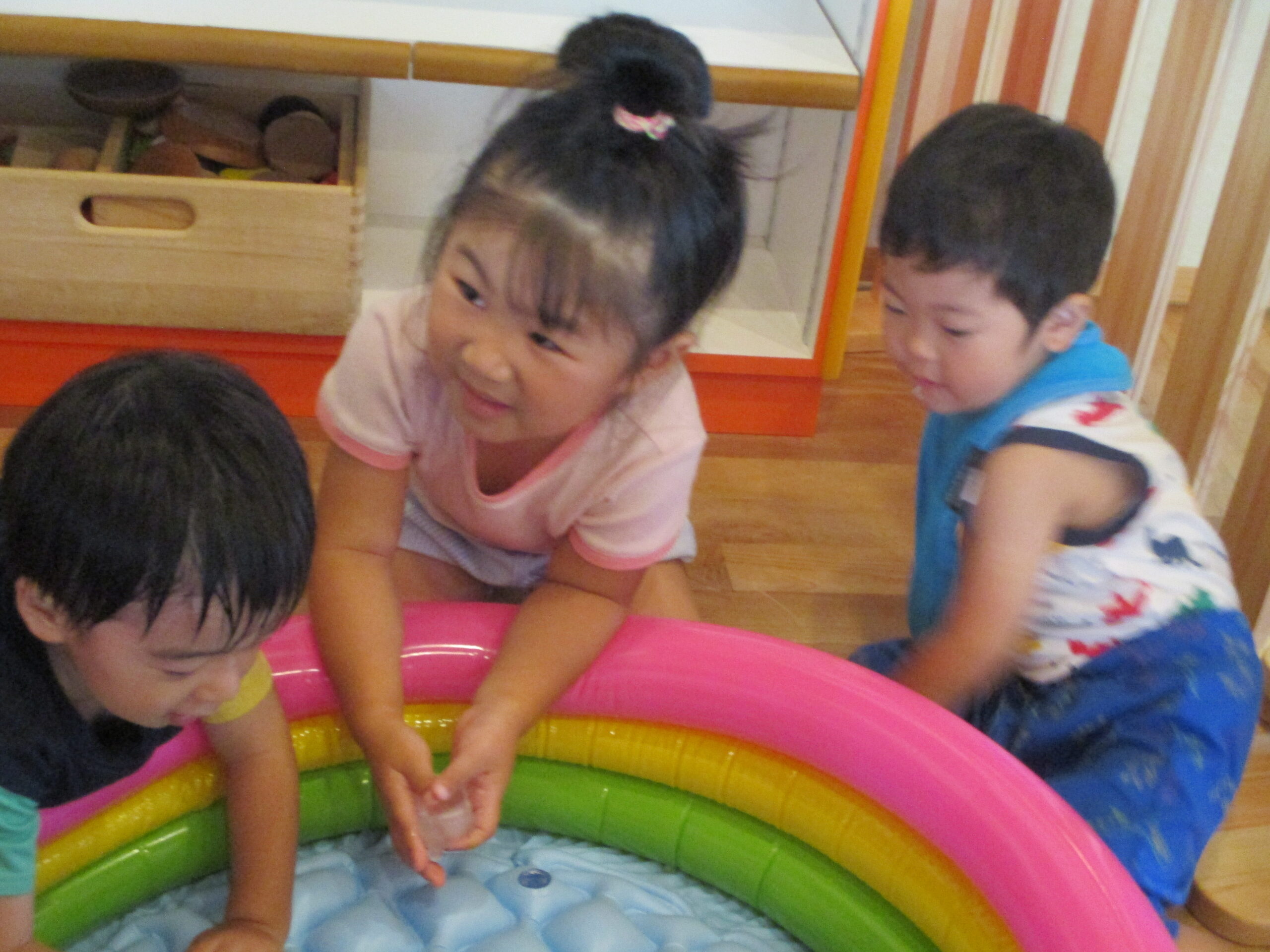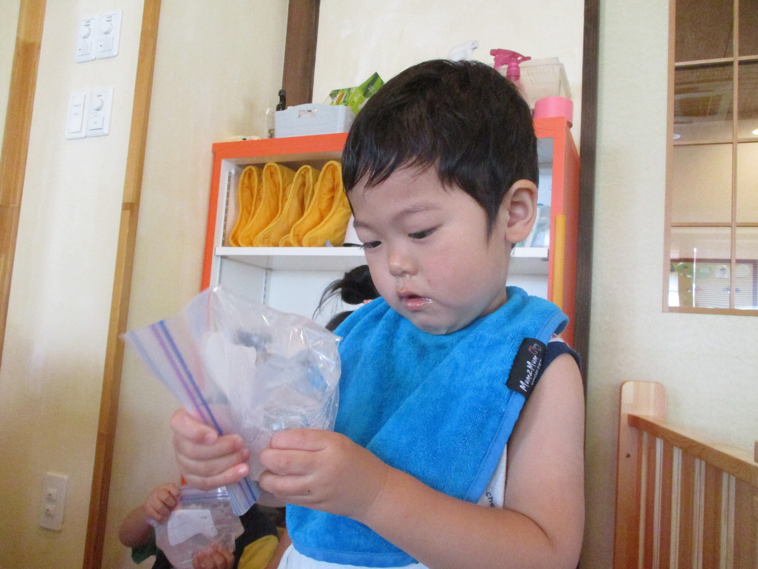今日は、暑かったので、氷で遊びをしました。くるみ組、くり組はプールの中に入っていた氷に触れて職員と一緒に空にかざしてキラキラと光るのを楽しみました。どんぐり組は誤飲に配慮をしてジップロック越しに触りました。