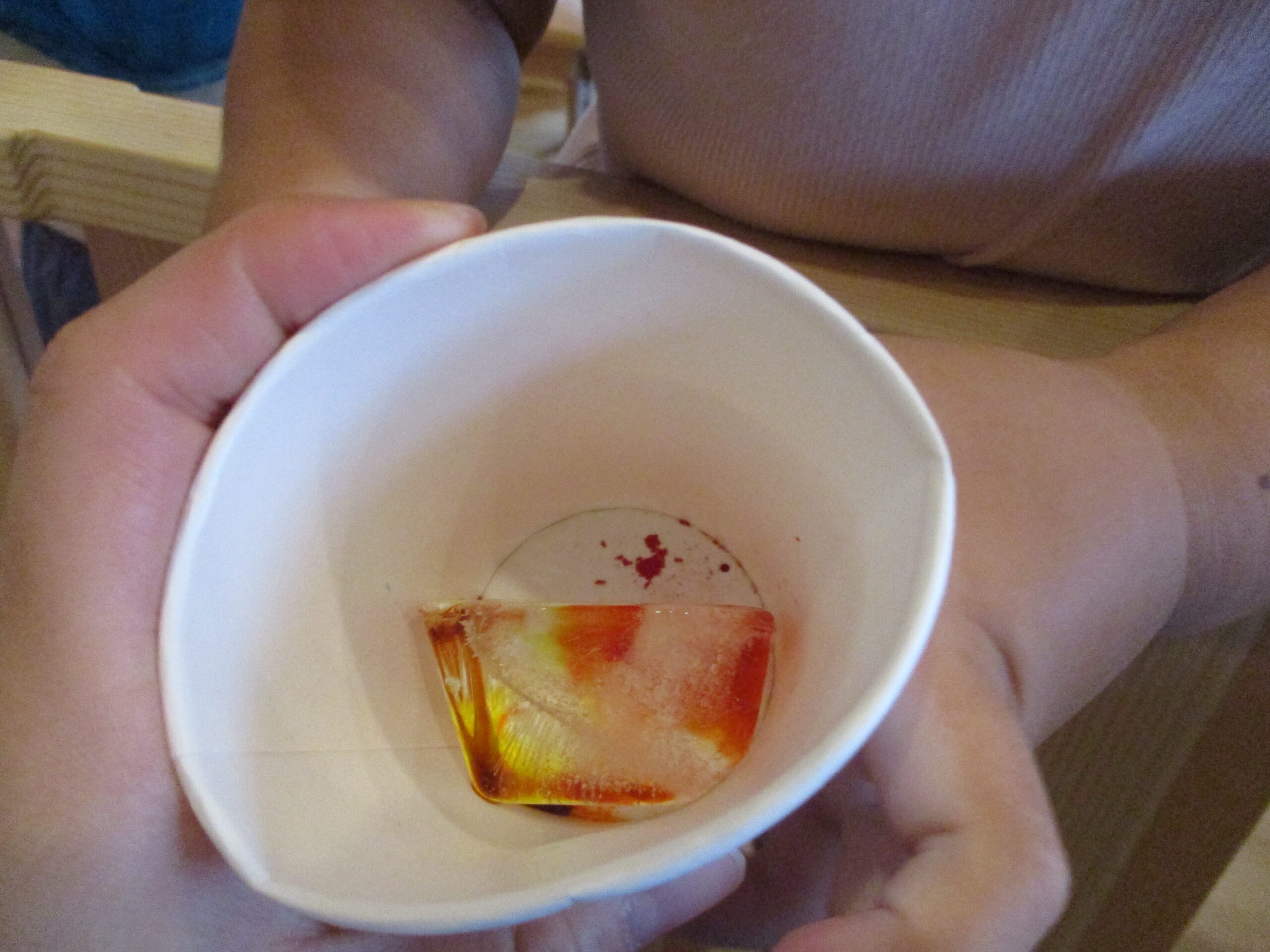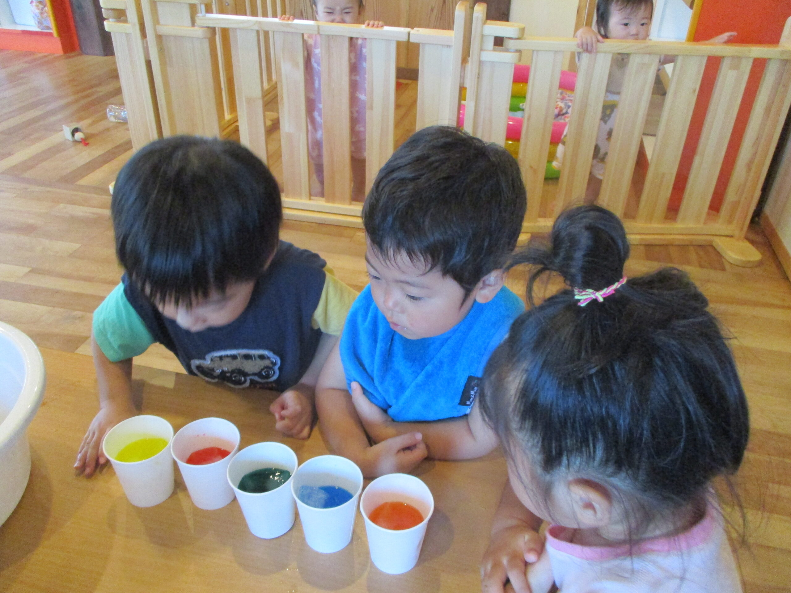 氷に食紅で色を付けました。キラキラと輝いていて綺麗な仕上がりでした。また氷をつかった涼しい遊びを取り入れて子ども達とたくさん楽しんでいきたいと思います。