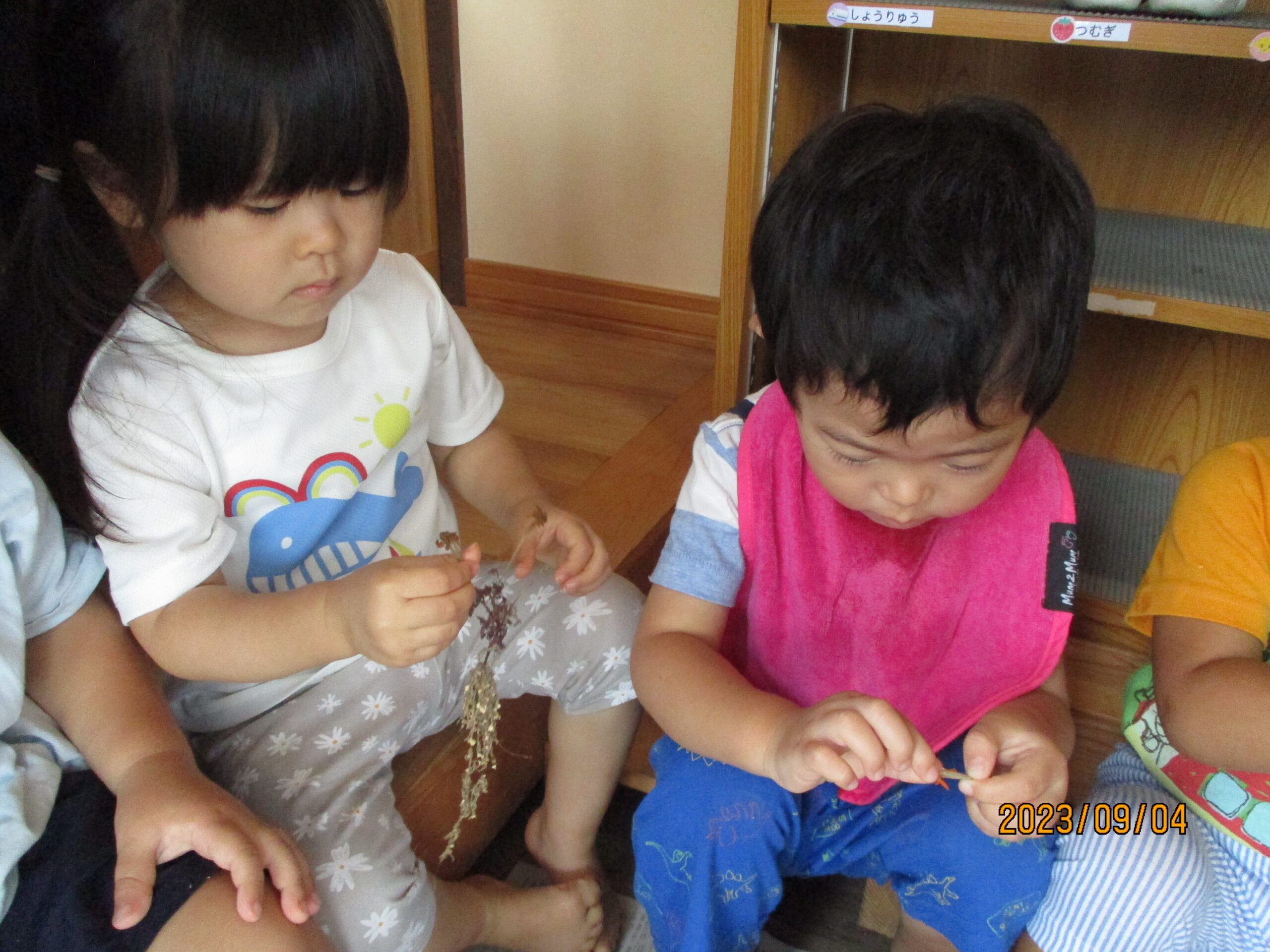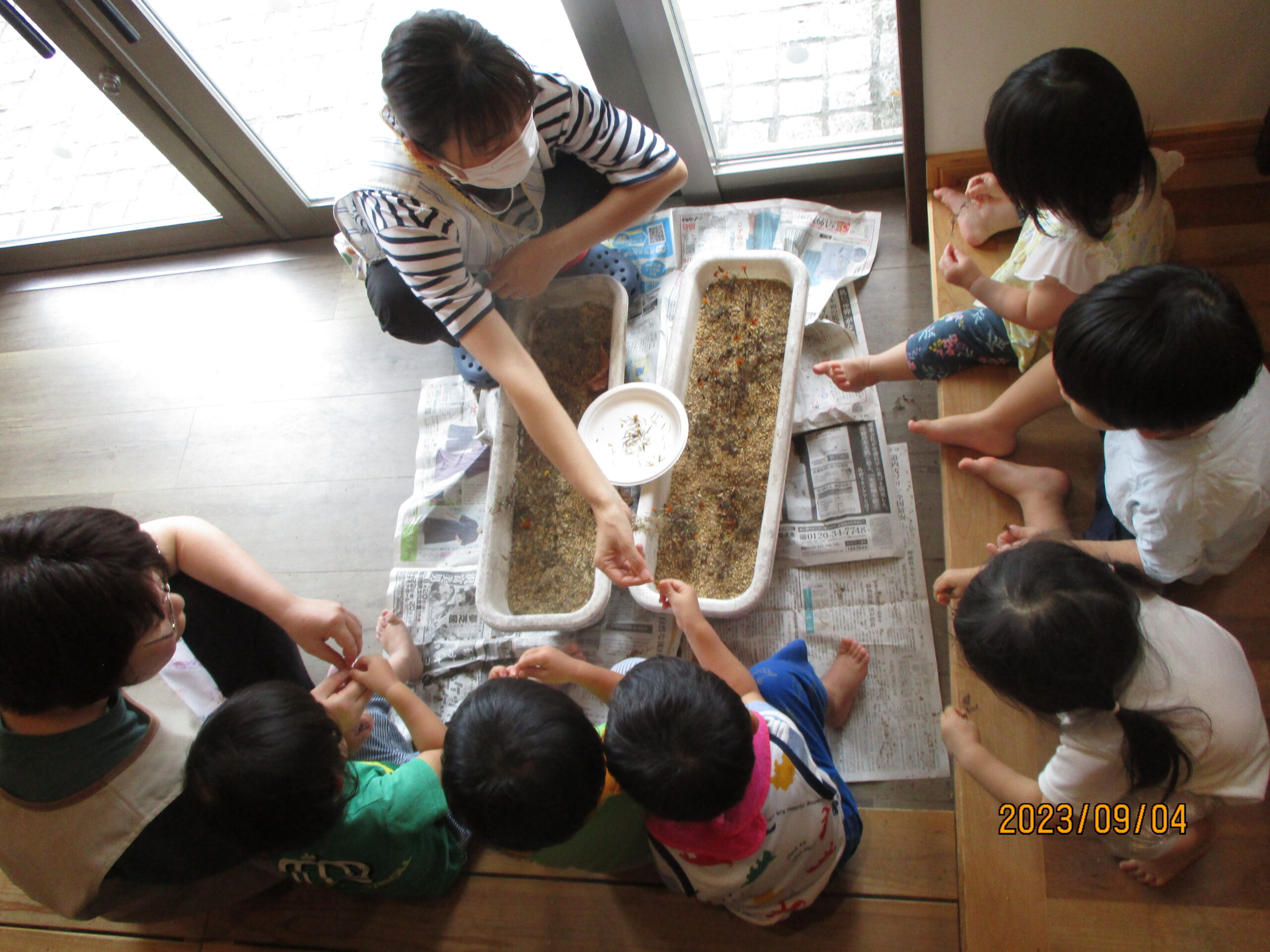 今日はくり組くるみ組さんで、今年皆で植えたマリーゴールドの種を収穫しました。やる前にやり方を見てから挑戦。少し難しそうでしたが、一生懸命収穫していました。