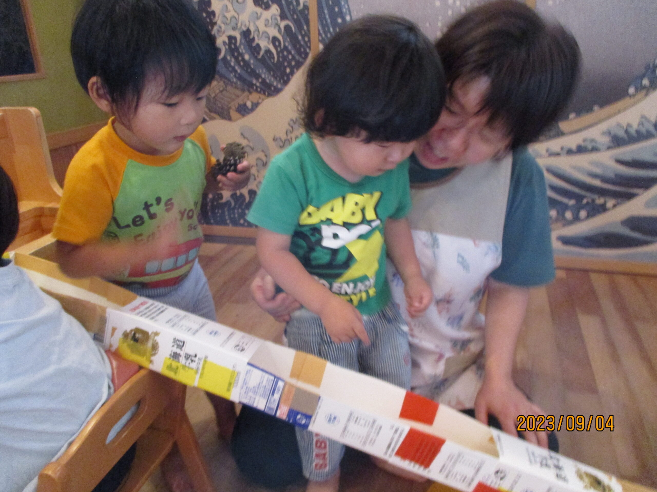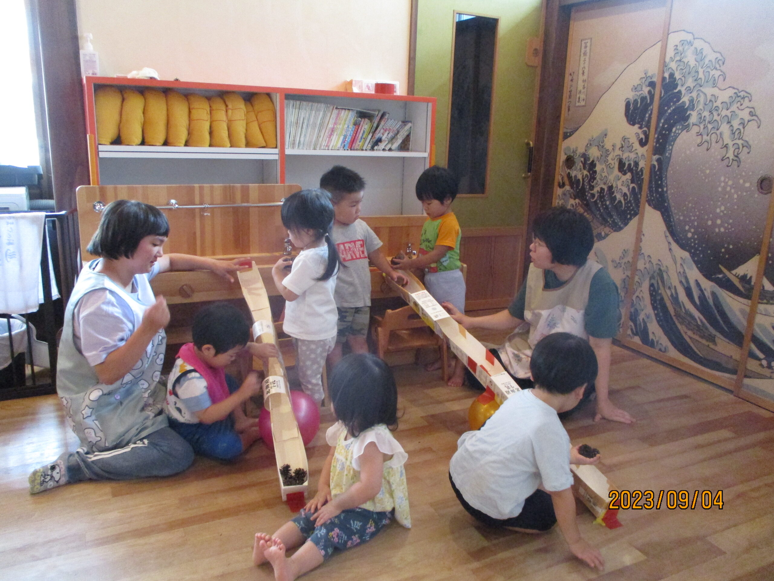 種を収穫した後は、松ぼっくりとどんぐりを転がして遊びました。レールを出すとさっそく転がして楽しんでいました。