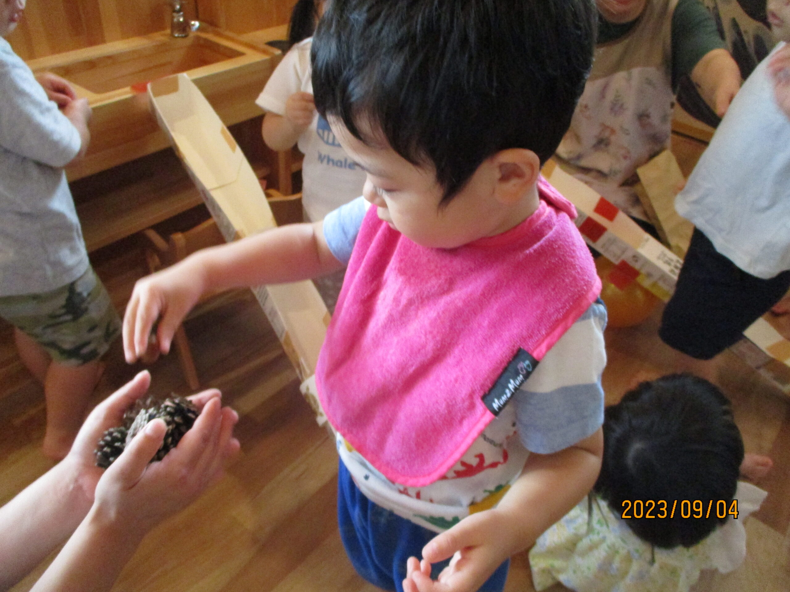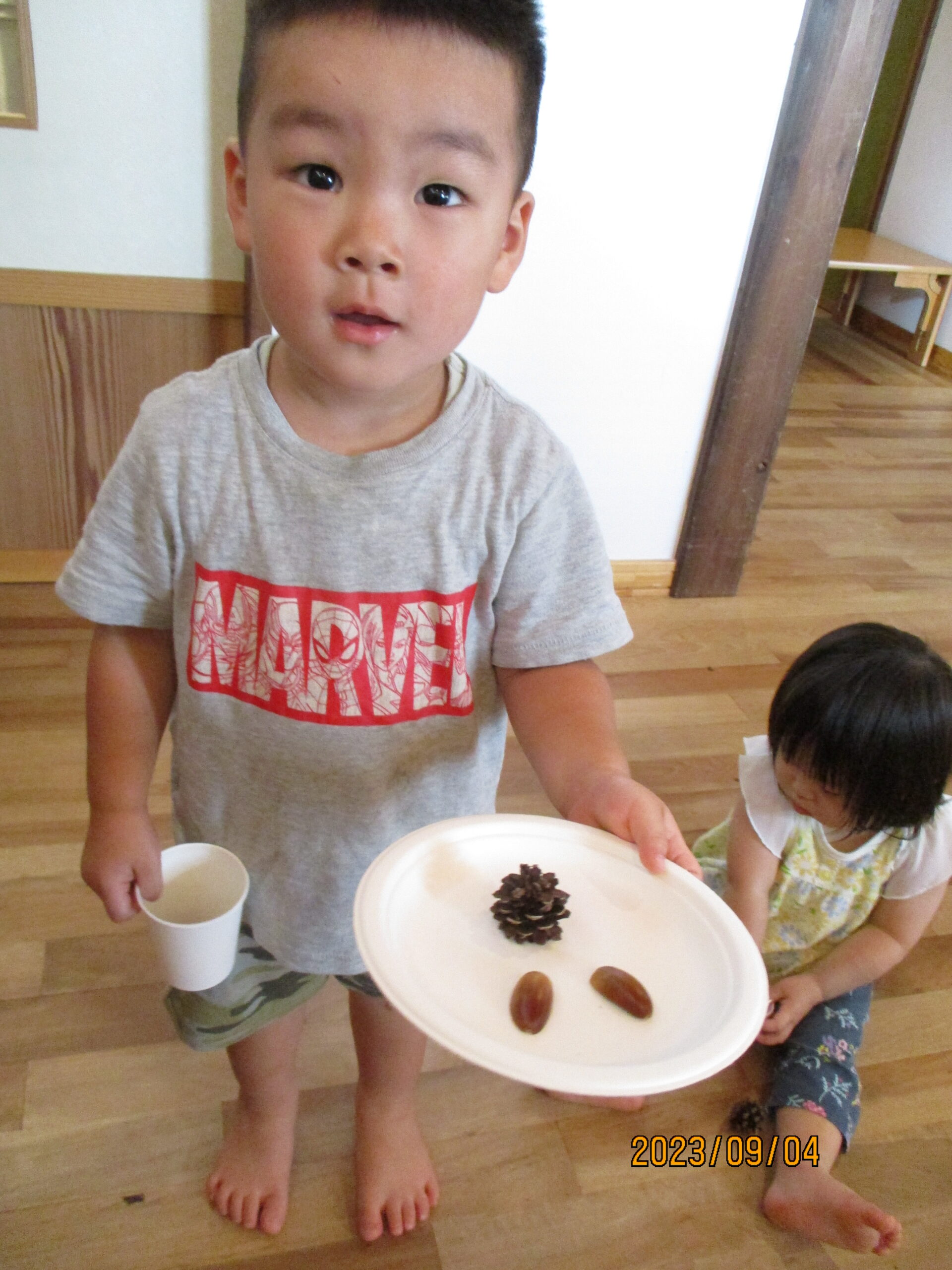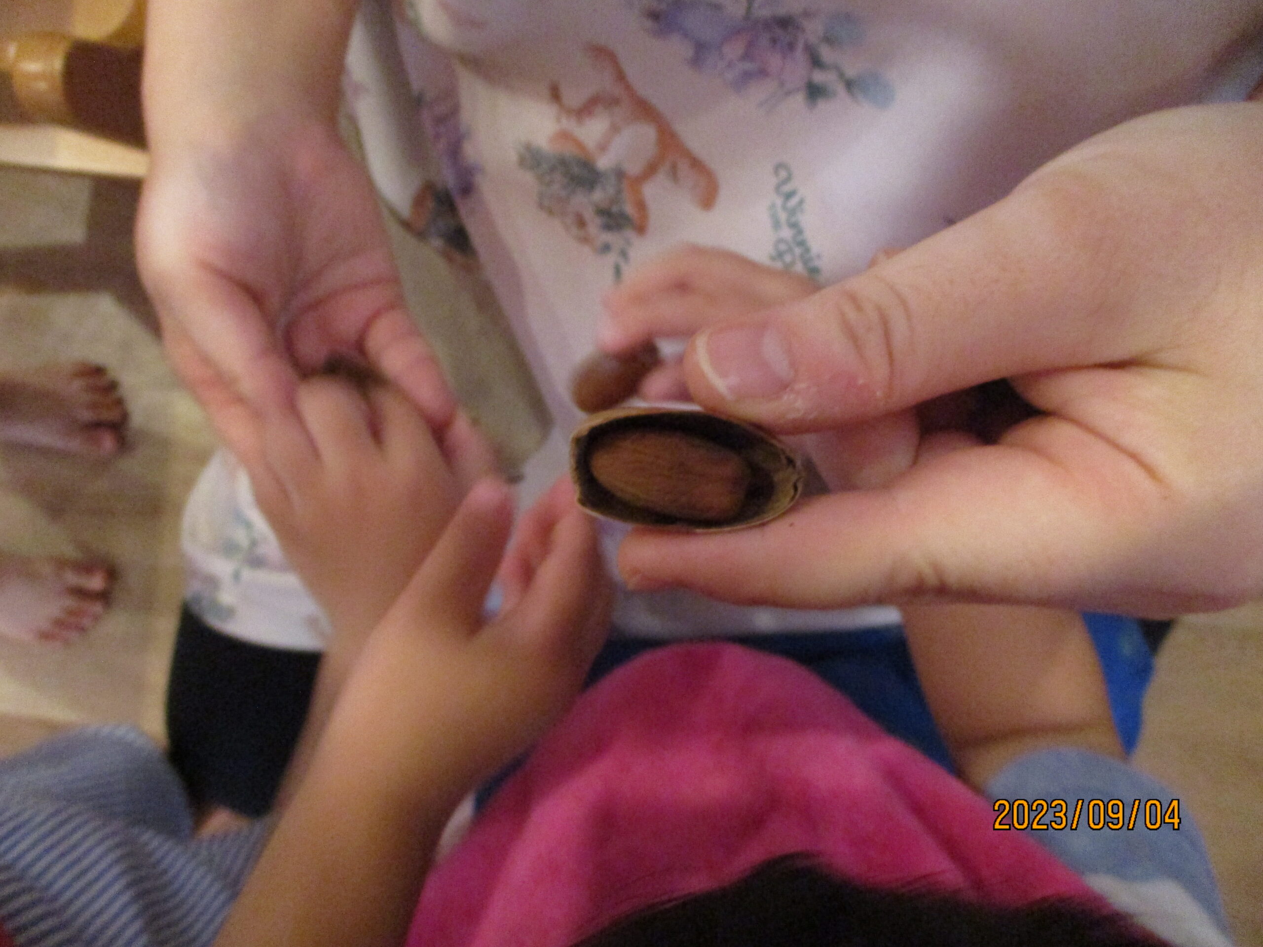 遊んでいるとどんぐりのからがら割れていたので、中に何があるか見てみることに。中には、硬い茶色の実が入っていて皆興味津々でした。