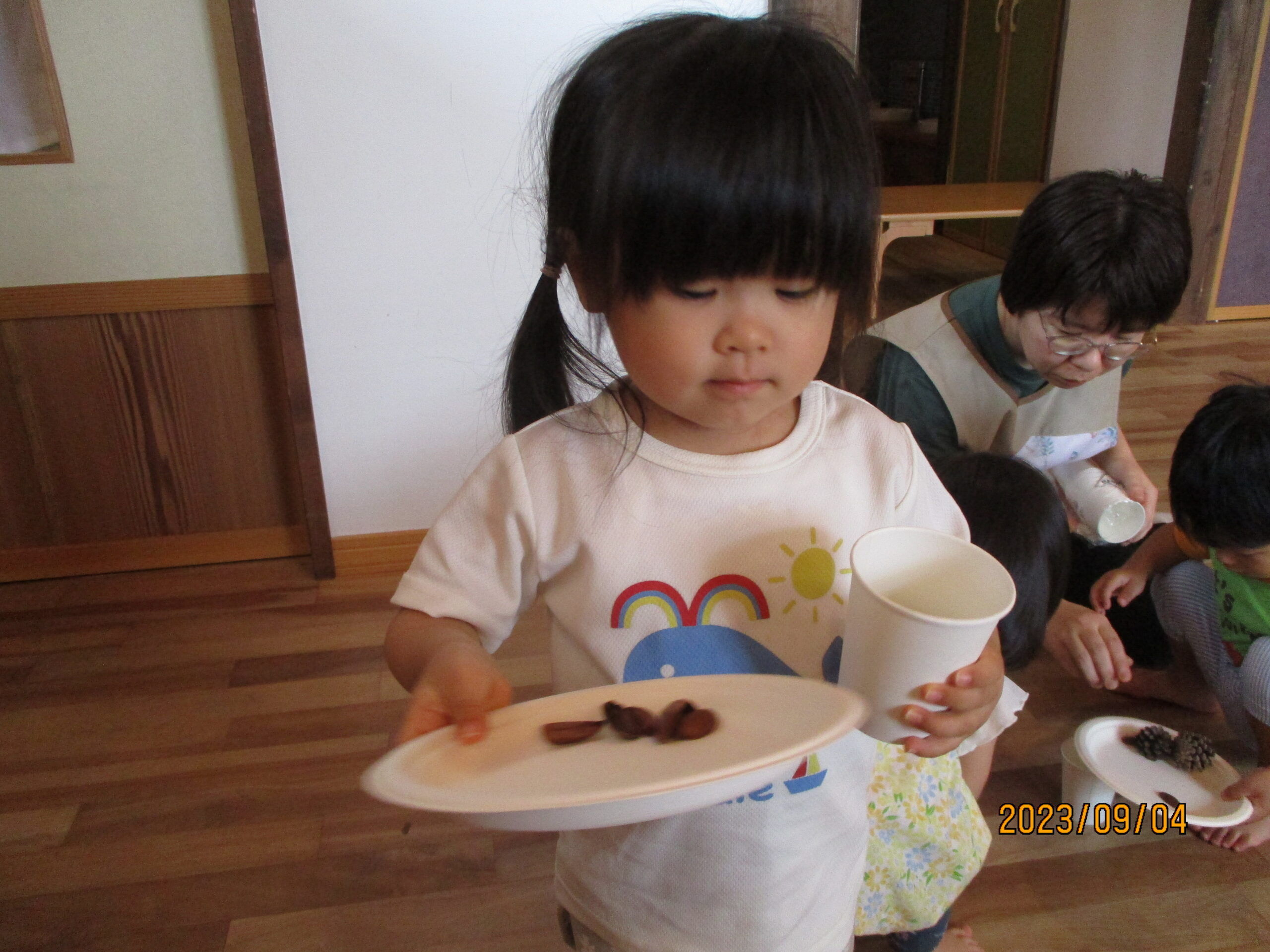 紙皿や紙コップにどんぐりや松ぼっくりを乗せたり入れてご飯作りもしていました。