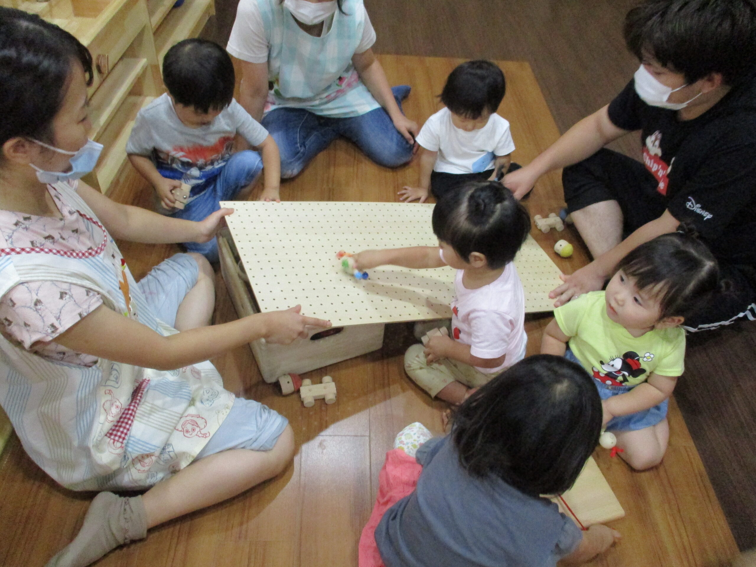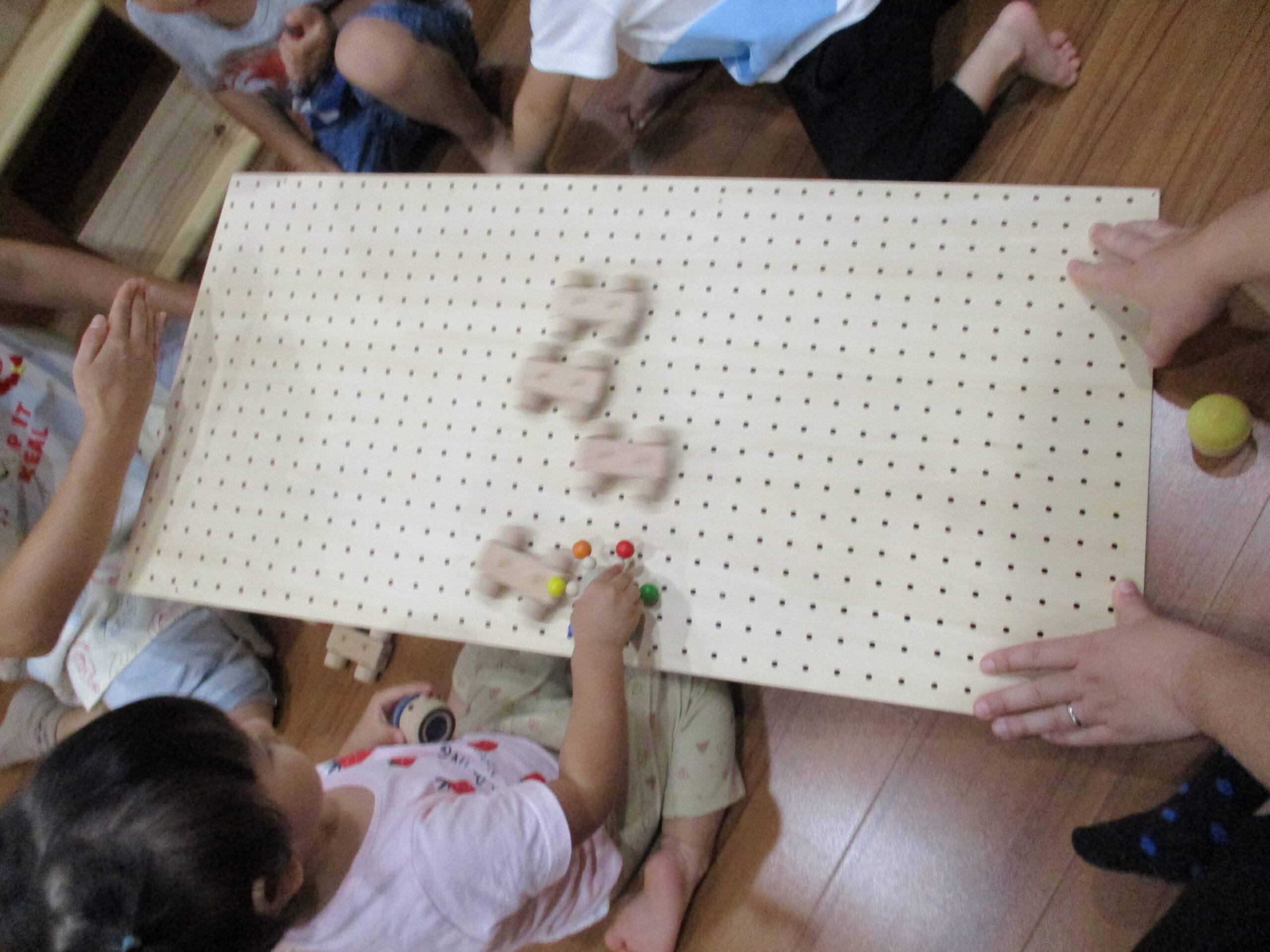 木育こどもの家には、きのこにビー玉がついていて、坂でカタカタ落ちていく可愛いおもちゃがあります。 でも、きのこは3個・・一人が小さい坂で遊び始めると、僕も!私も!と取り合いに・・