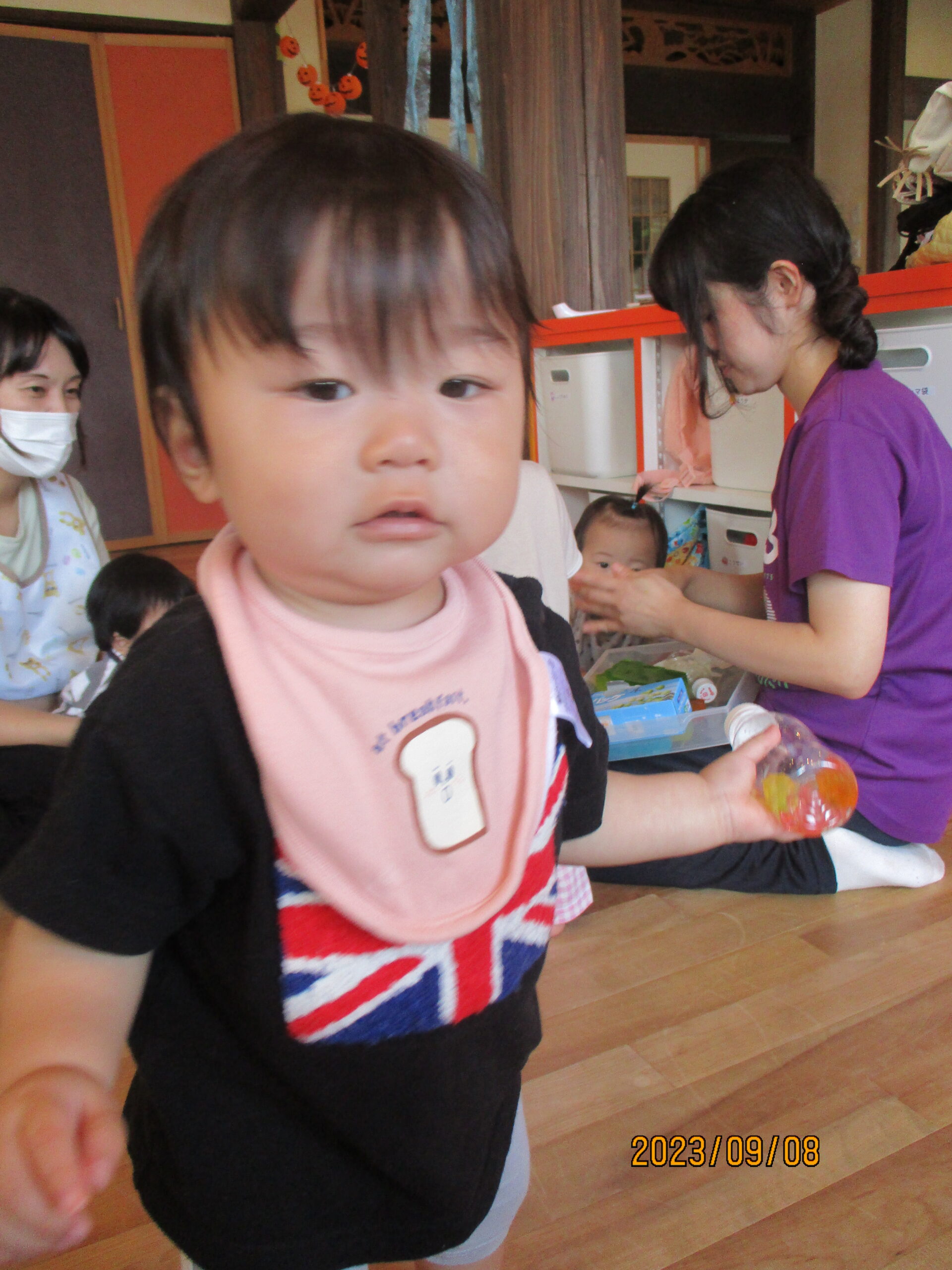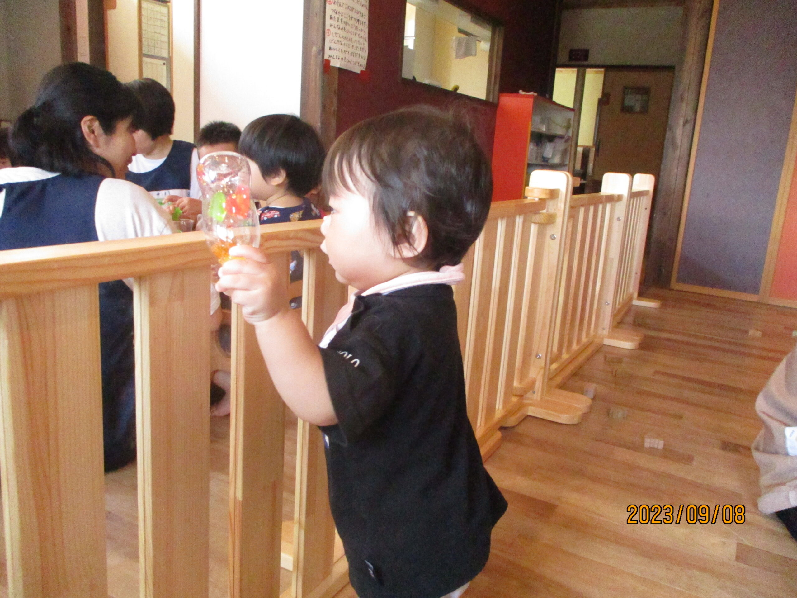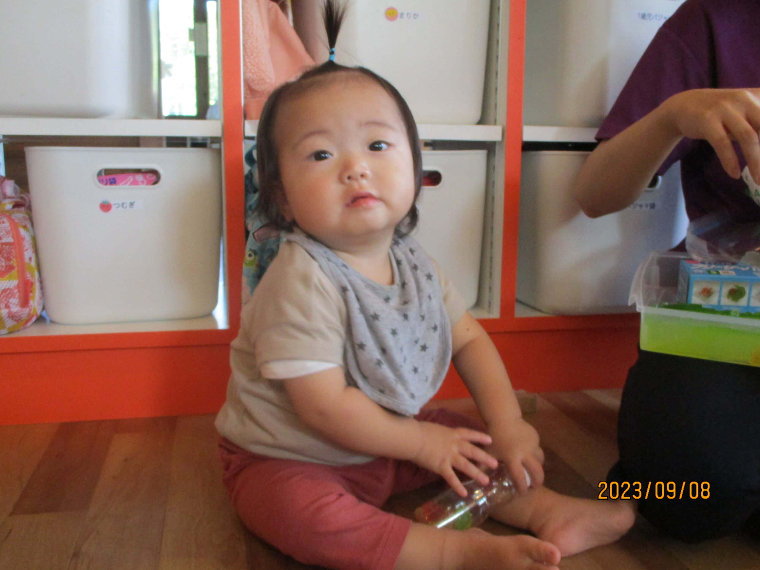 8日金曜は、様々な色の寒天で遊びました。どんぐり組では、誤飲が起きないように職員がペットボトルやジップロックに入れて容器から感じる冷たさや、振って小さくなる寒天を楽しみましたよ。