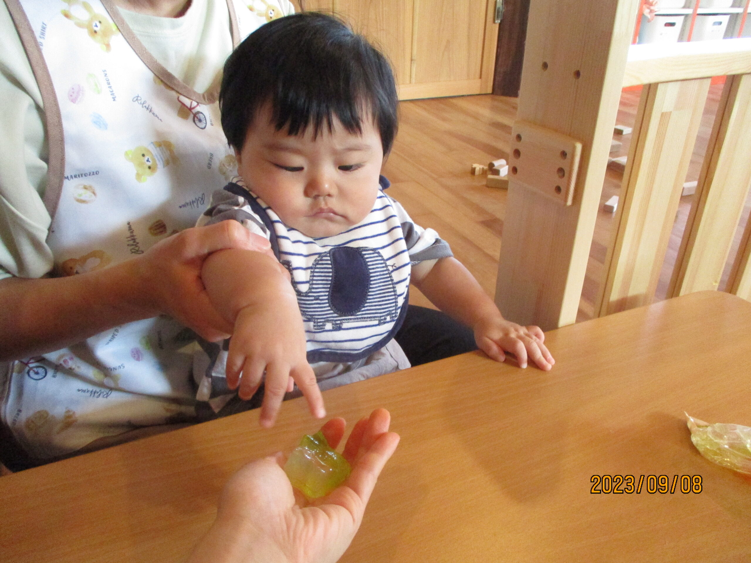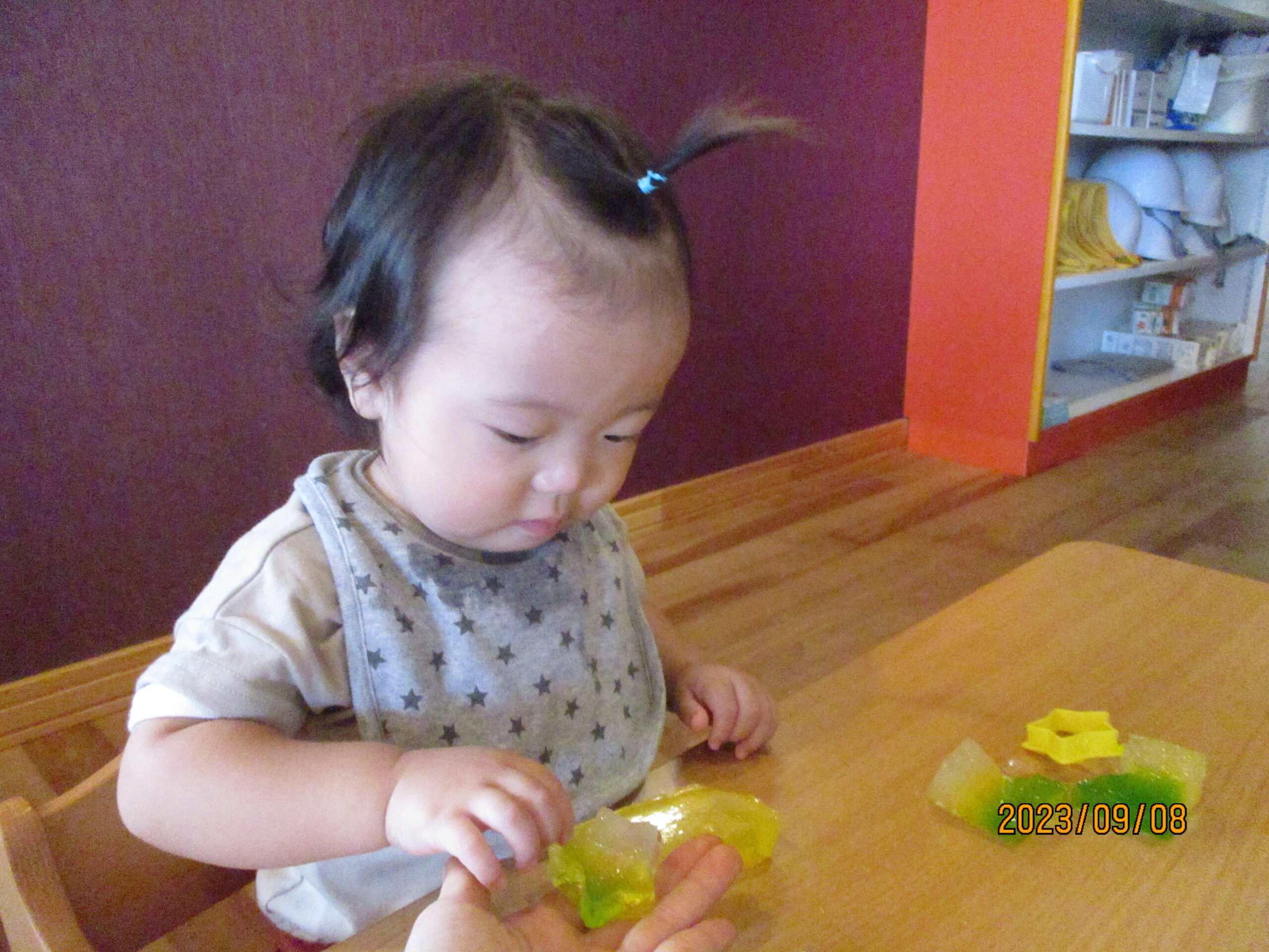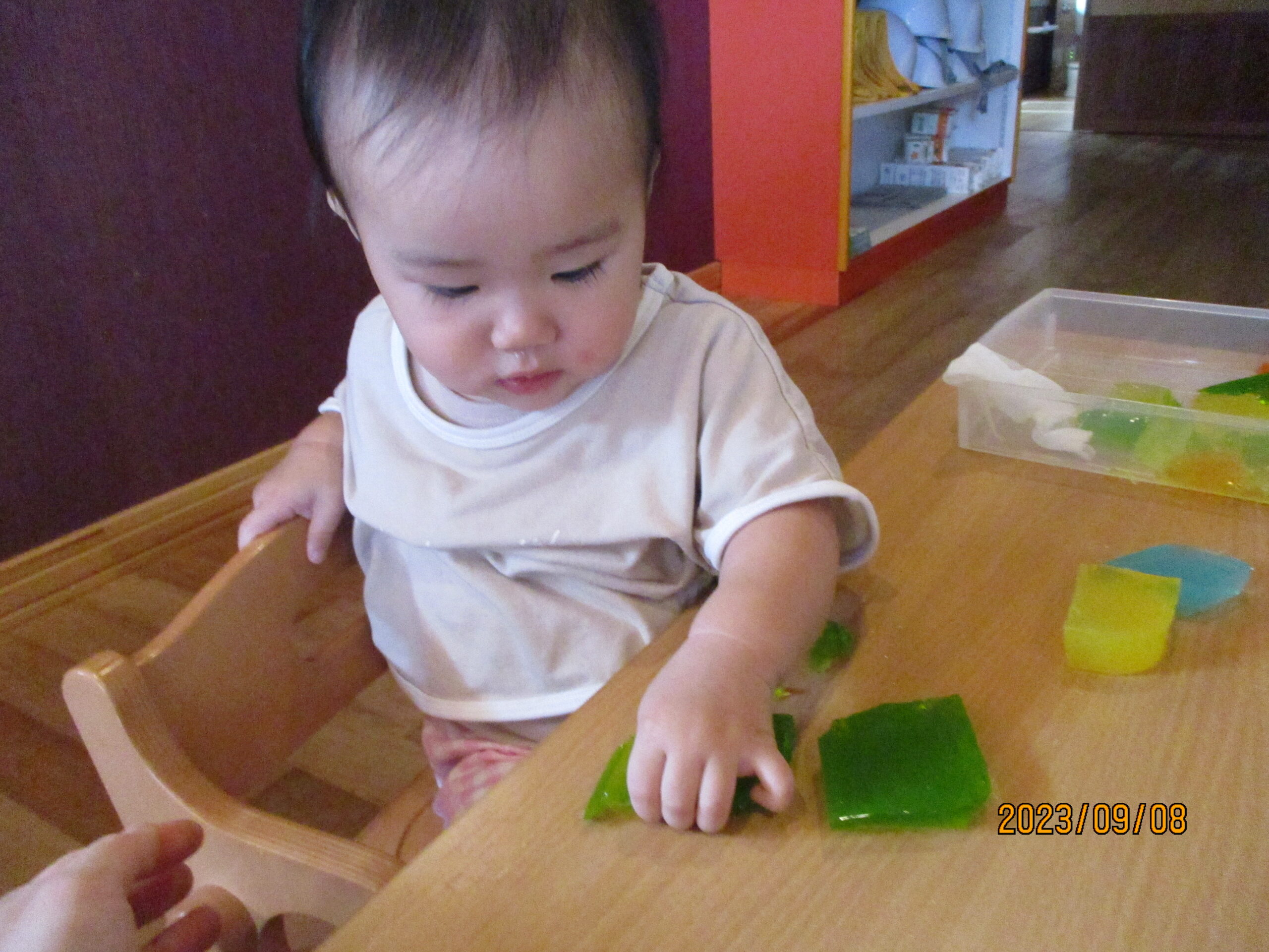 ひとりずつ、口に入らないように個別で職員がついて寒天に触るコーナーをつくりました。子ども達は、キラキラと光る寒天に夢中です。